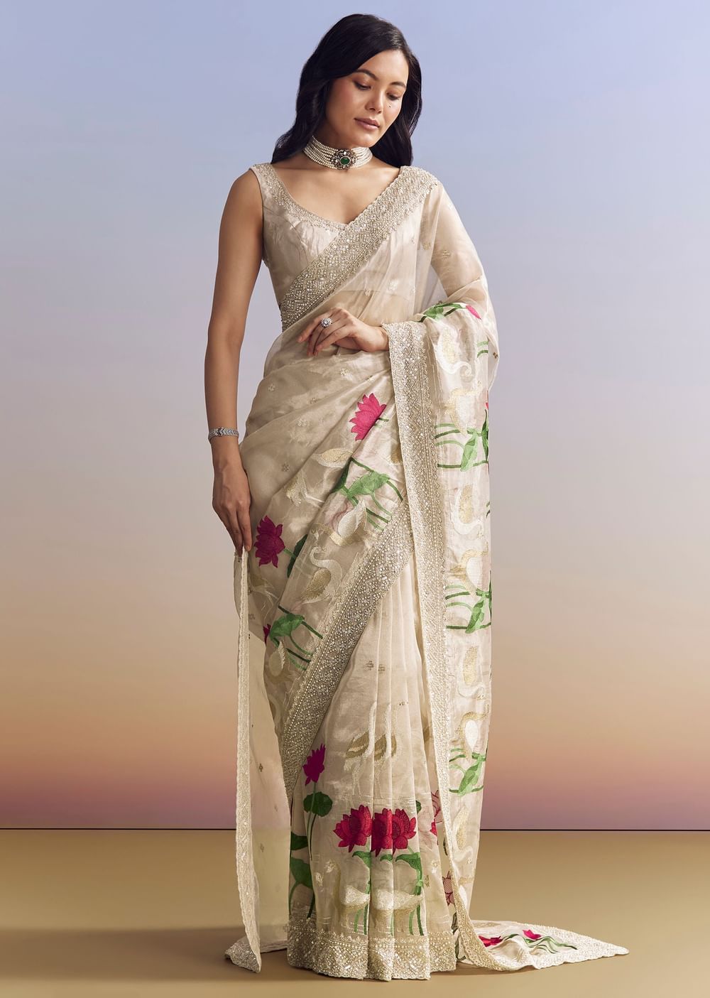 Silver Tissue Saree With Intricate Resham Work And Embroidered Border