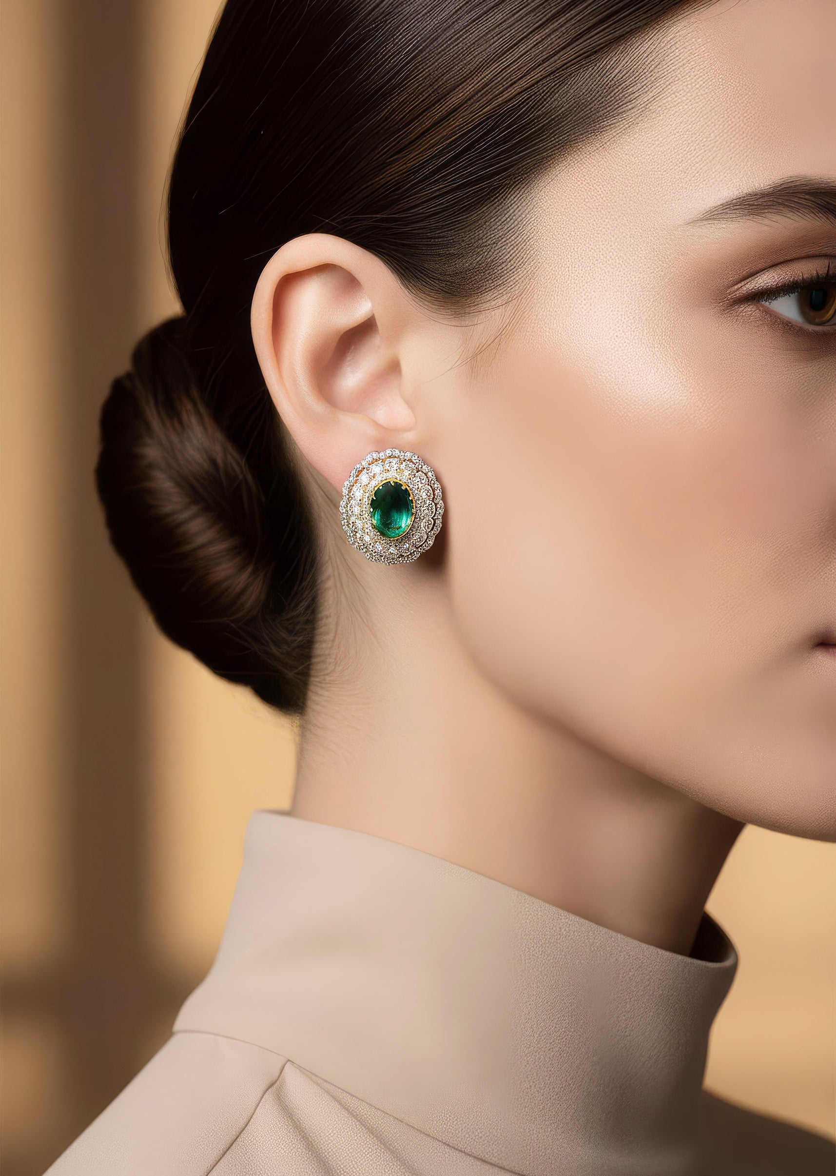: Pair them with a silver grey or emerald outfit to complement the green centre stone and sparkling tiers.