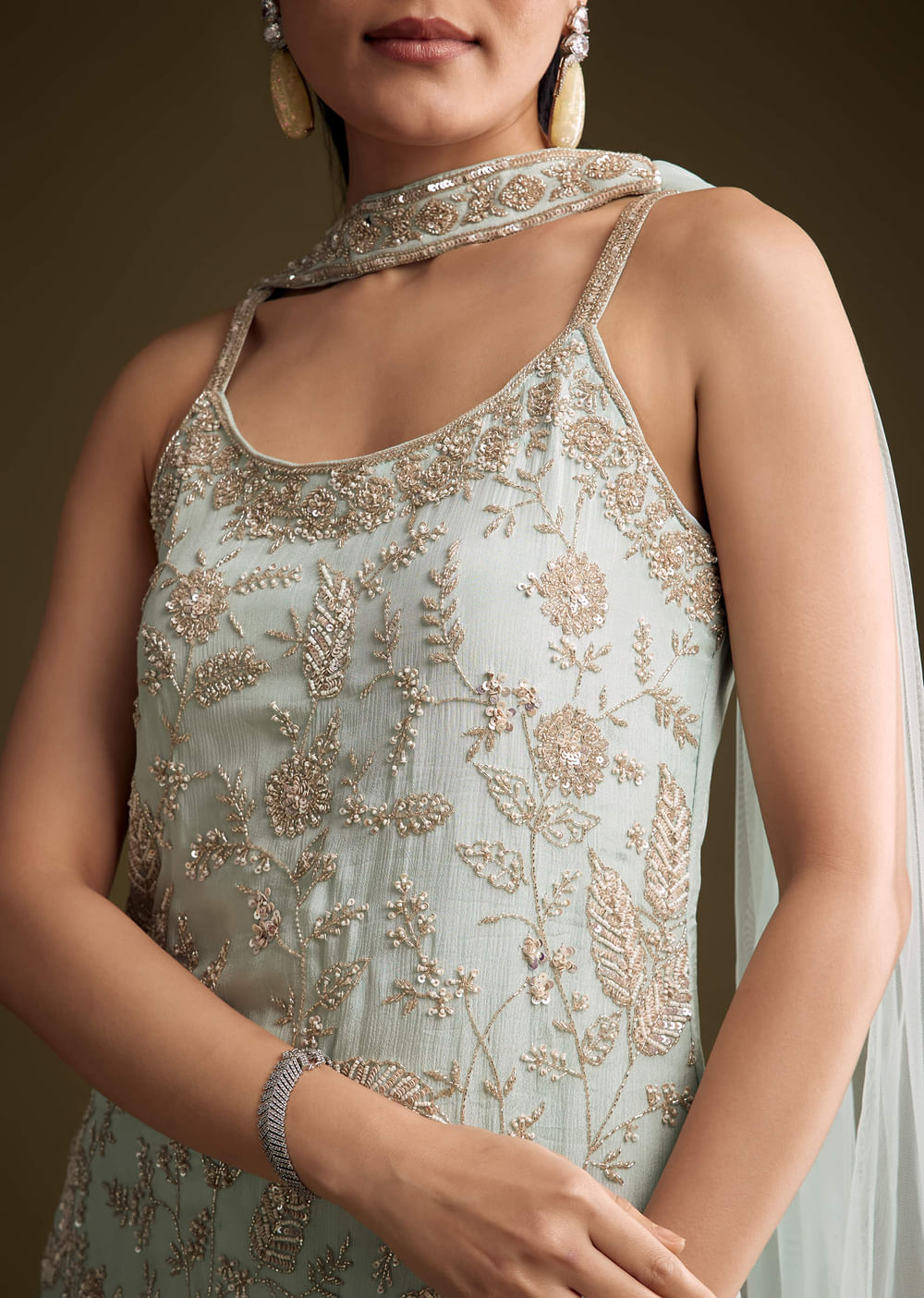 When colour needs to feel airy and bright, this sky blue chinon sharara suit delivers soft drape with a gentle glow. Sequins and moti accents trace the kurta to catch... More Product Details