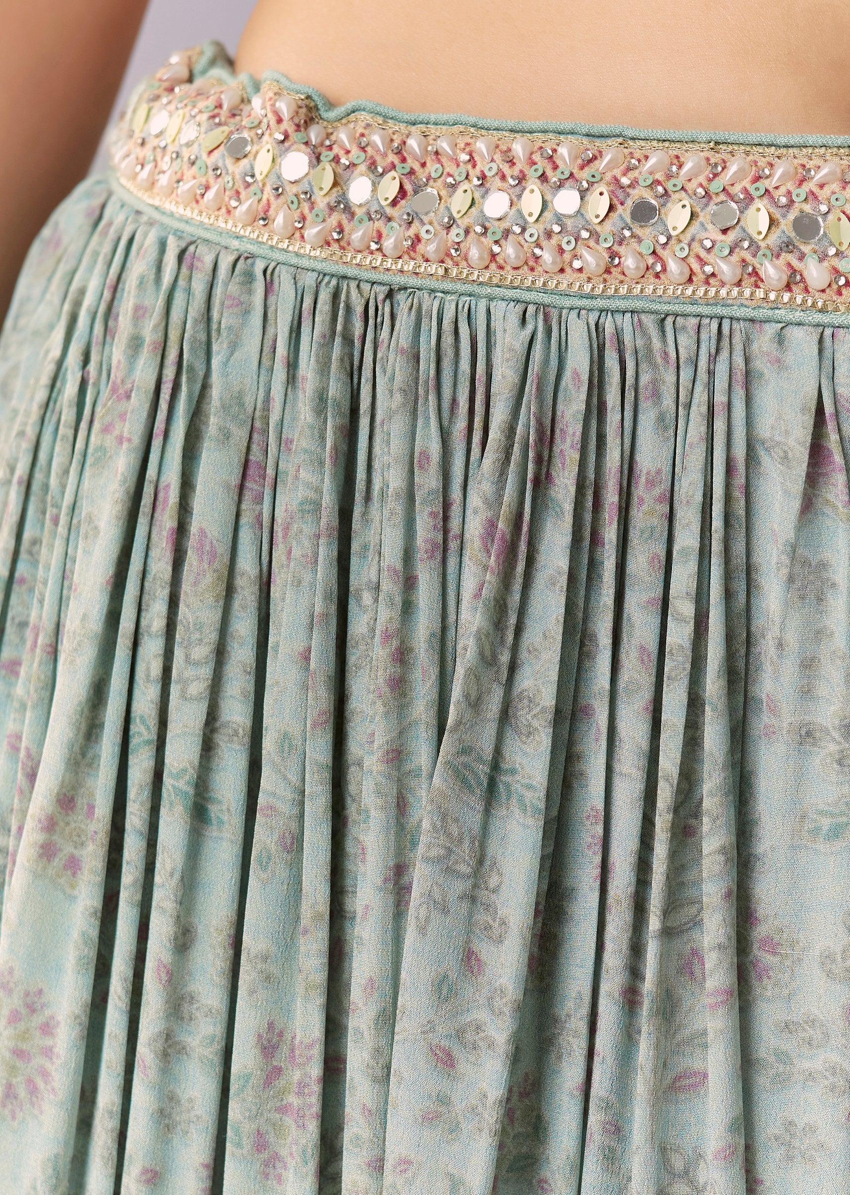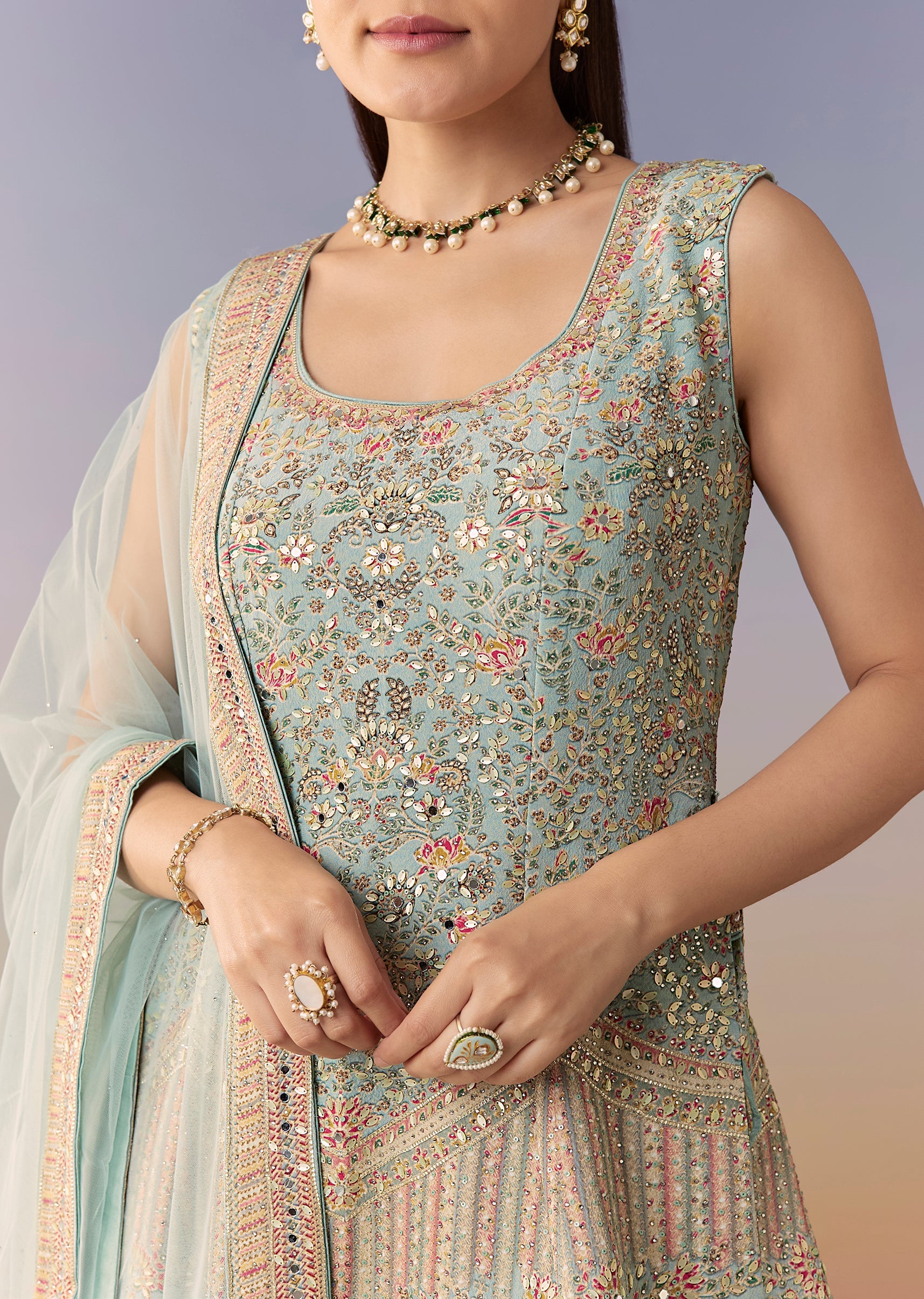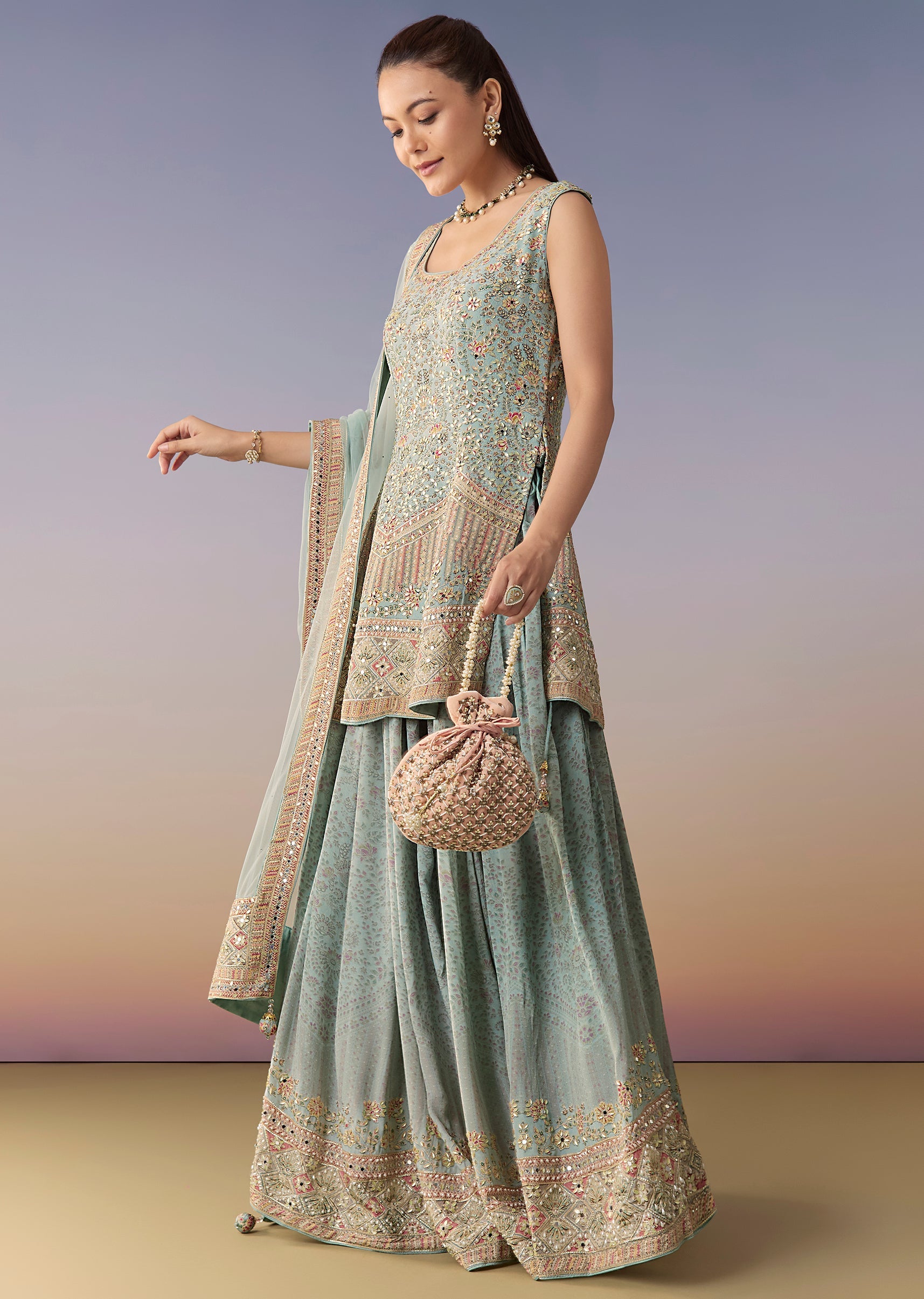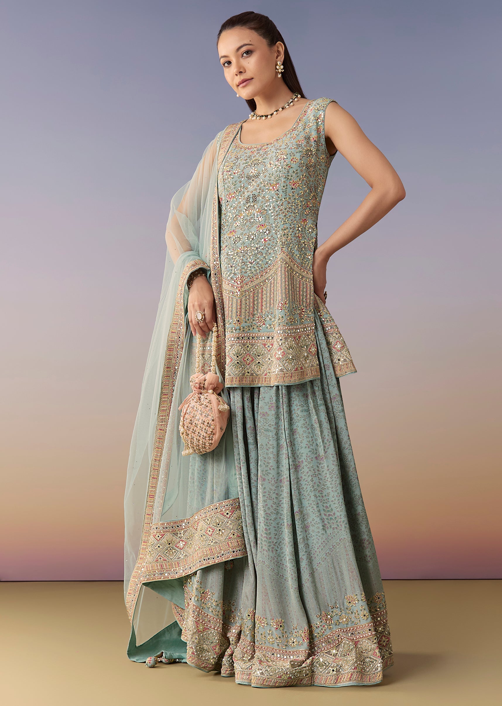 Sky Blue Floral Embellished Palazzo Set With Dupatta