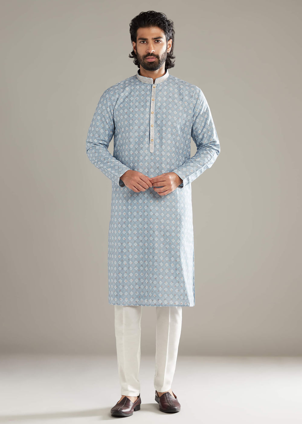 Sky Blue Silk Kurta Set For Men With Floral Printed Motifs