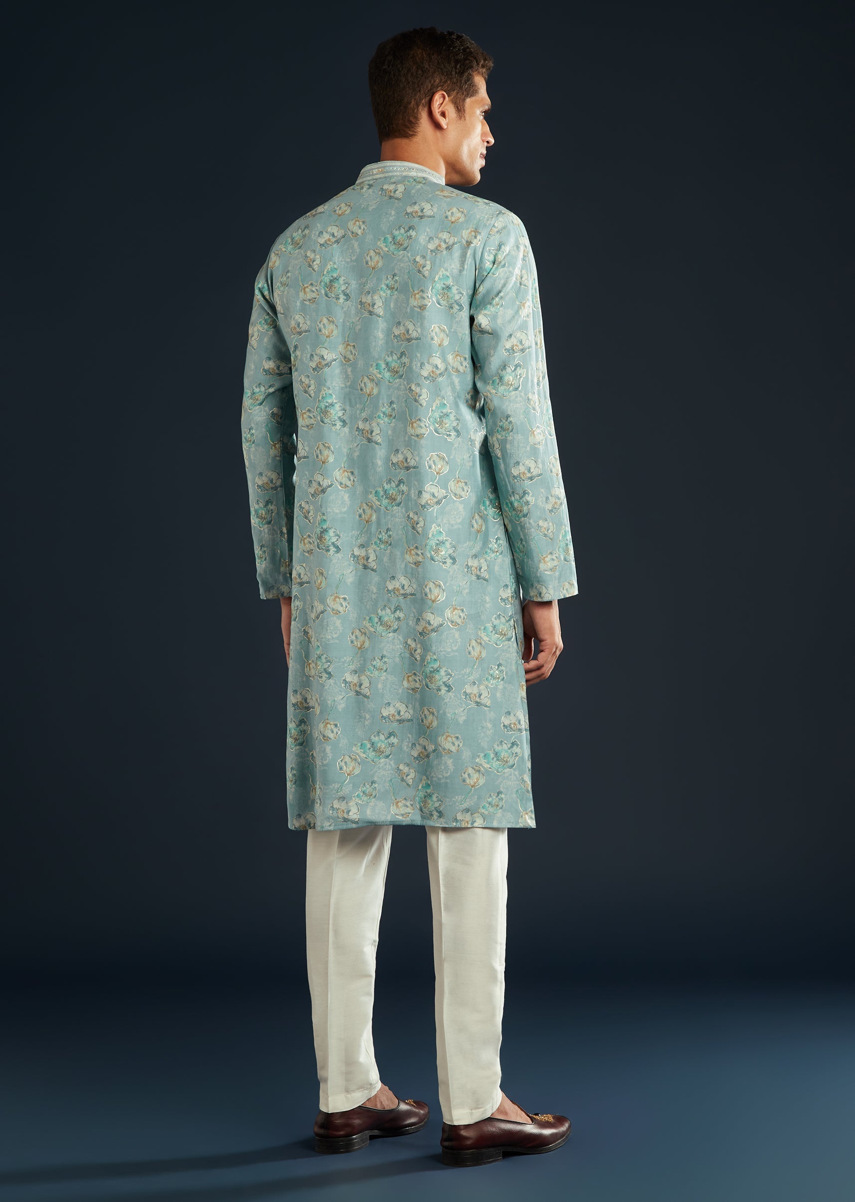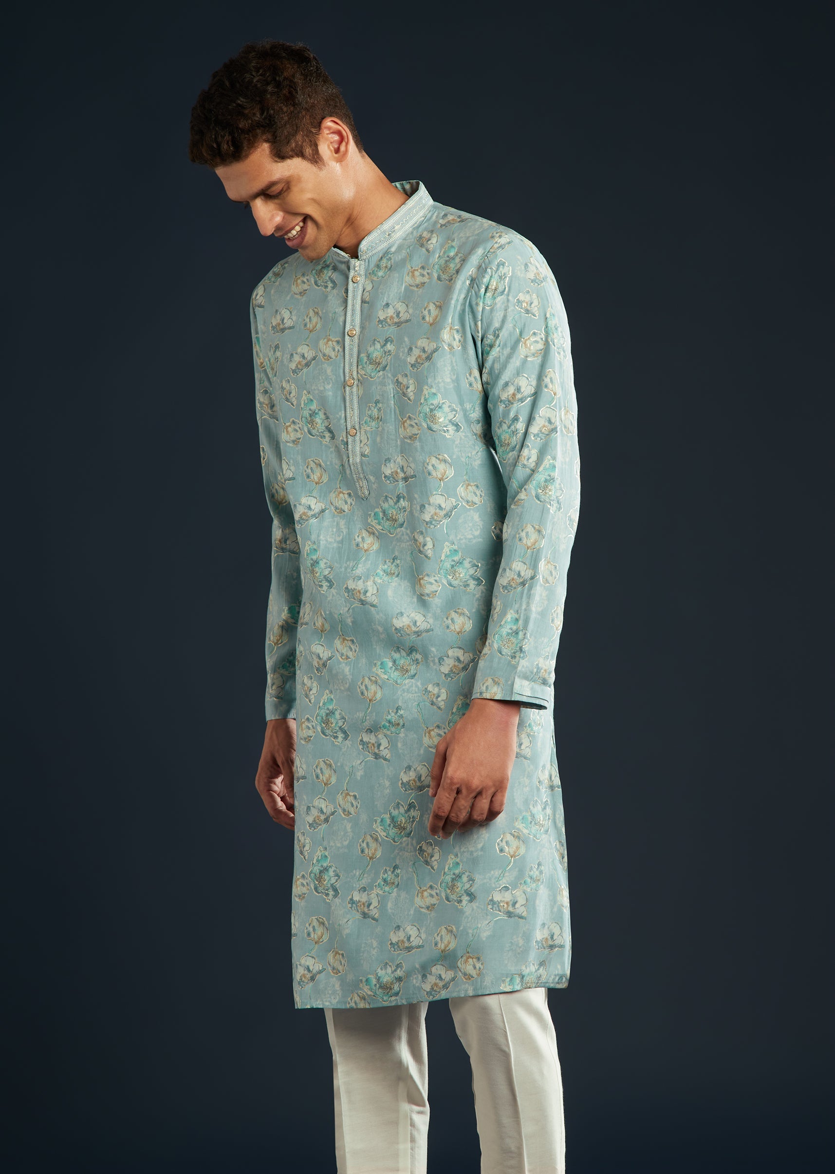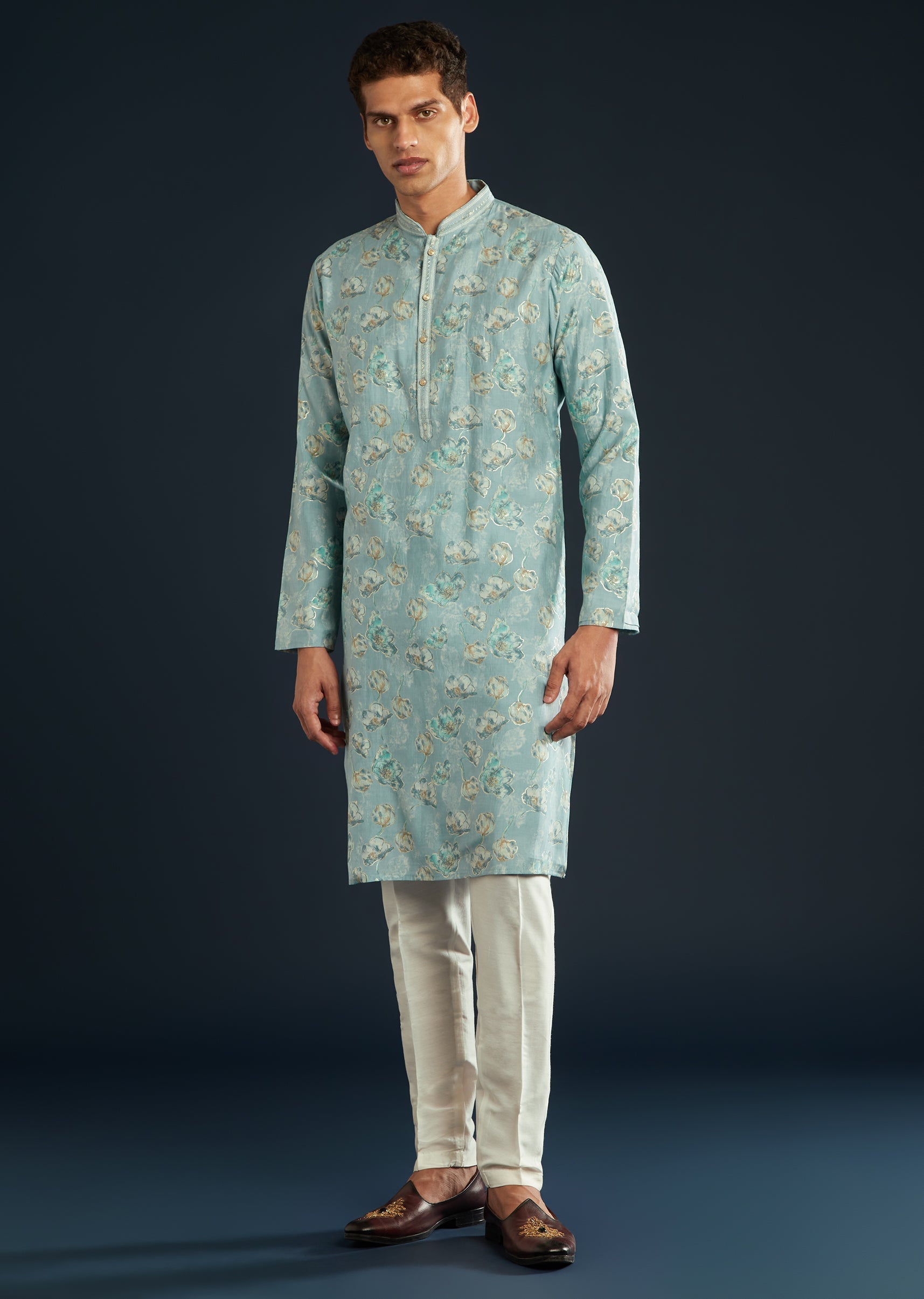 An ode to India's rich craft and heritage, this serene sky blue men's kurta set. Adorned with gleaming floral motifs in a jaal pattern, the intertwined texture lends an alluring look and feel. Tailored with a mandarin collar, front placket and full-sleeve, making a stand-out outfit for all celebratory functions. Paired with classic pants this ensemble lends a refined sheen. Awarded as the Most Trusted Brand, we're delivering styles you love, just as promised.