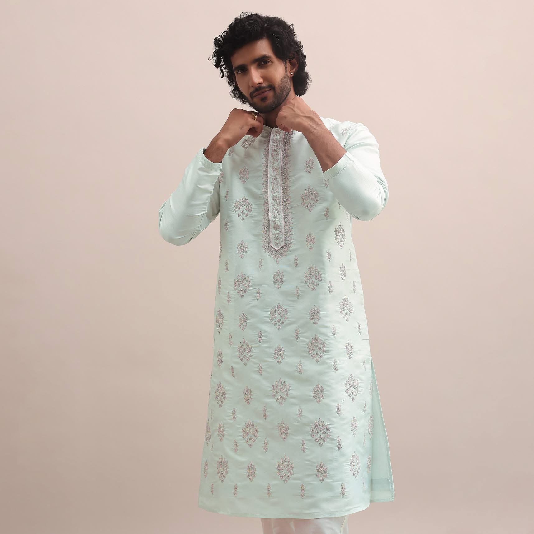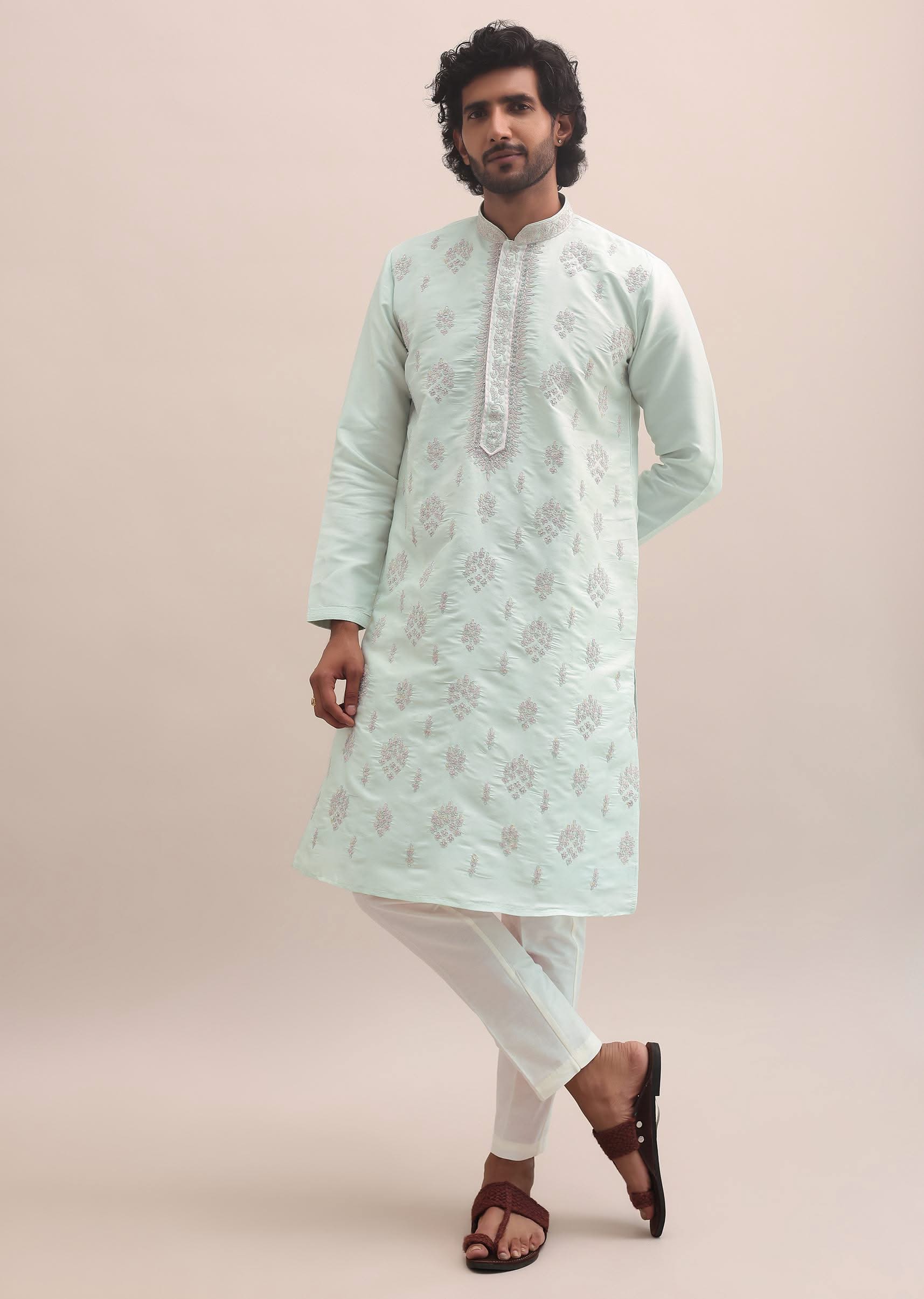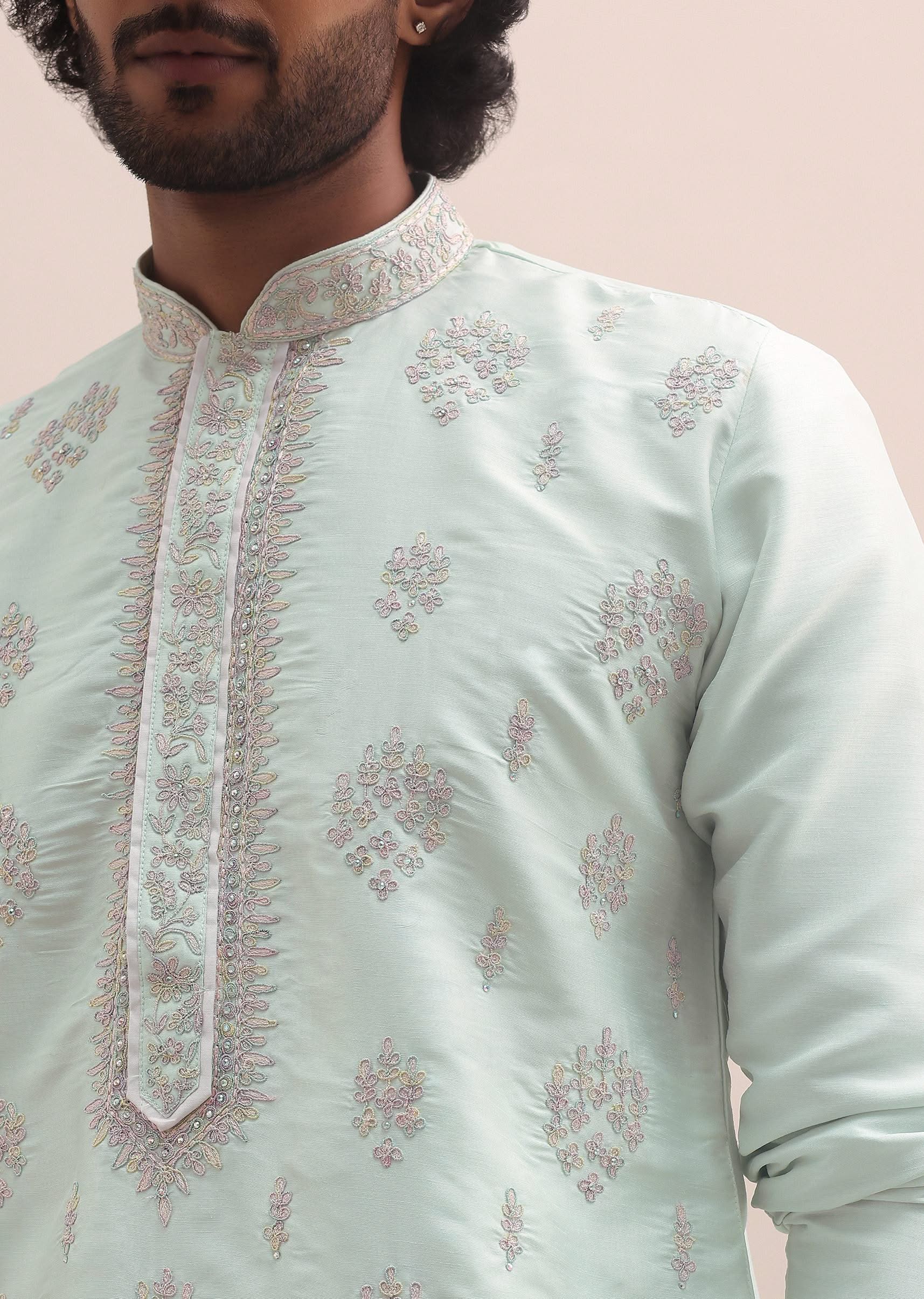 Light Pista Thread Embroidered Cotton Silk Kurta Set For Men