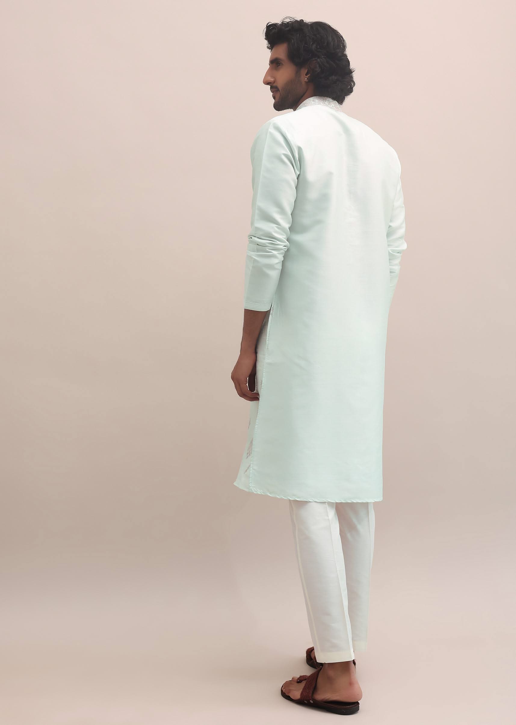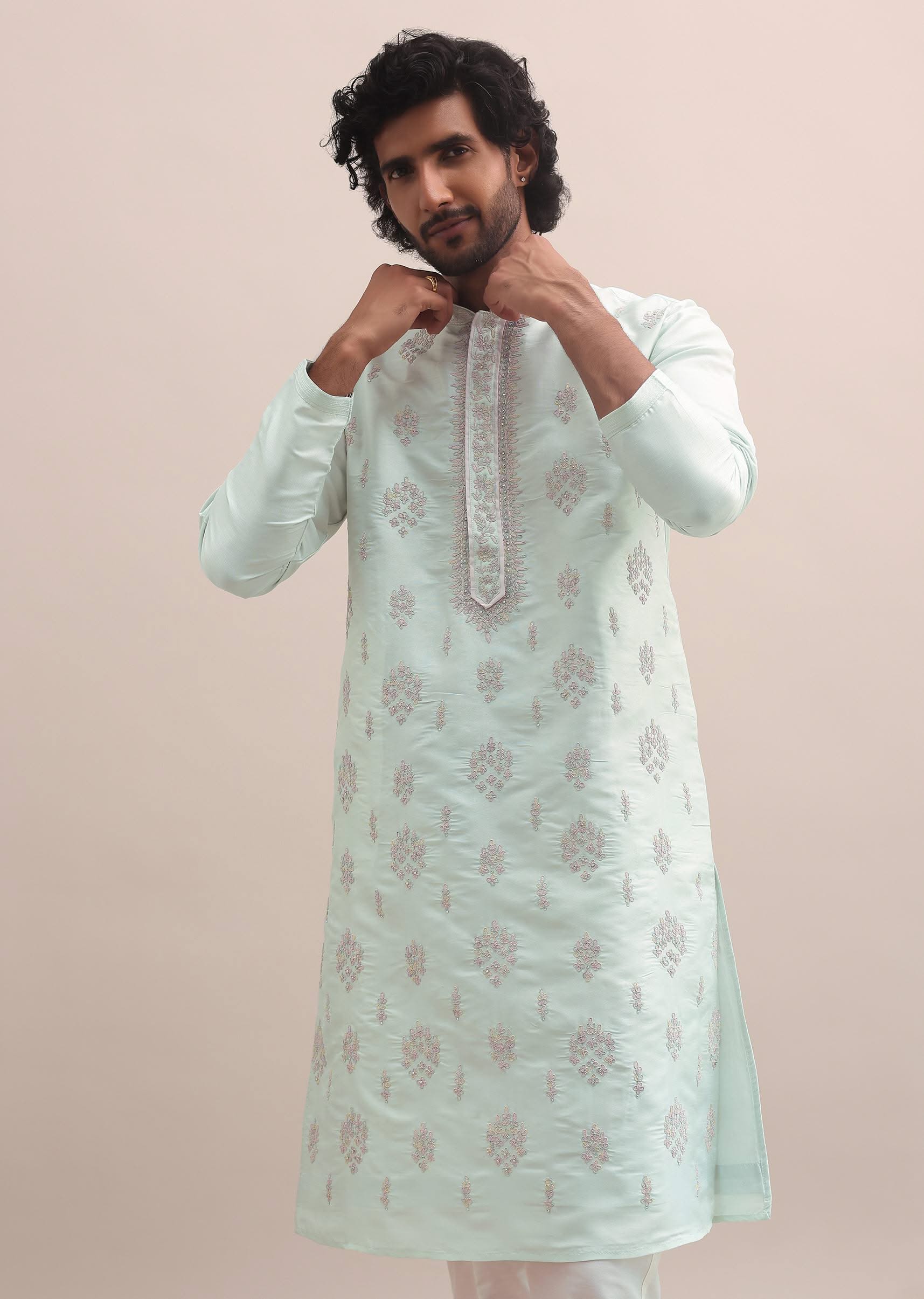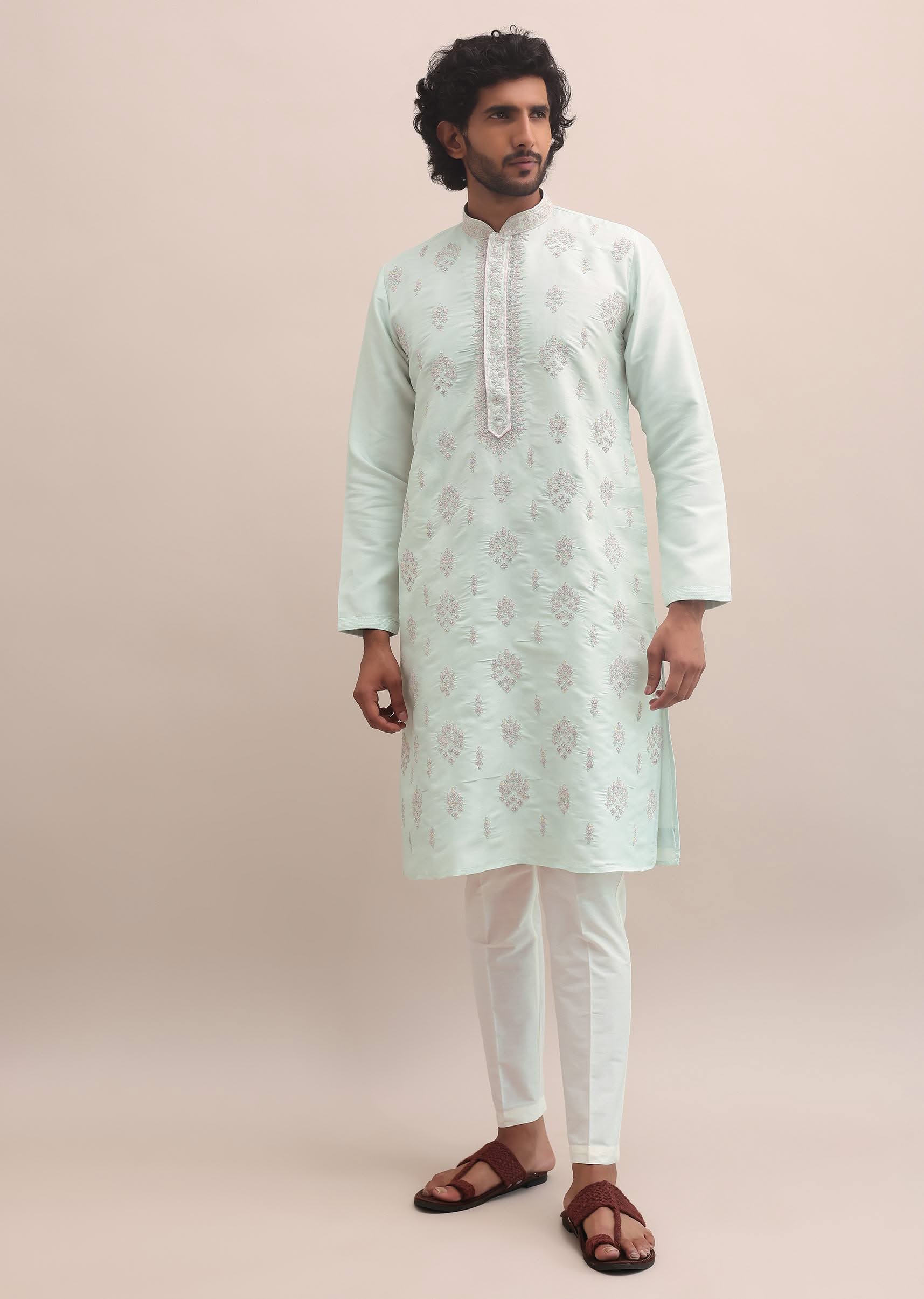 Light Pista Thread Embroidered Cotton Silk Kurta Set For Men