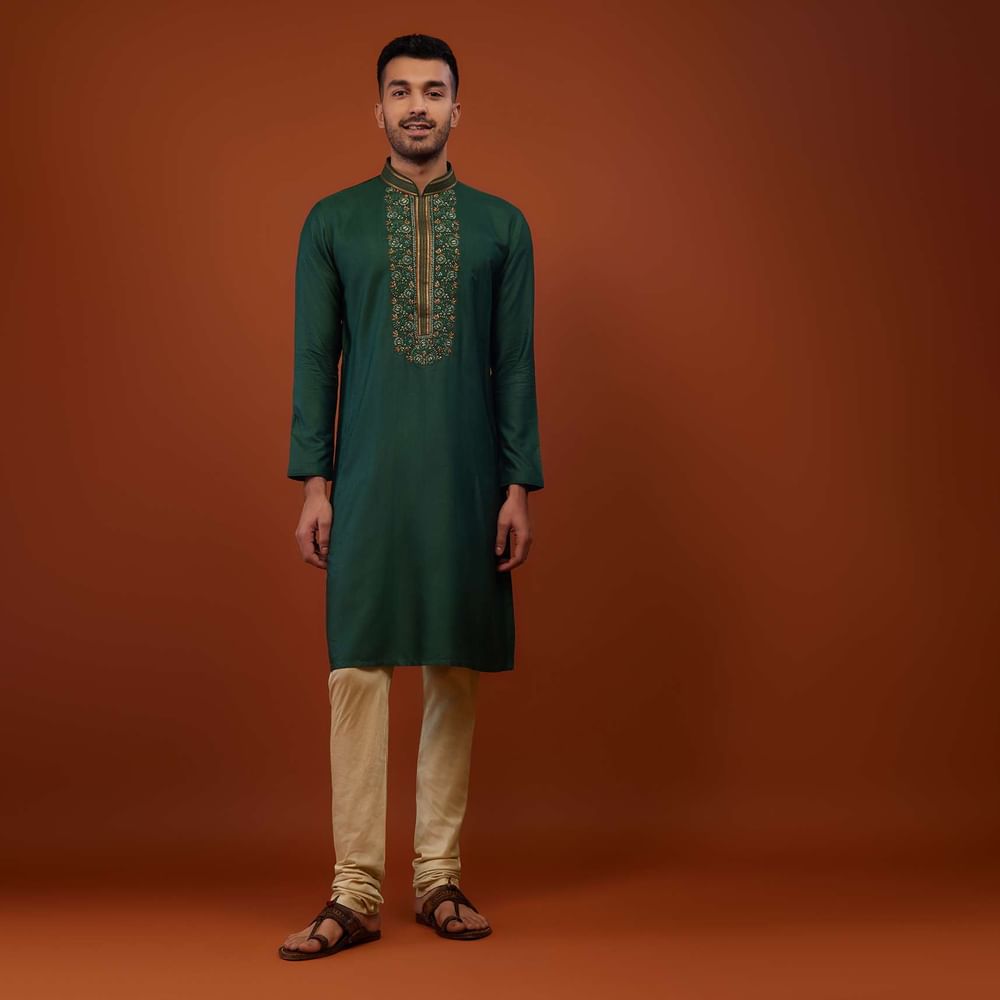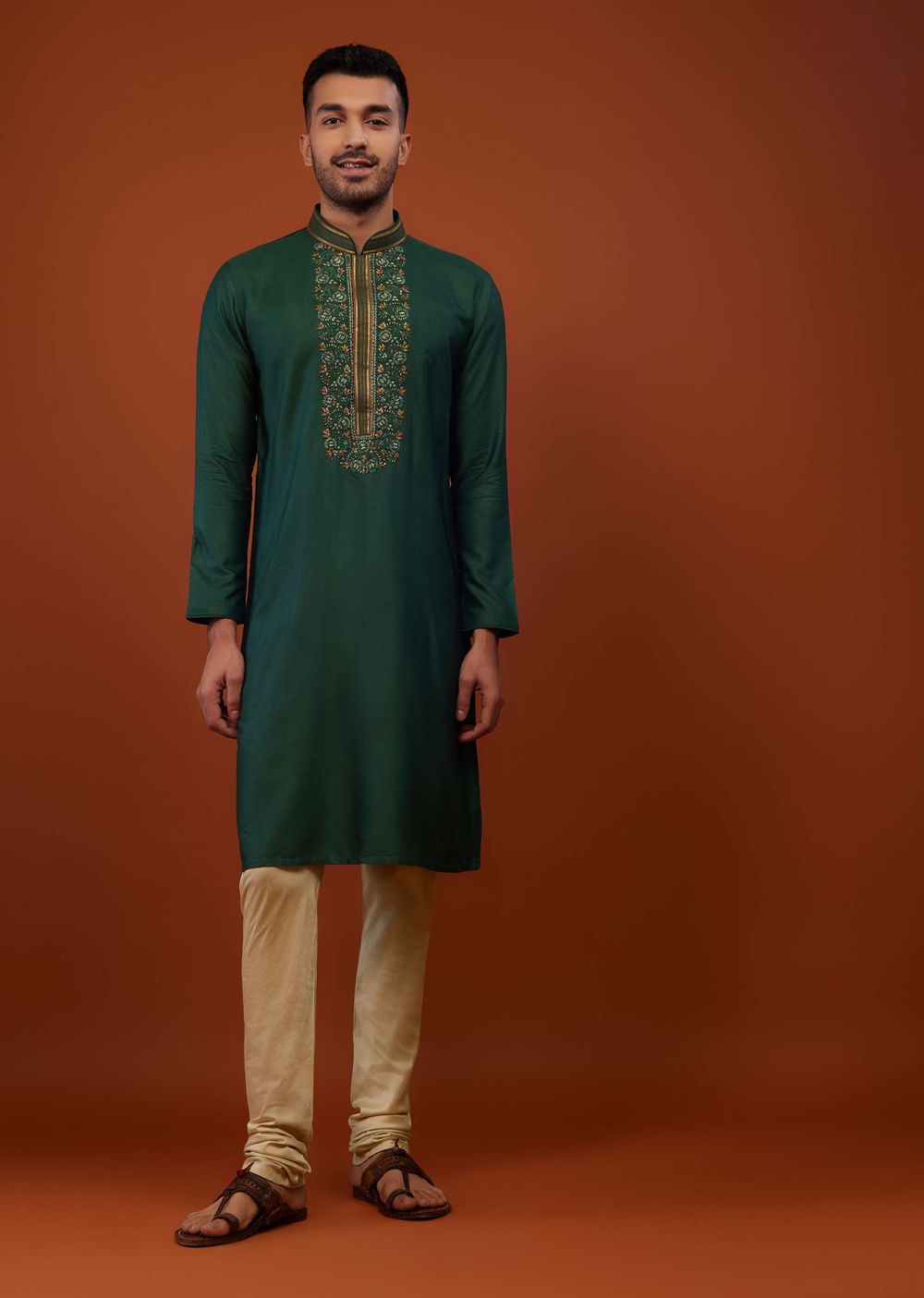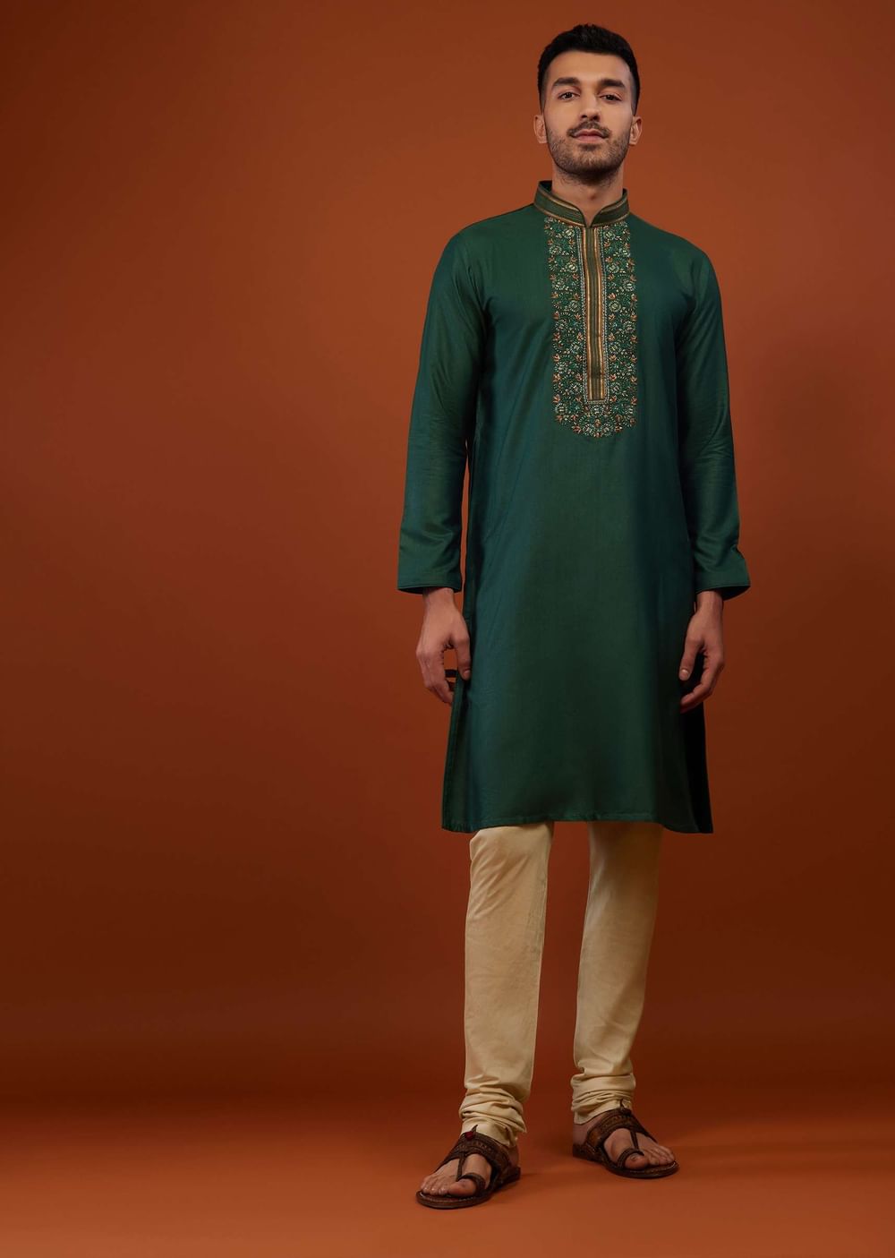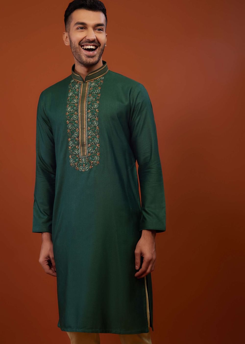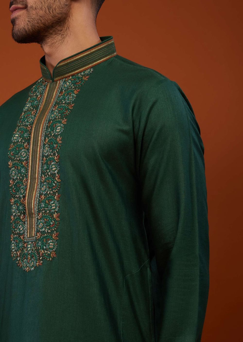 Emerald Green Embroidered Cotton Silk Kurta Set