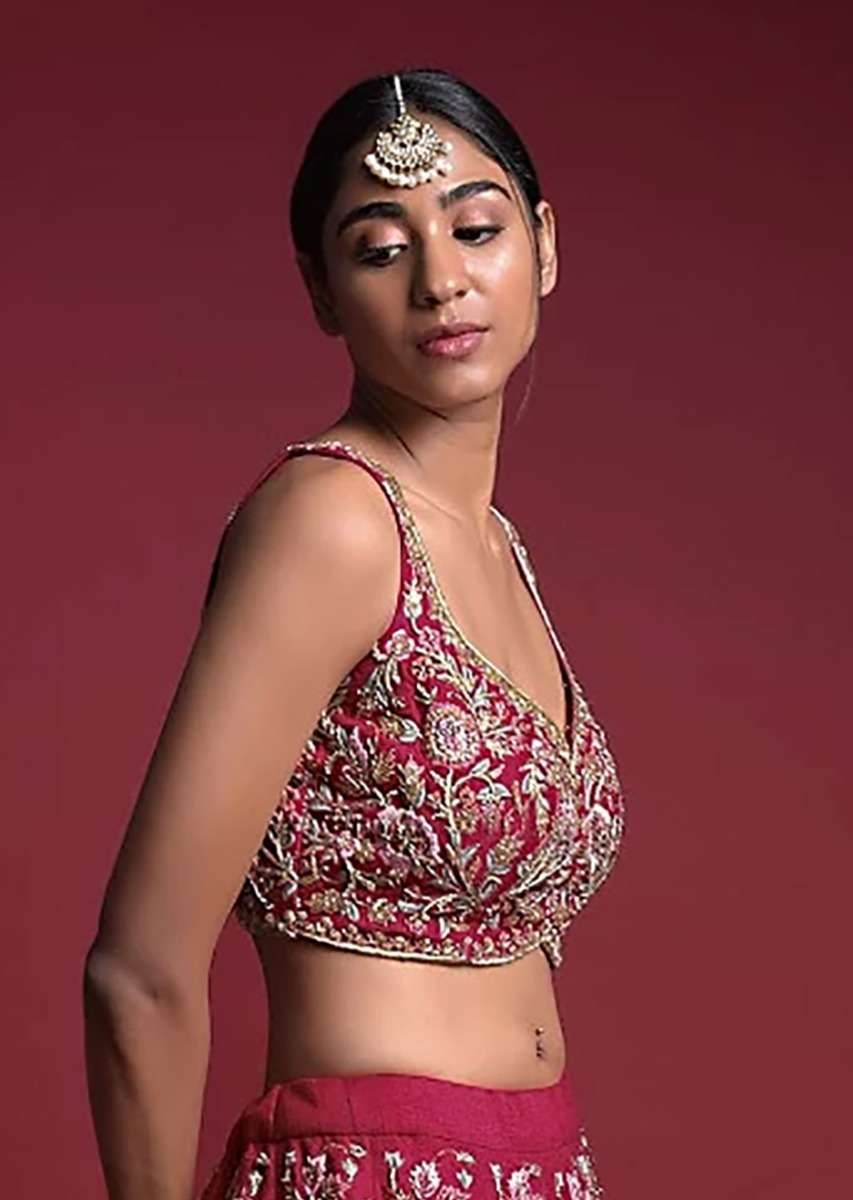 Strawberry pink choli in raw silk adorned with resham and zardosi embroidered floral jaal. Designed sleeveless with sweetheart neckline, curved hem and elaborate tassel dori in the back. The length... More Product Details