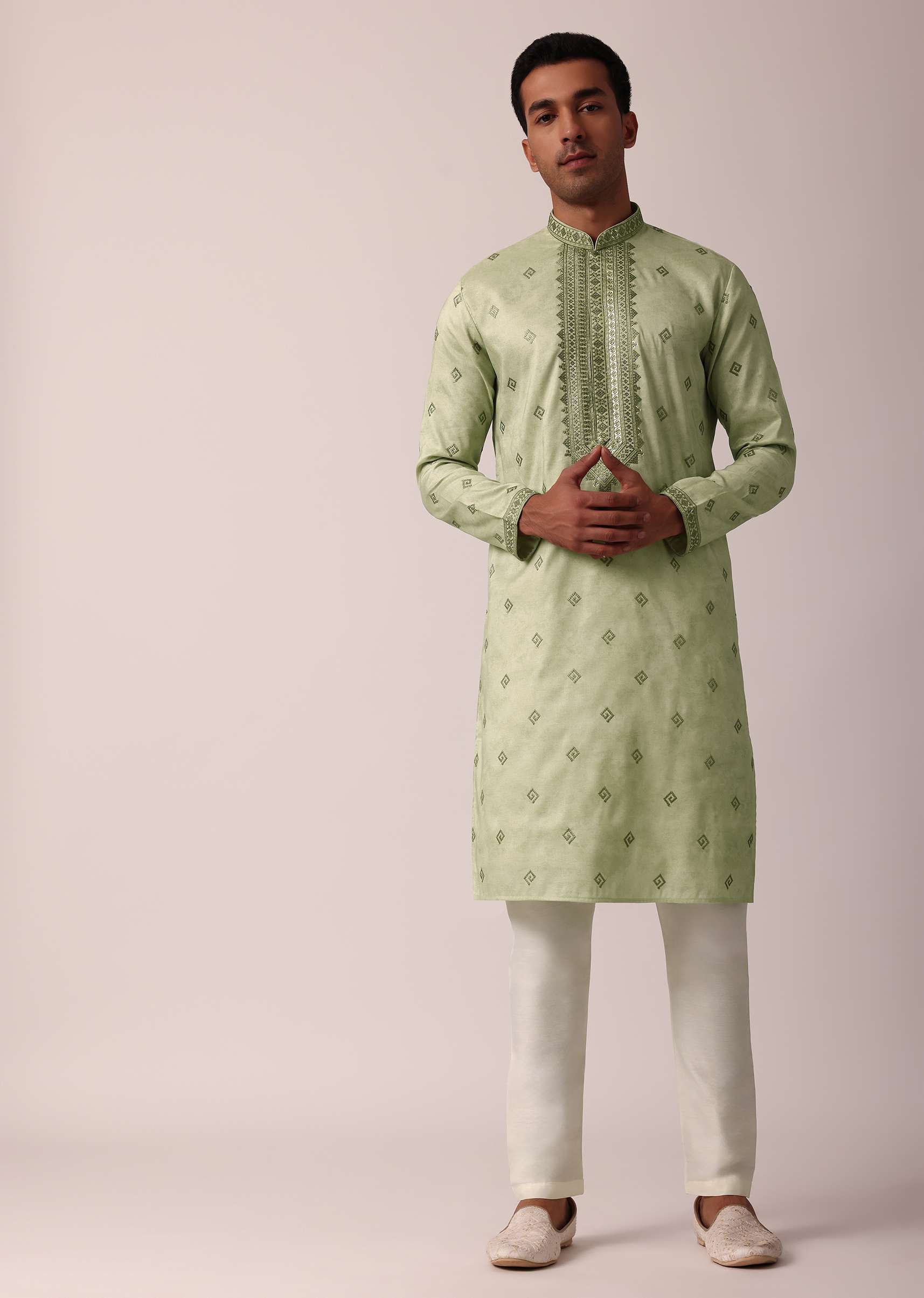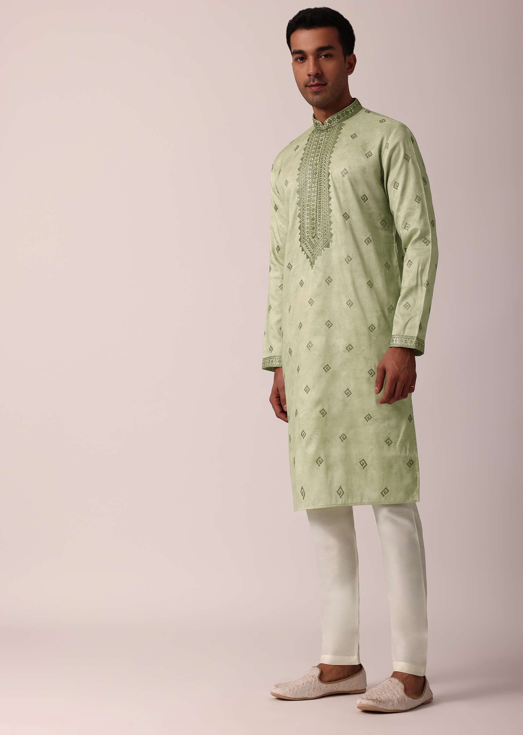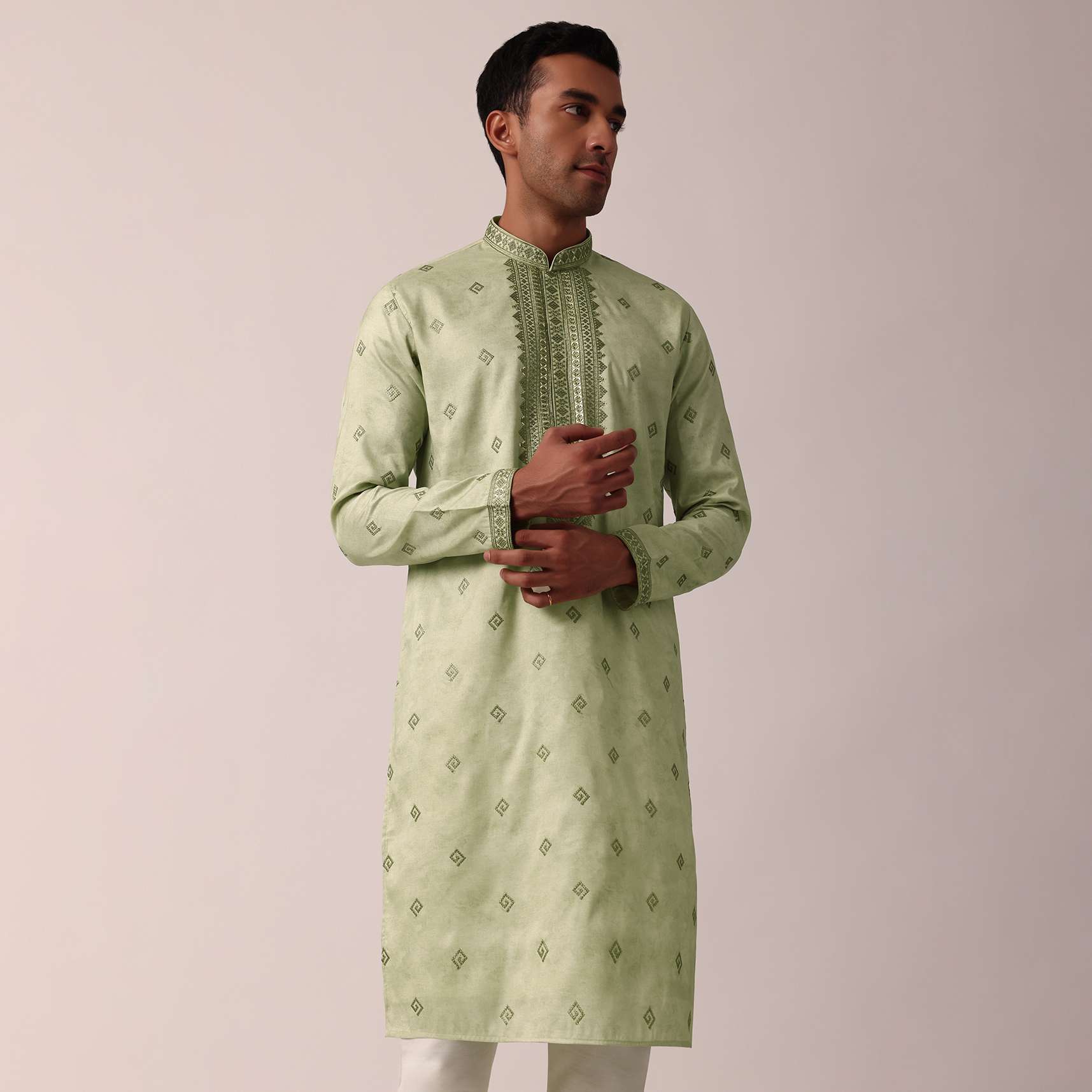 Step into festivities with our Stylish Green Silk Kurta Set. It highlights exquisite work on the collar and yoke. Perfect for festivals, this ensemble includes a full-sleeves kurta with sequin... More Product Details