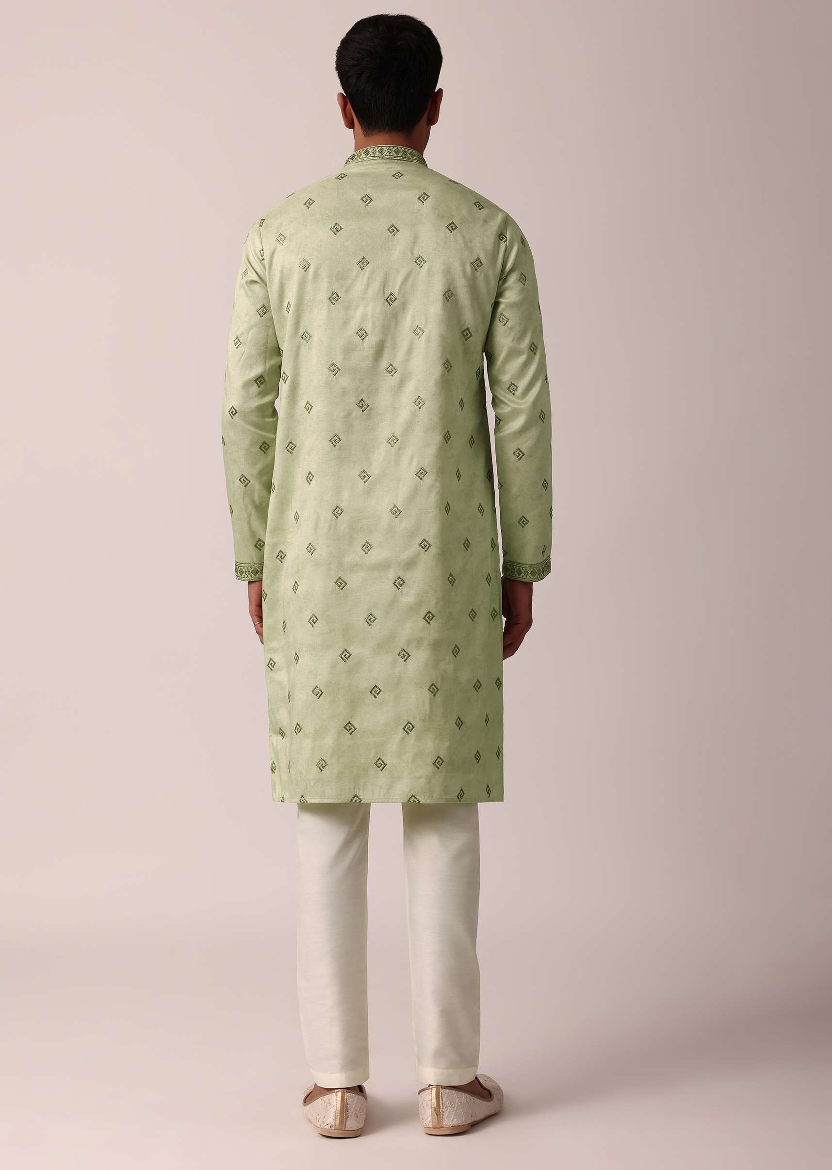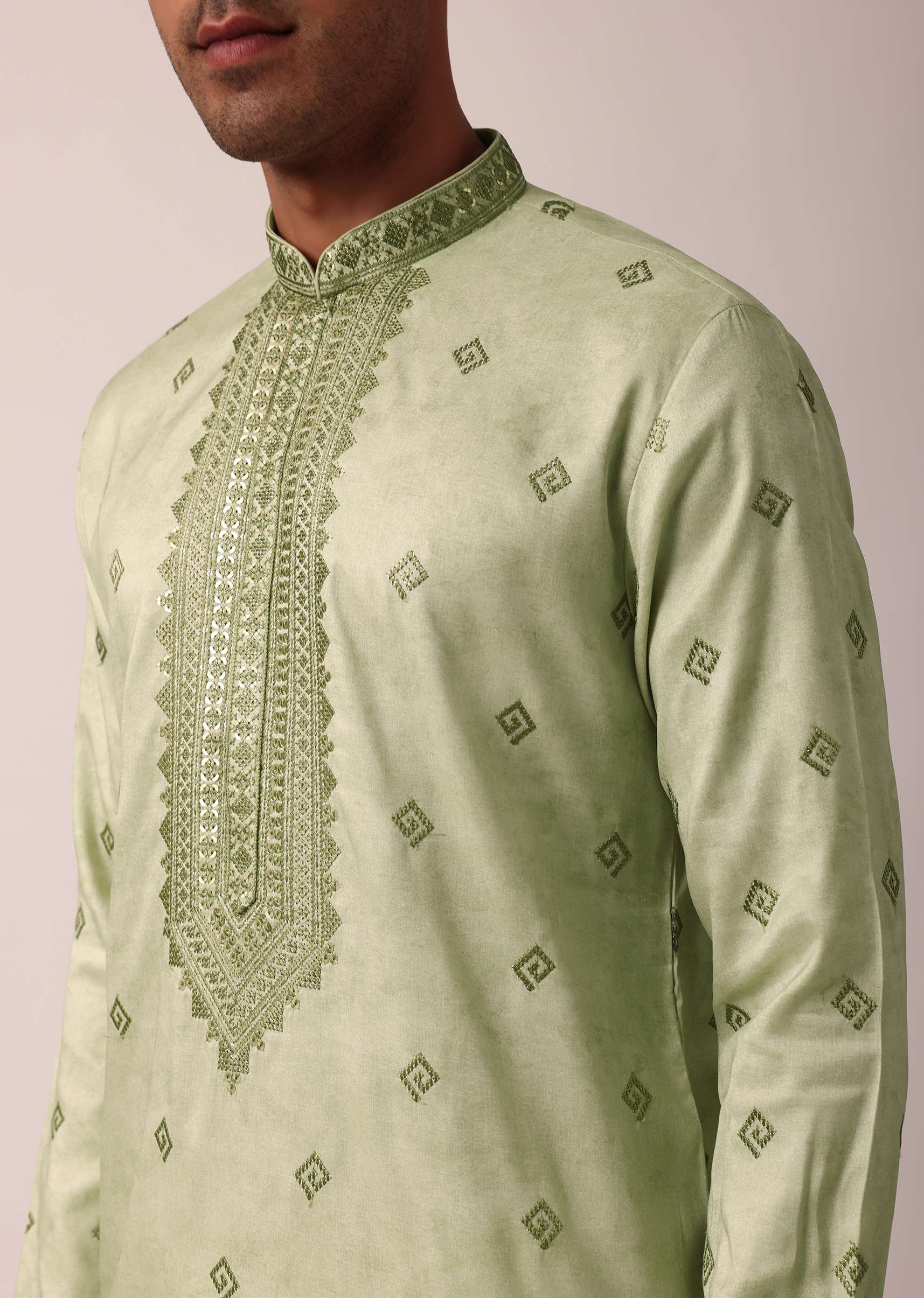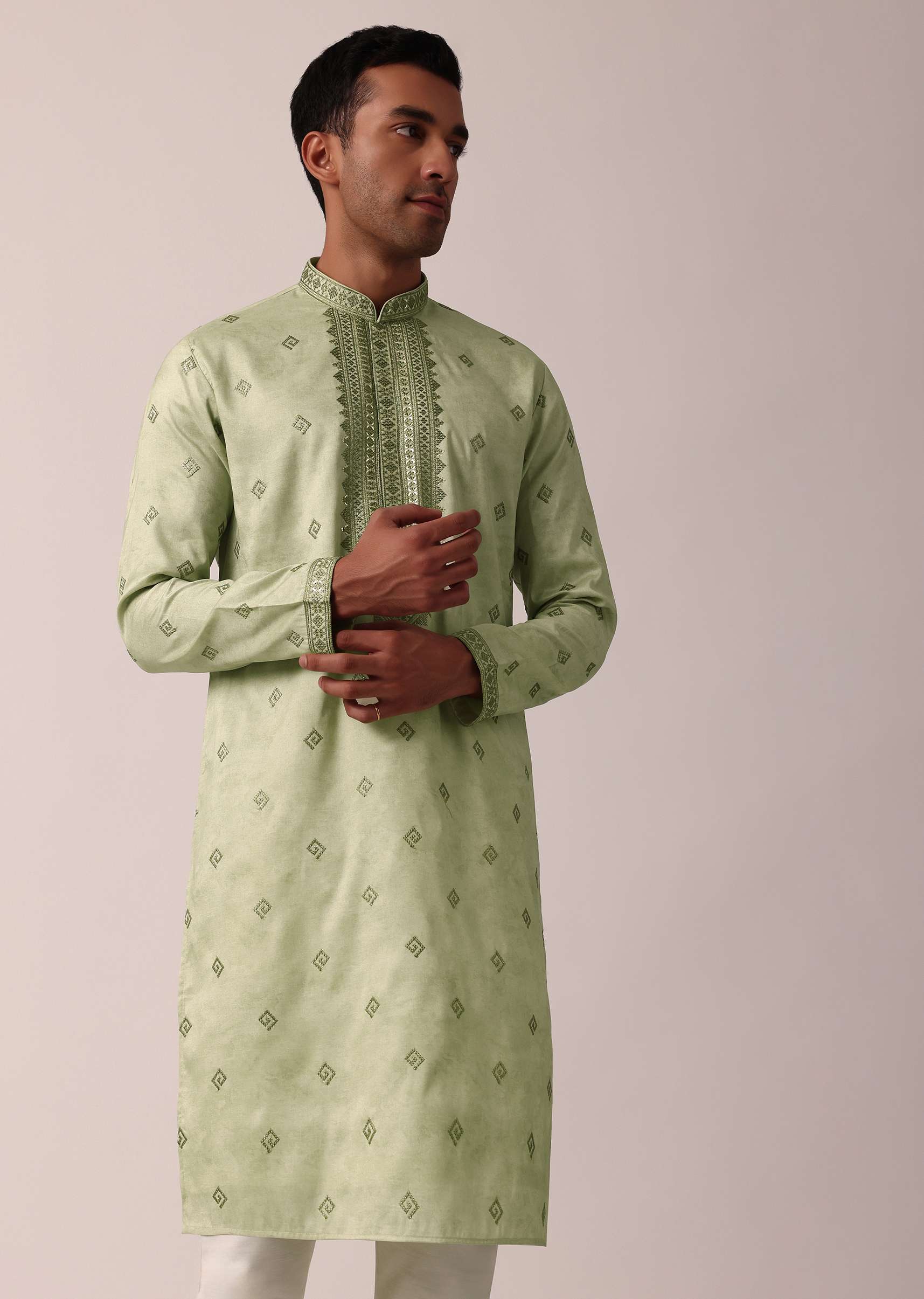 Step into festivities with our Stylish Green Silk Kurta Set. It highlights exquisite work on the collar and yoke. Perfect for festivals, this ensemble includes a full-sleeves kurta with sequin... More Product Details