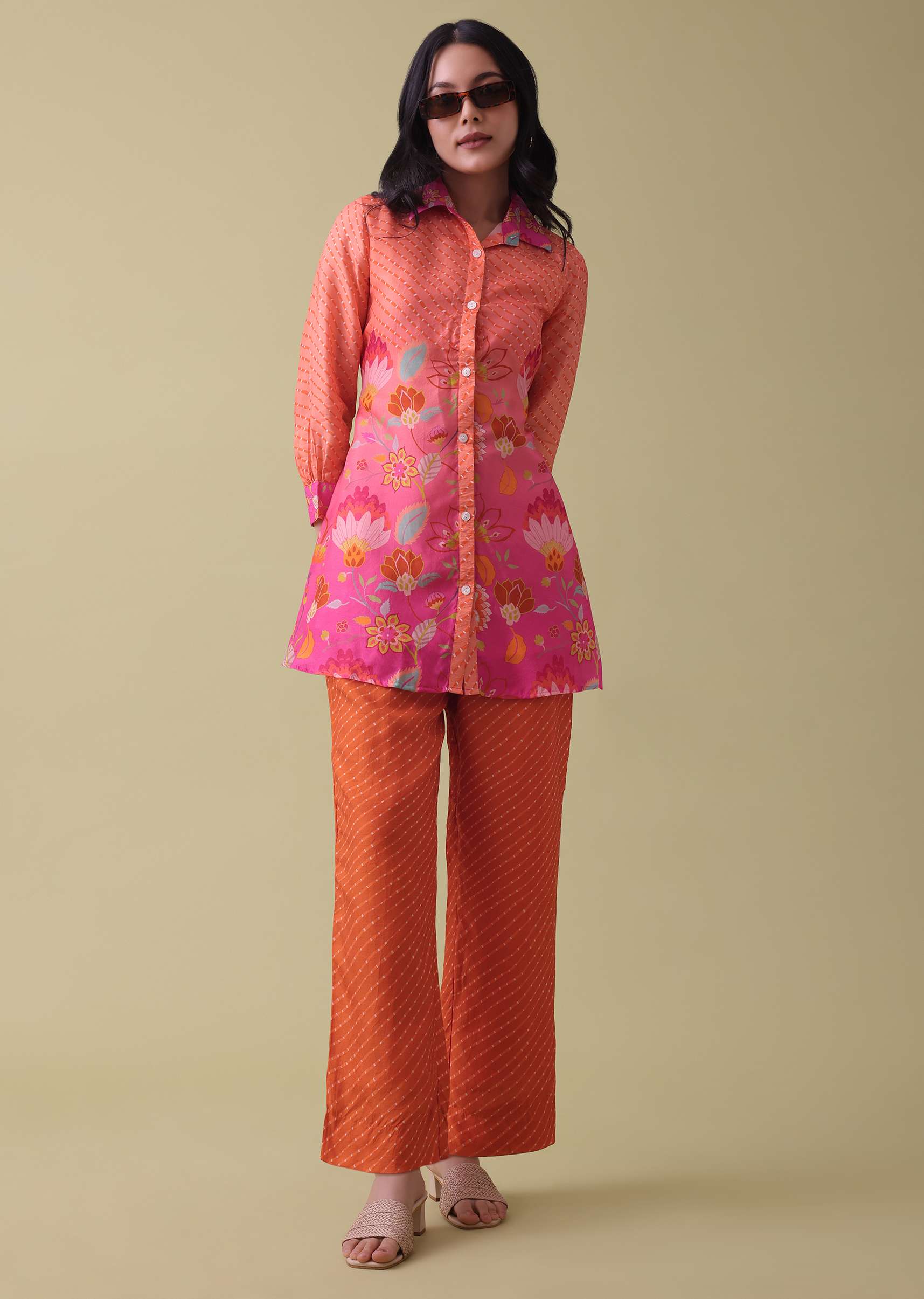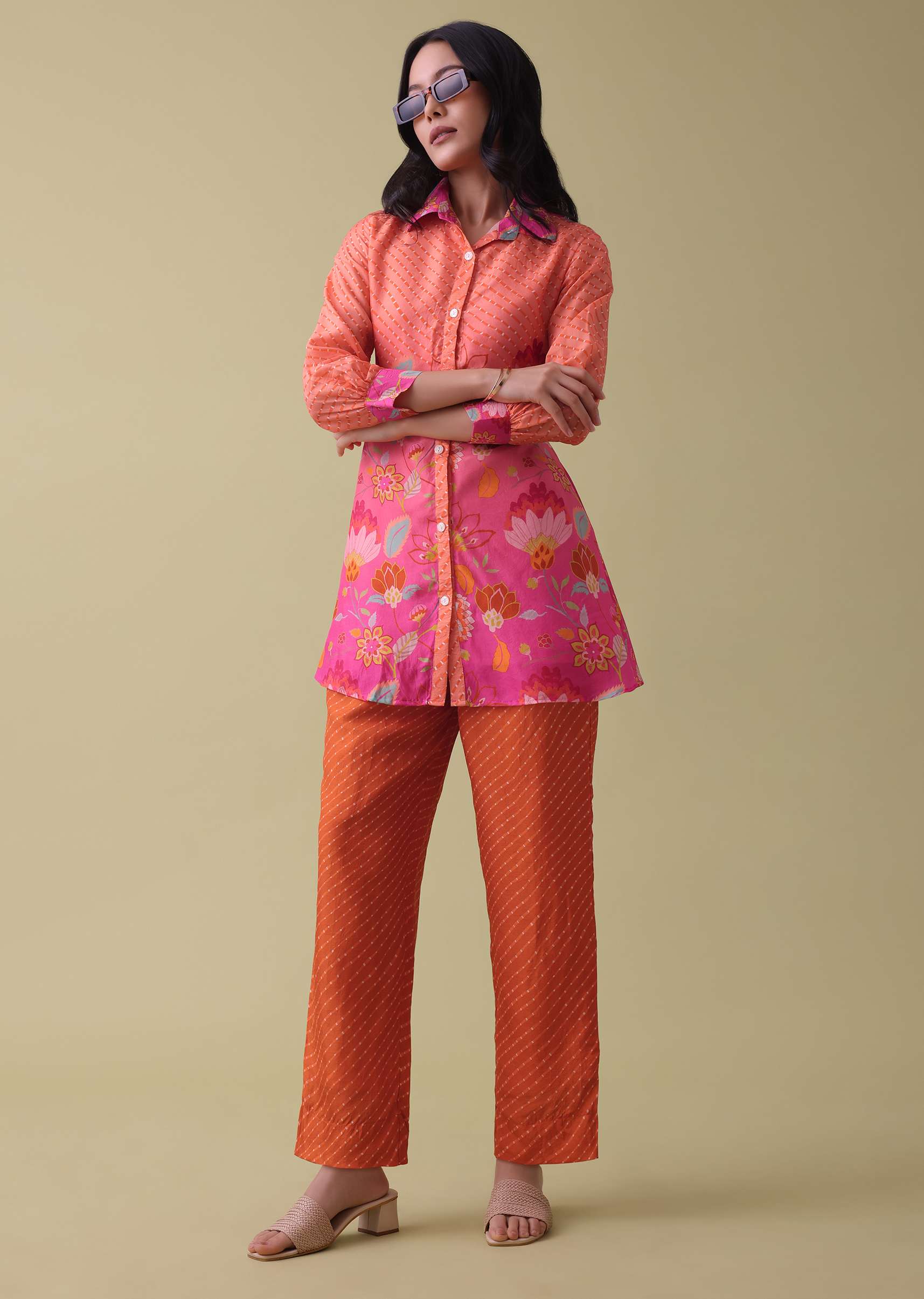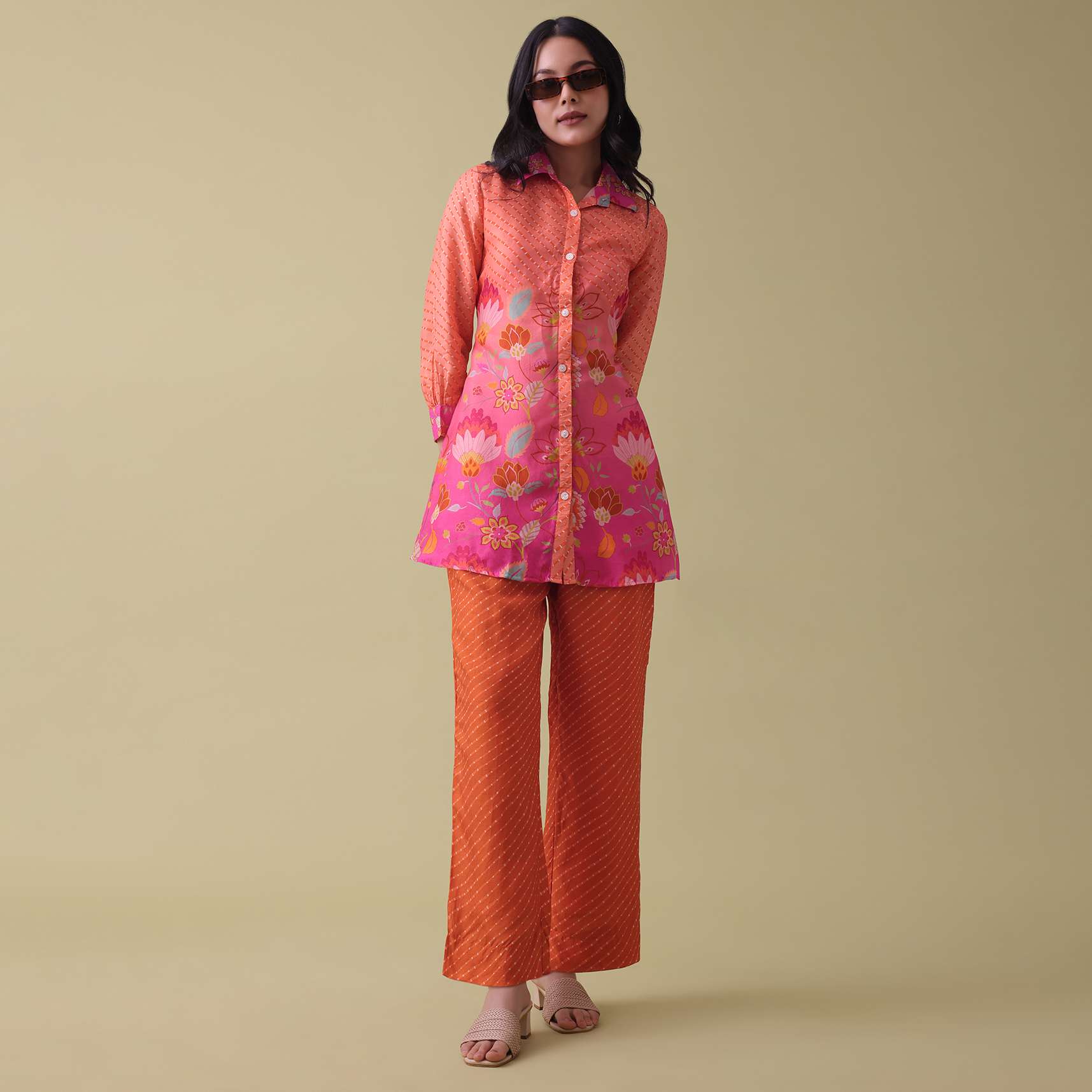 Tangerine Orange Floral Printed Co-ord Set In Tussar