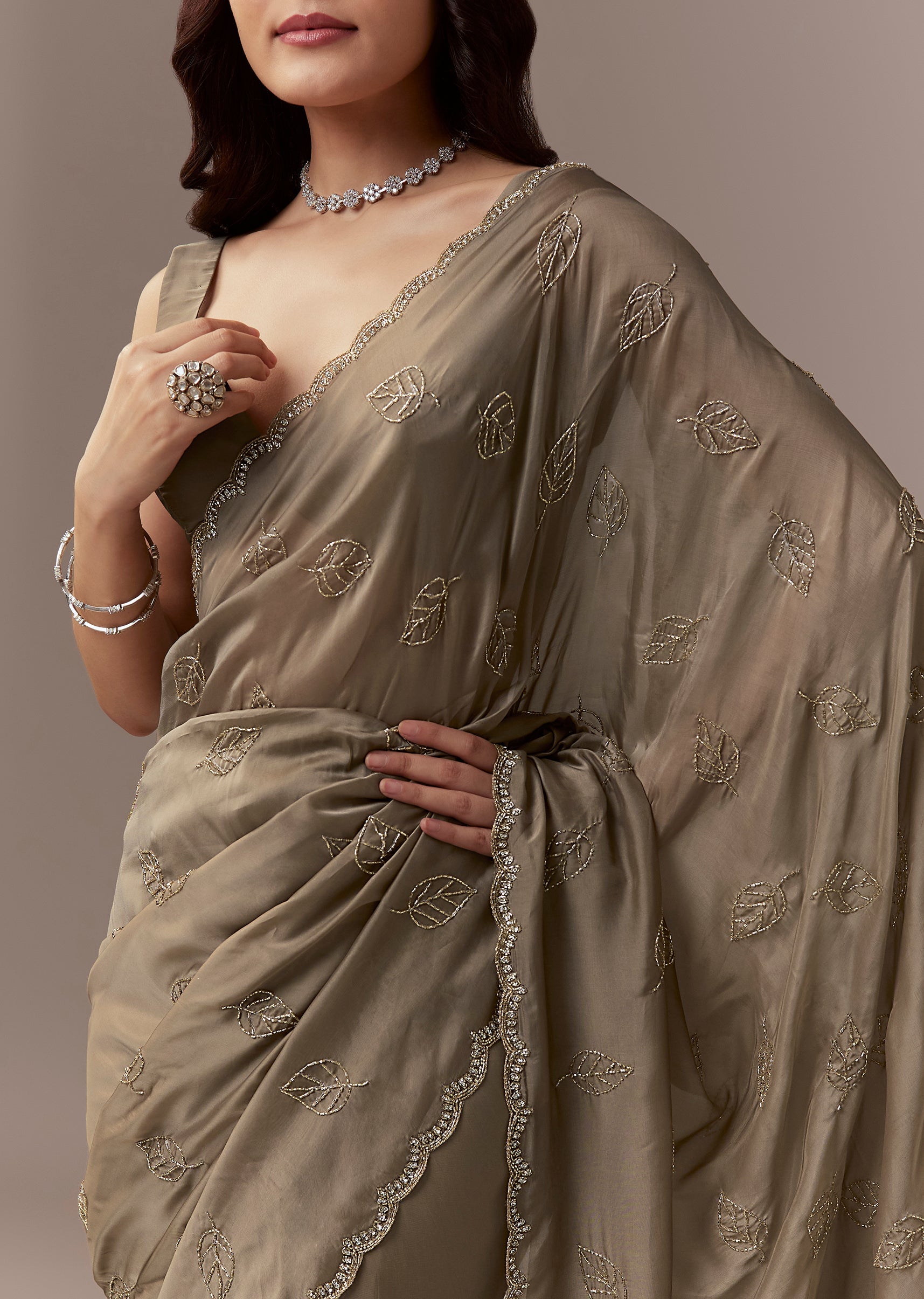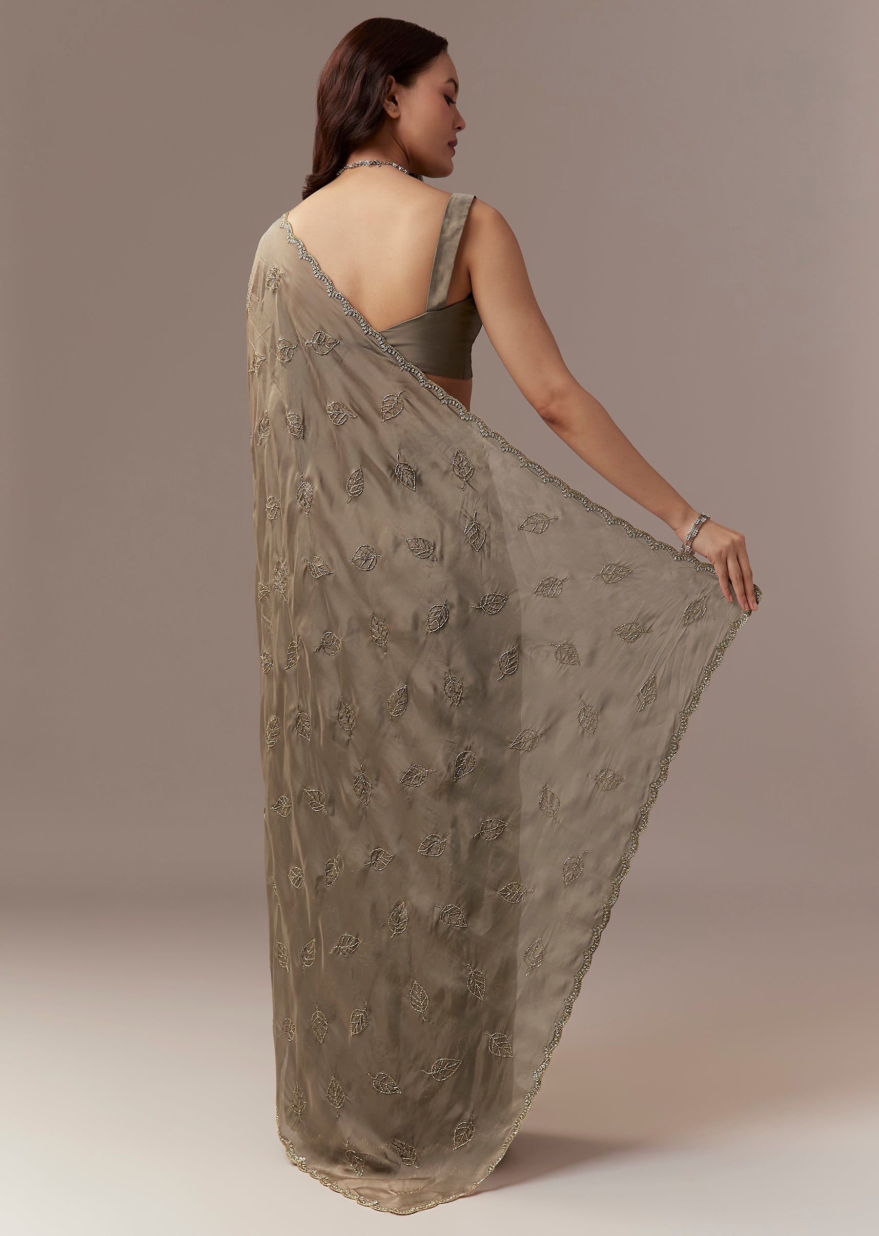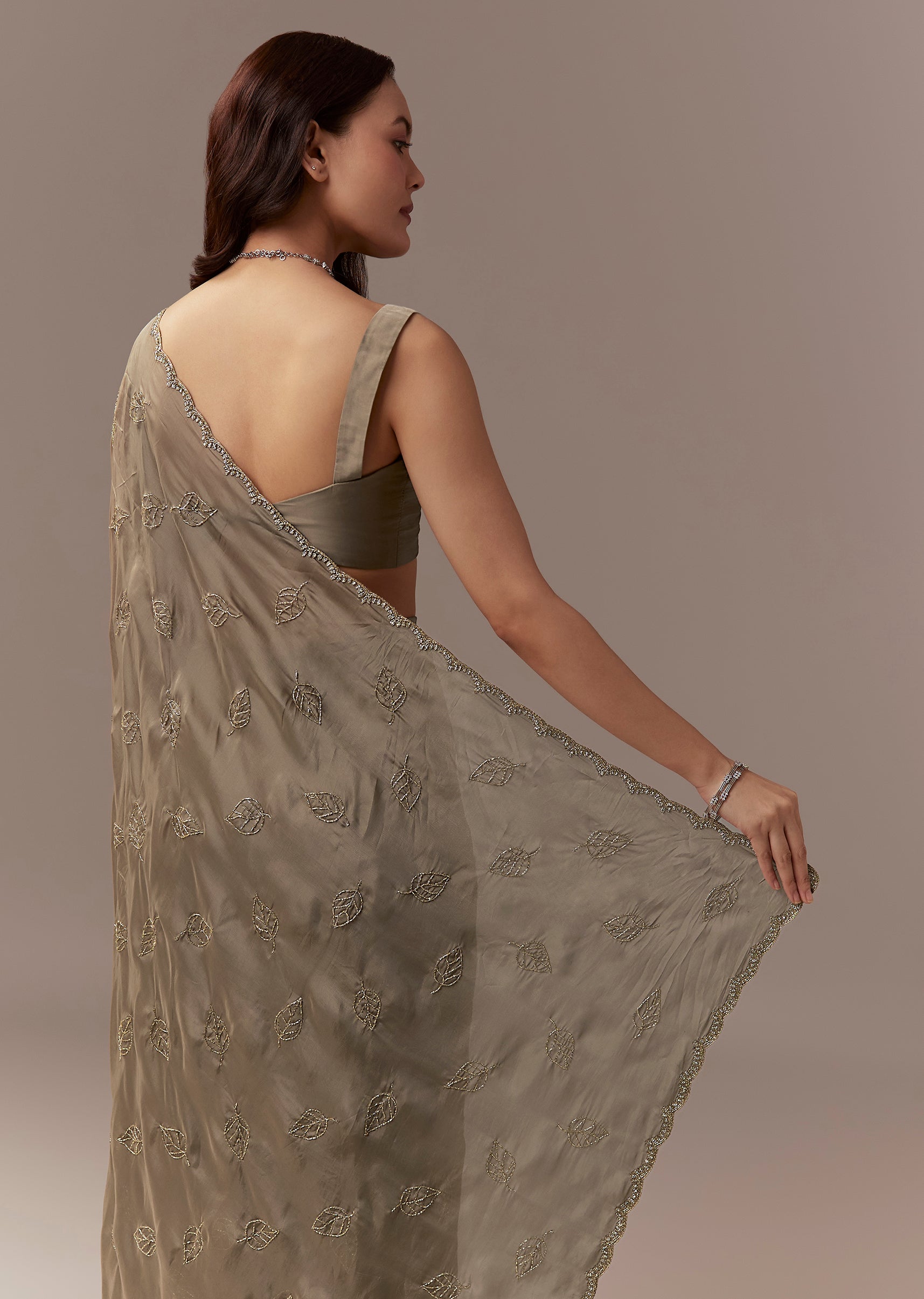 Taupe Brown Kora Silk Saree With Cutdana Stones And Leaf Motif Embroidery