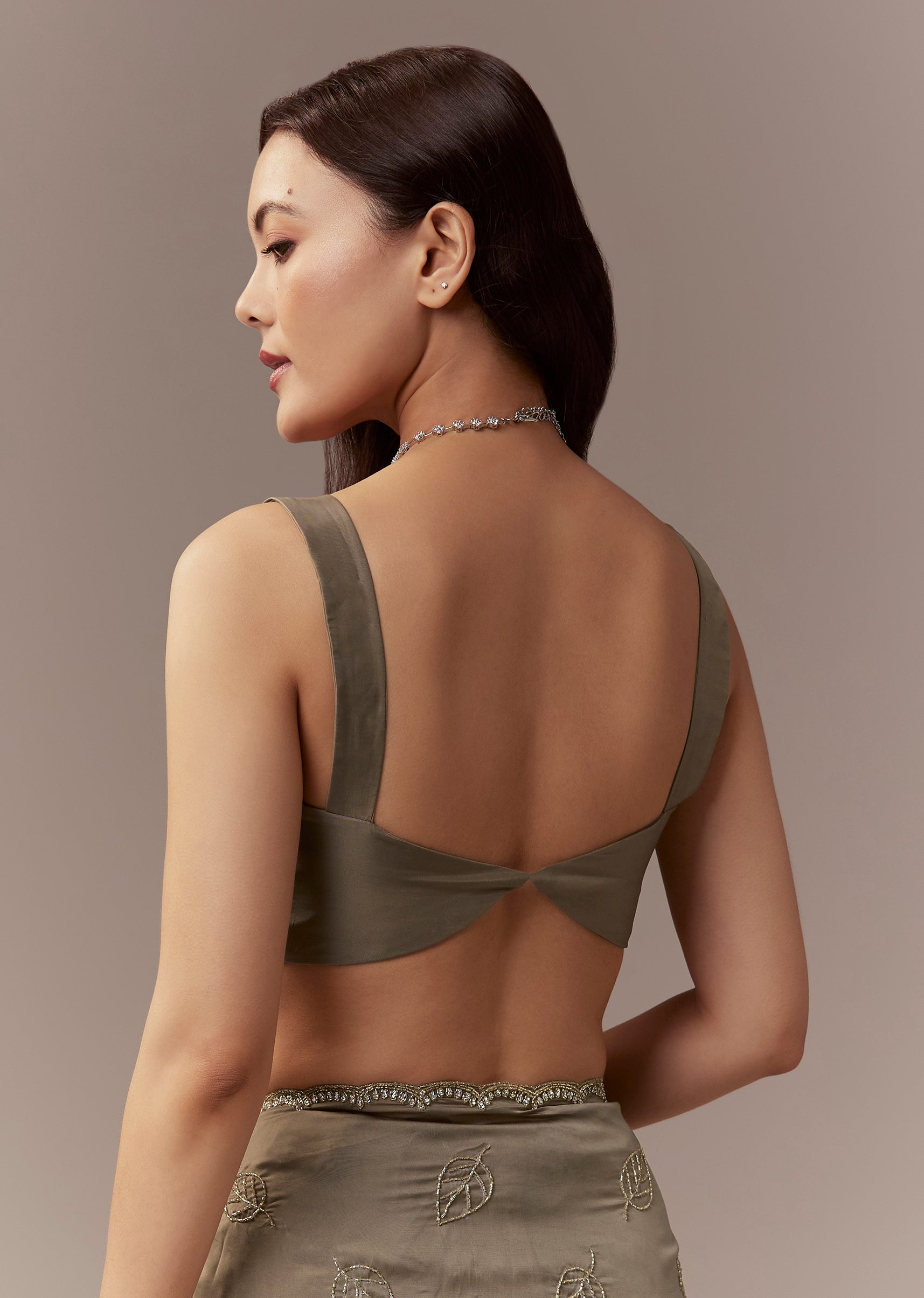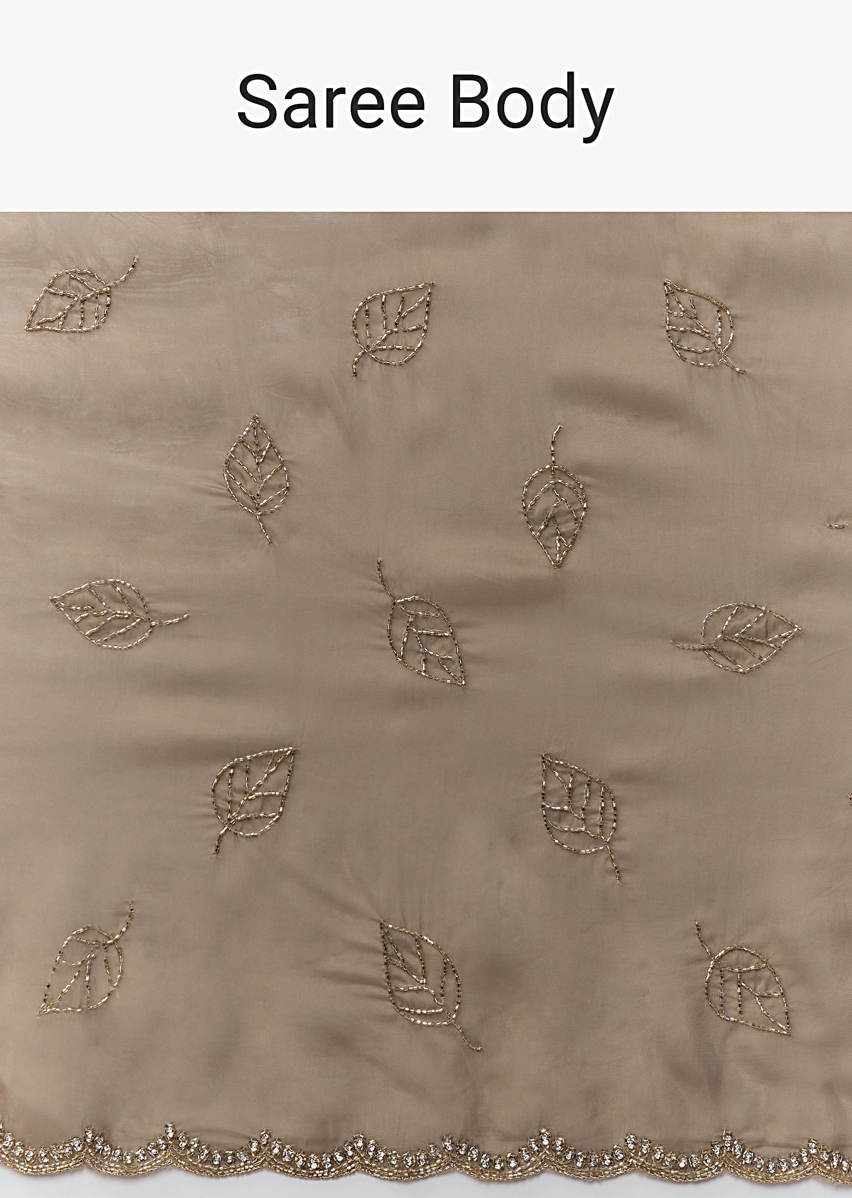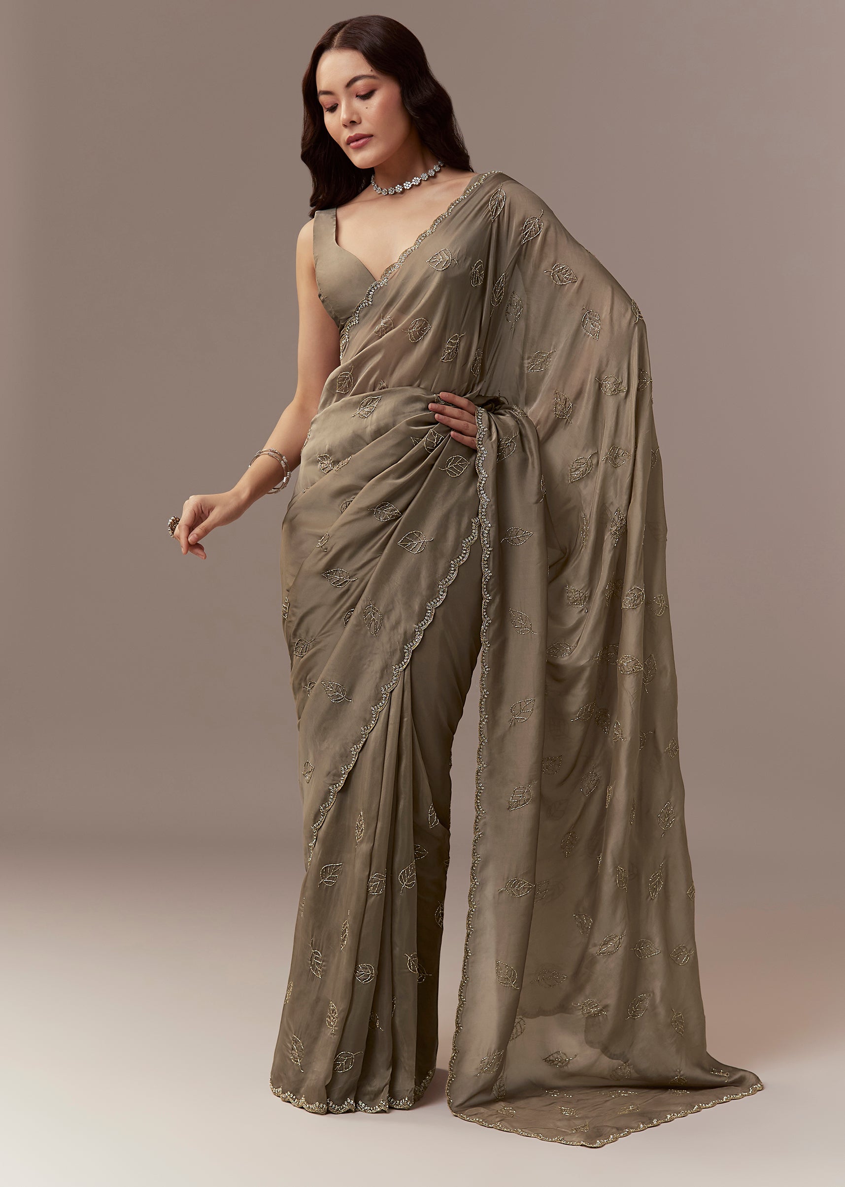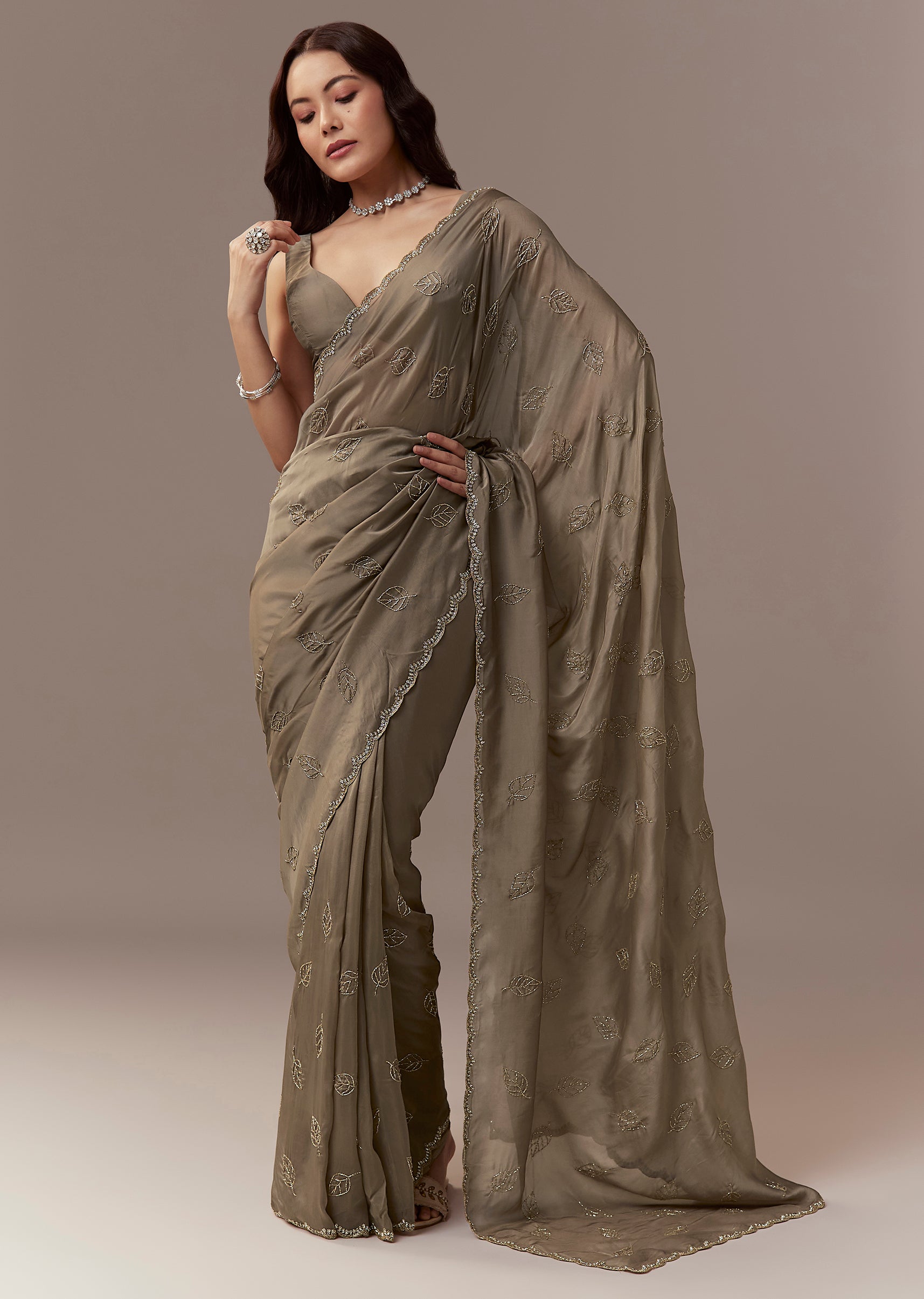 Taupe Brown Kora Silk Saree With Cutdana Stones And Leaf Motif Embroidery