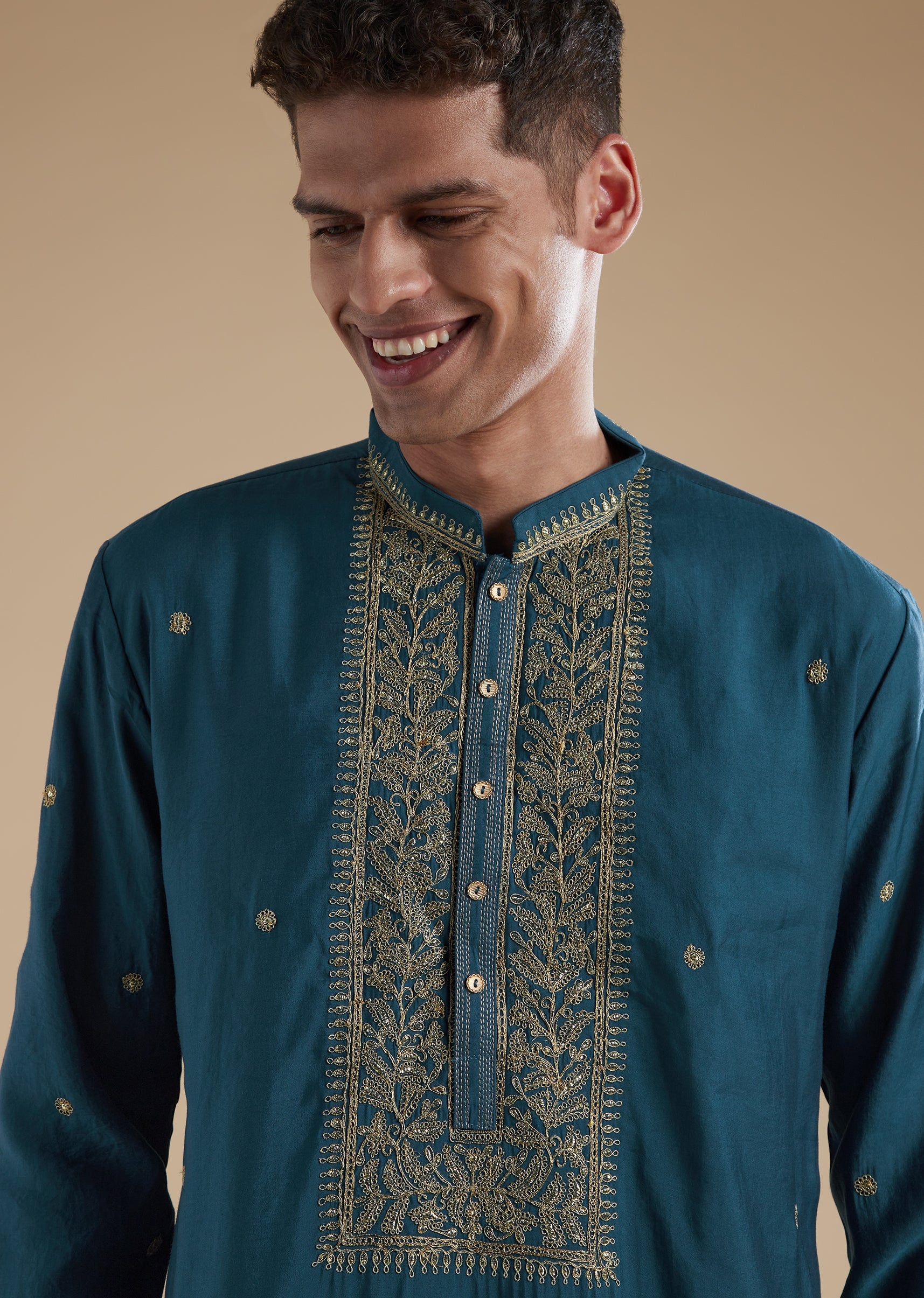 A vibrant teal blue kurta set crafted in silk as the primary fabric with art silk as the secondary for a smooth, festive finish. The kurta is elevated with fine thread and resham detailing that adds depth without overpowering the look. Designed with a mandarin collar, full sleeves, and front button closures on both the kurta and the pants, this set brings together tradition and modern polish perfect for festive celebrations.