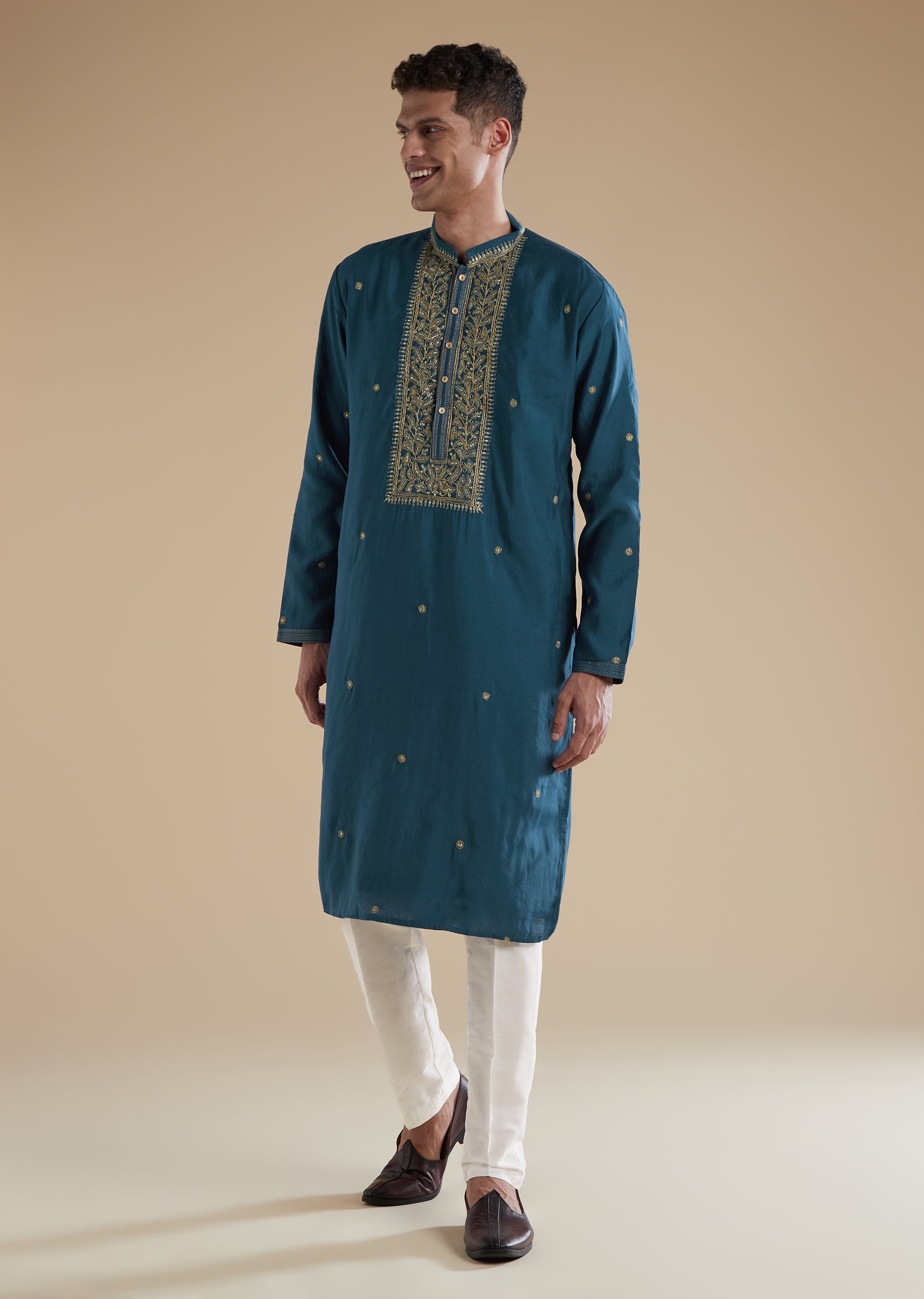 A vibrant teal blue kurta set crafted in silk as the primary fabric with art silk as the secondary for a smooth, festive finish. The kurta is elevated with fine... More Product Details
