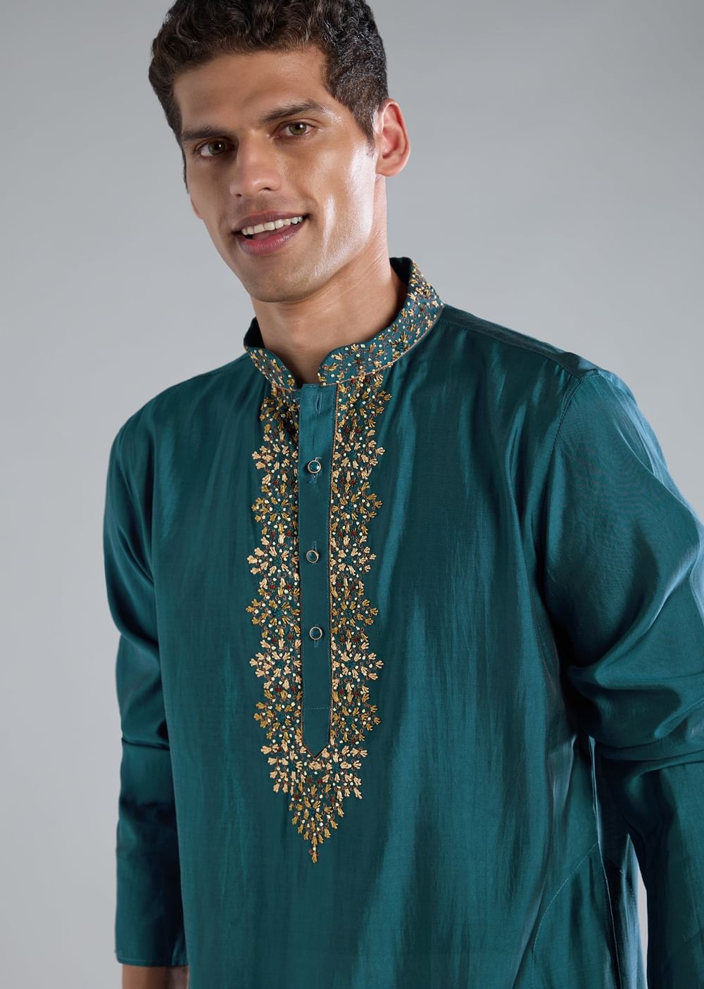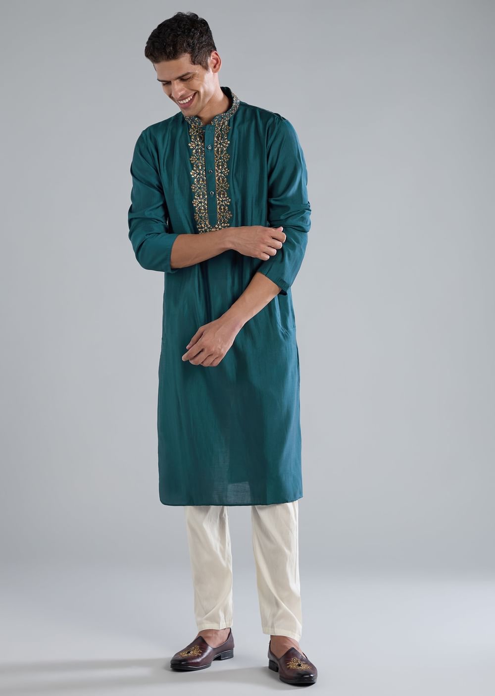Vibrant and statement making, this teal blue kurta set brings a fresh color pop crafted on smooth silk fabric. Intricate thread resham and French knot detailing add texture and elevate its festive appeal. The full sleeves and mandarin collar give it a sharp, refined structure while the front button closure keeps the look classic. Paired with coordinated pants, this set is ideal for celebrations where comfort and modern elegance come together. Slight variation in color is possible due to photography. Awarded as the Most Trusted Brand, we're delivering styles you love, just as promised.