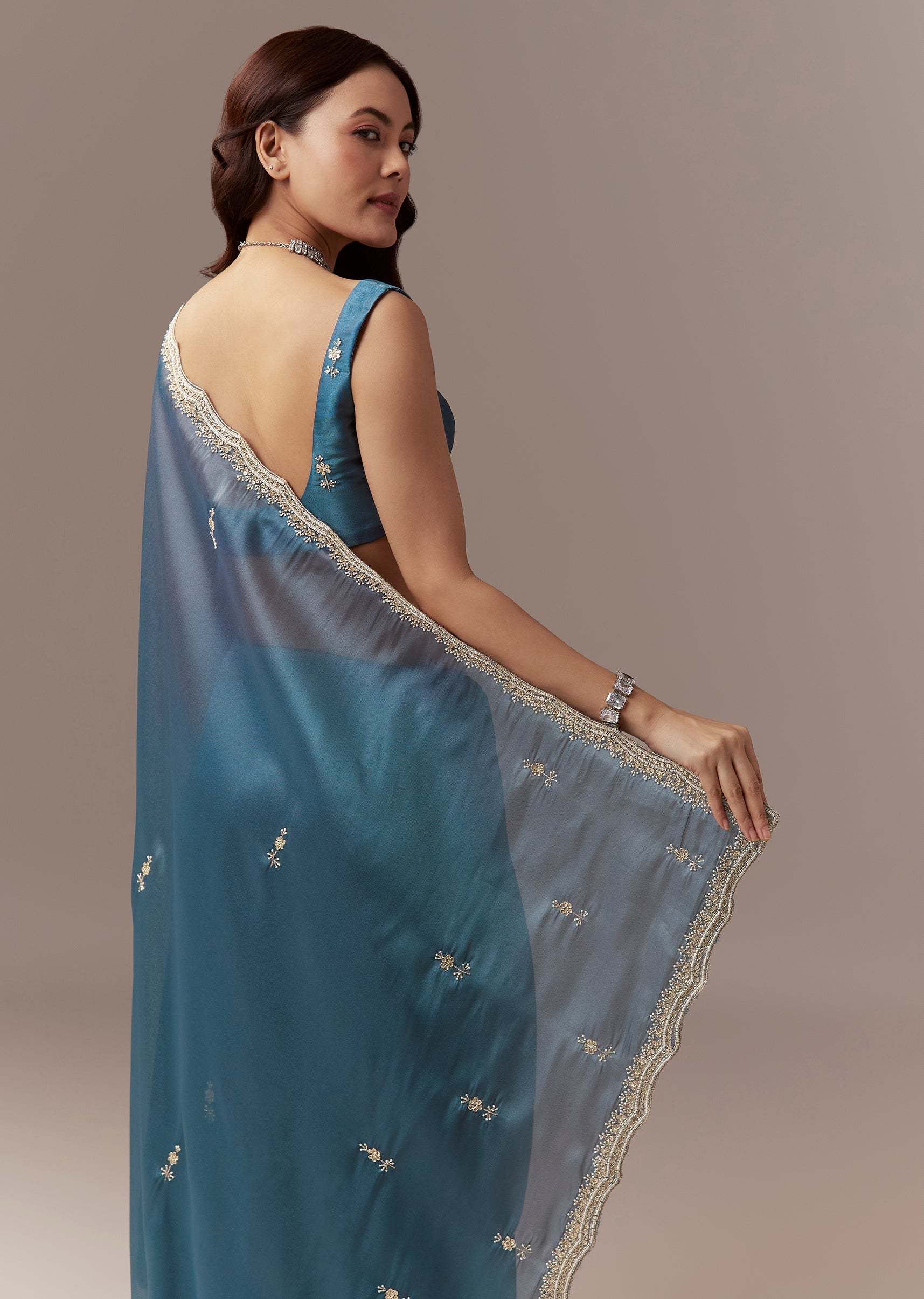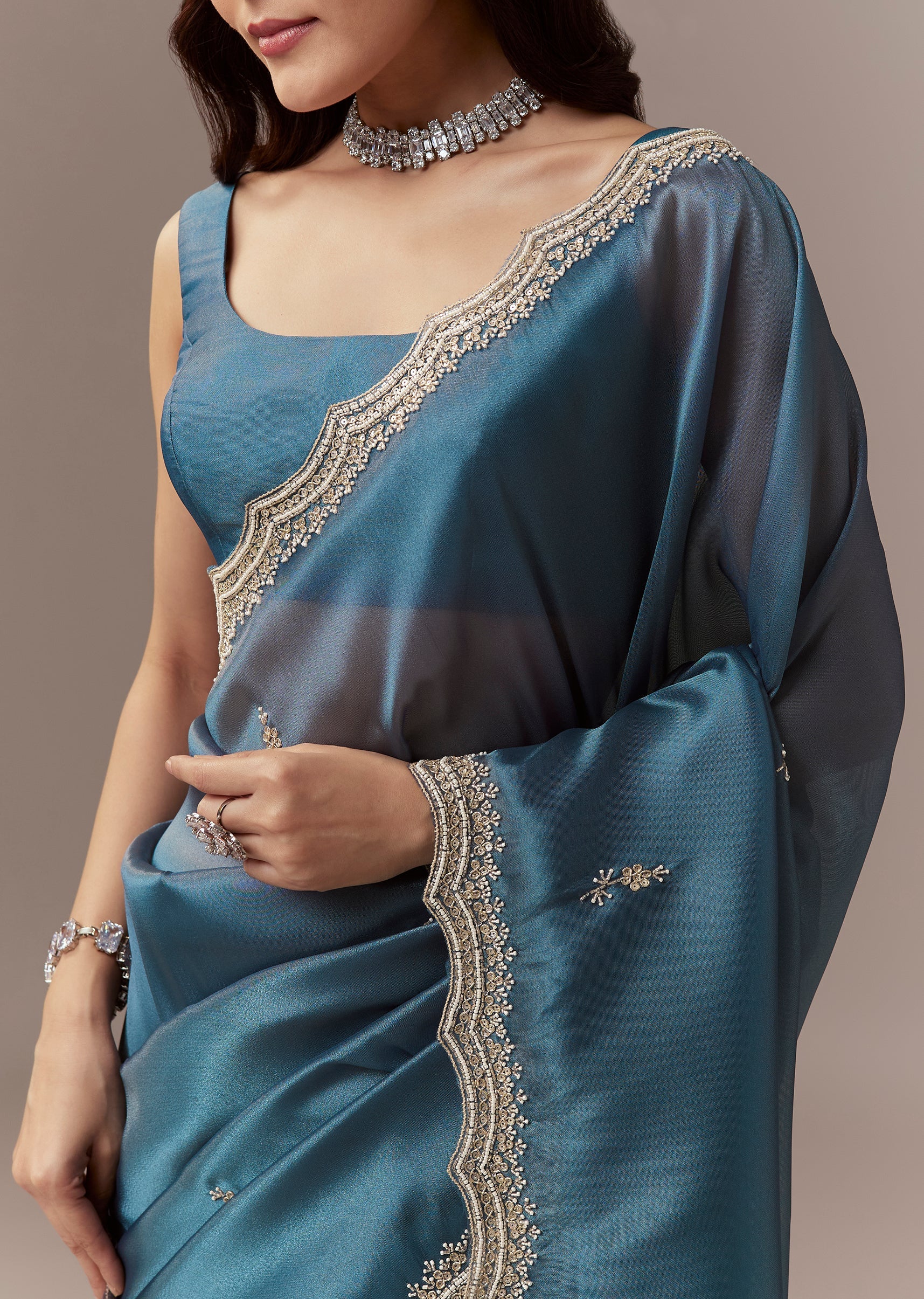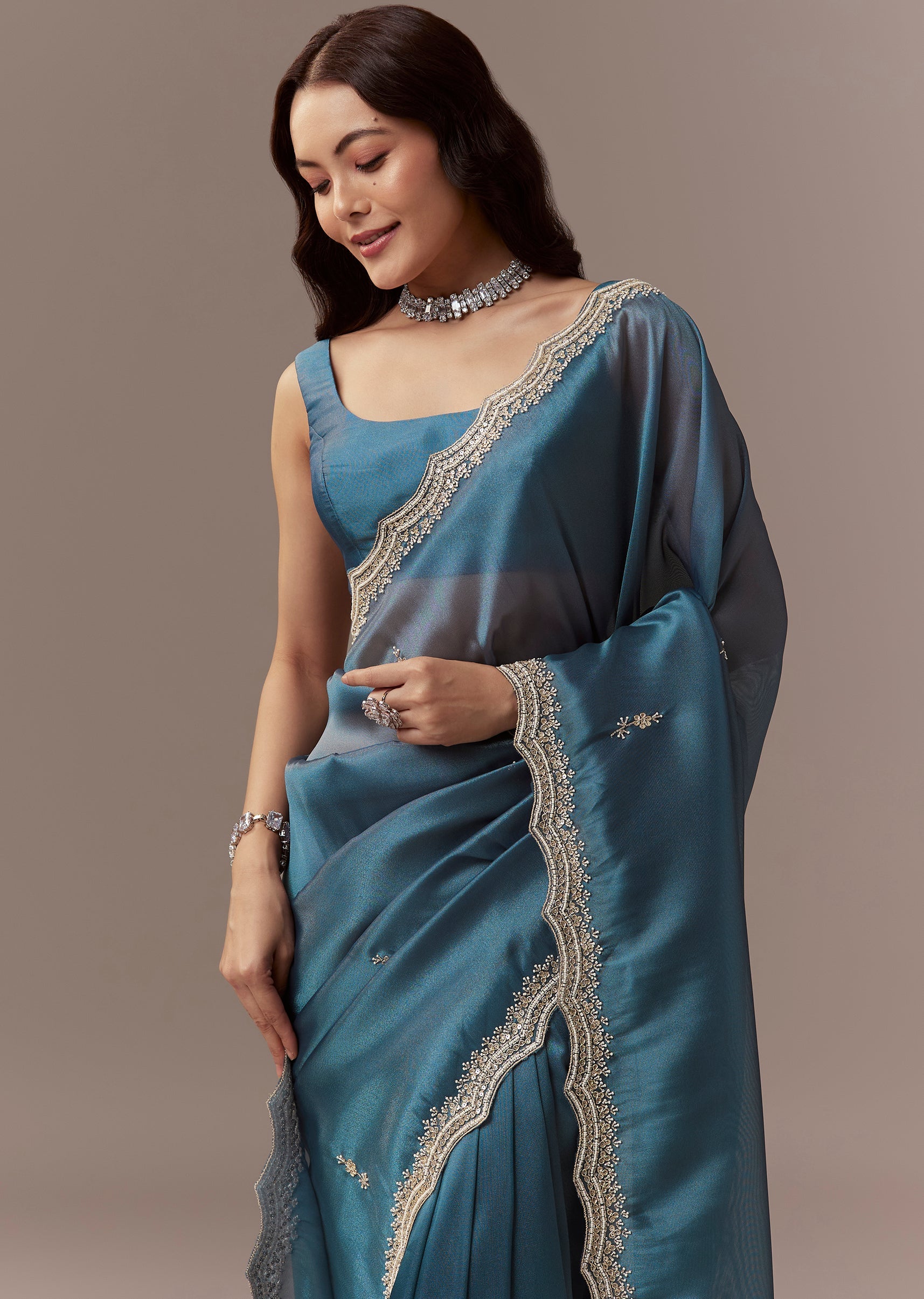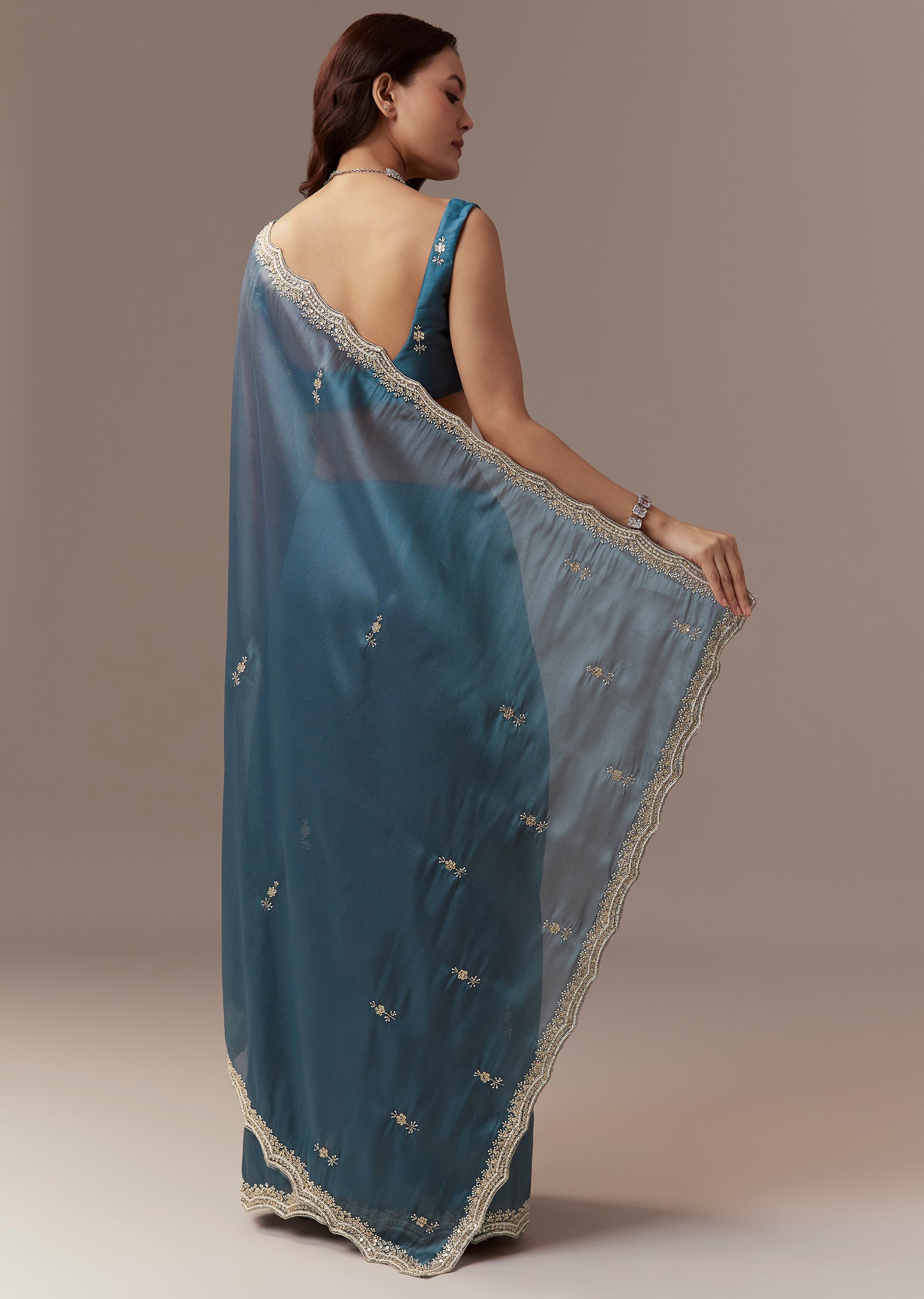 Teal Blue Organza Saree With Cutdana Beads And Sequin Embroidery