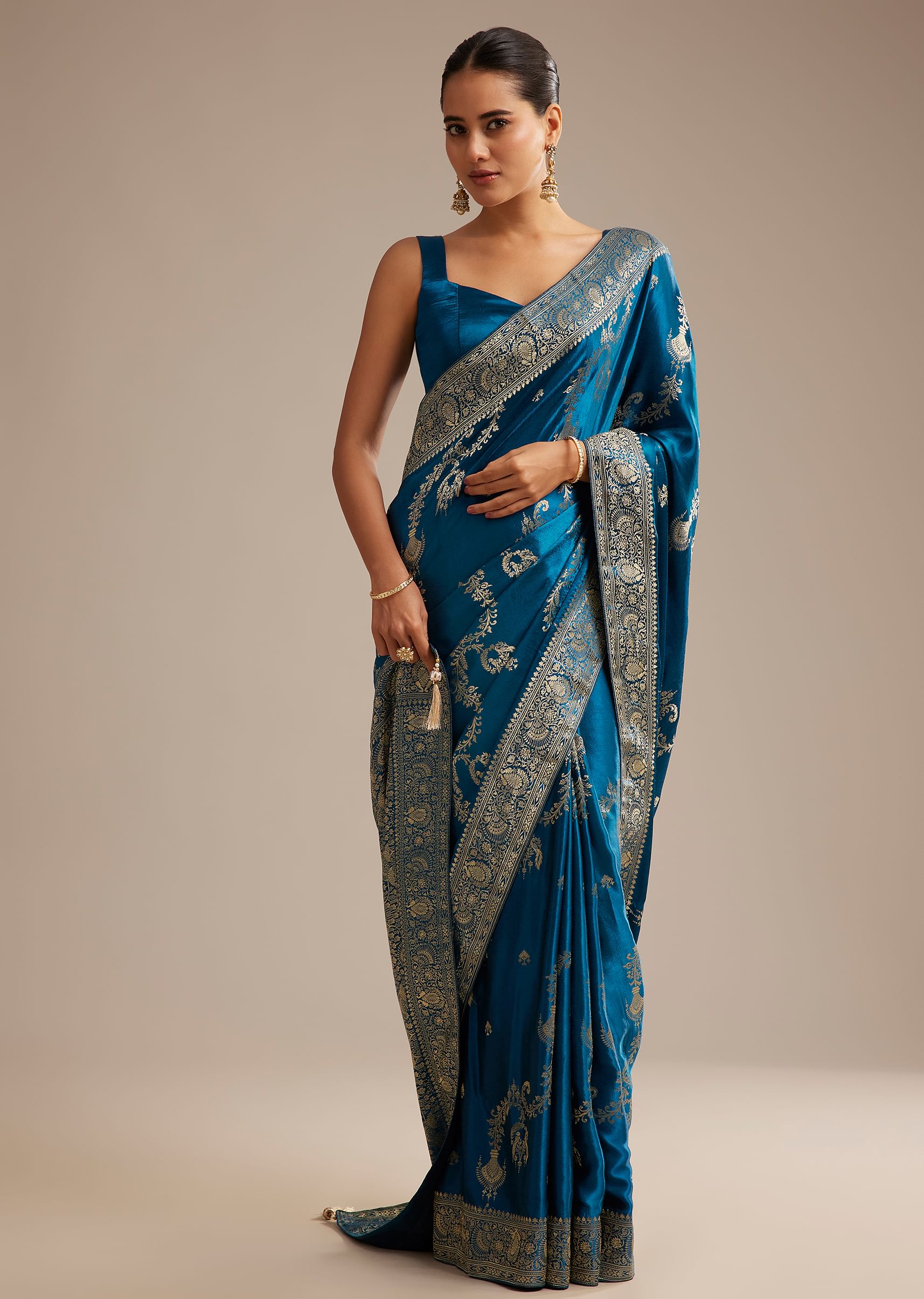 This exquisite satin saree in a captivating teal blue shade features delicate, intricately woven zari work. The lustrous fabric and contemporary design make it ideal for festive gatherings, weddings, and special occasions where tradition meets modern elegance. Awarded as the Most Trusted Brand, we're delivering styles you love, just as promised.