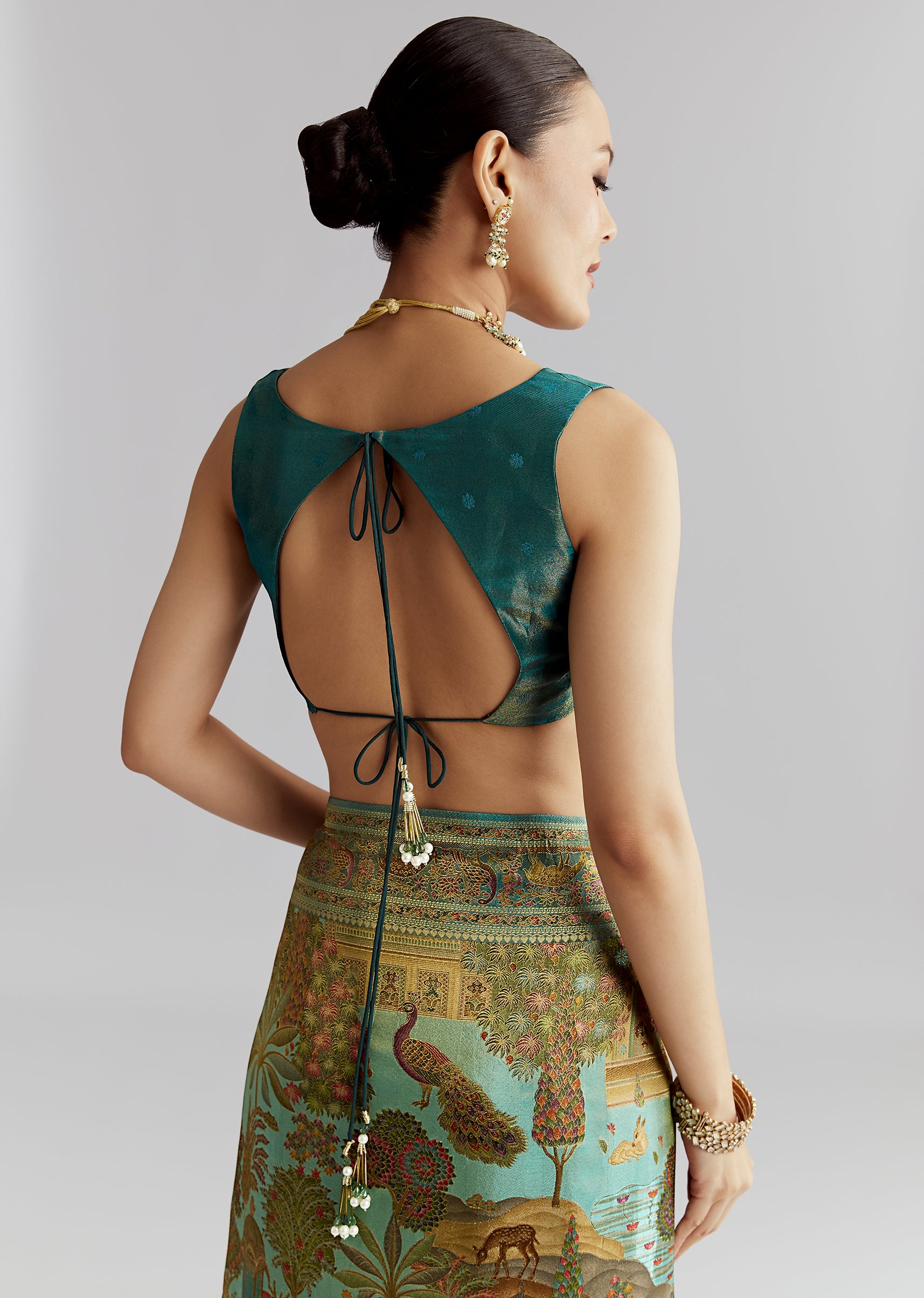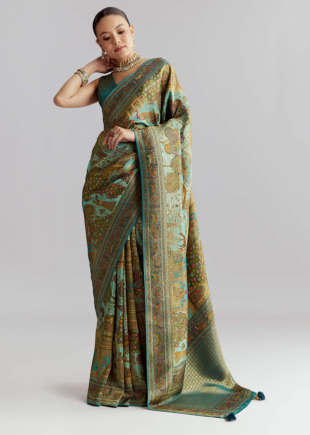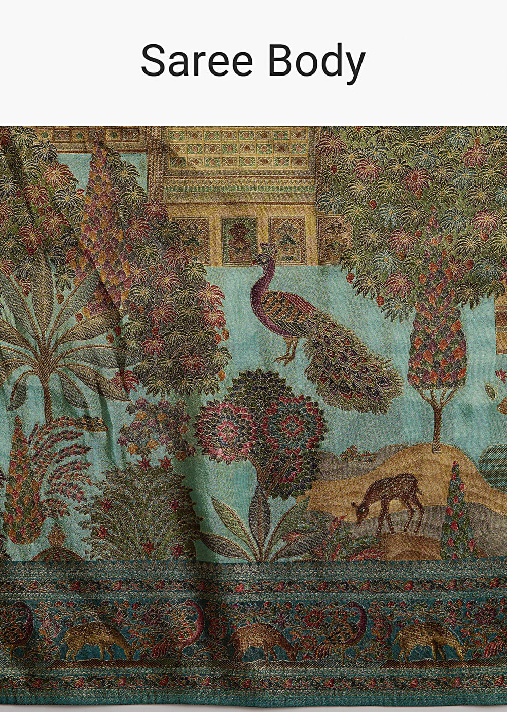 Teal Blue Satin Silk Woven Saree With Digital Historical Print