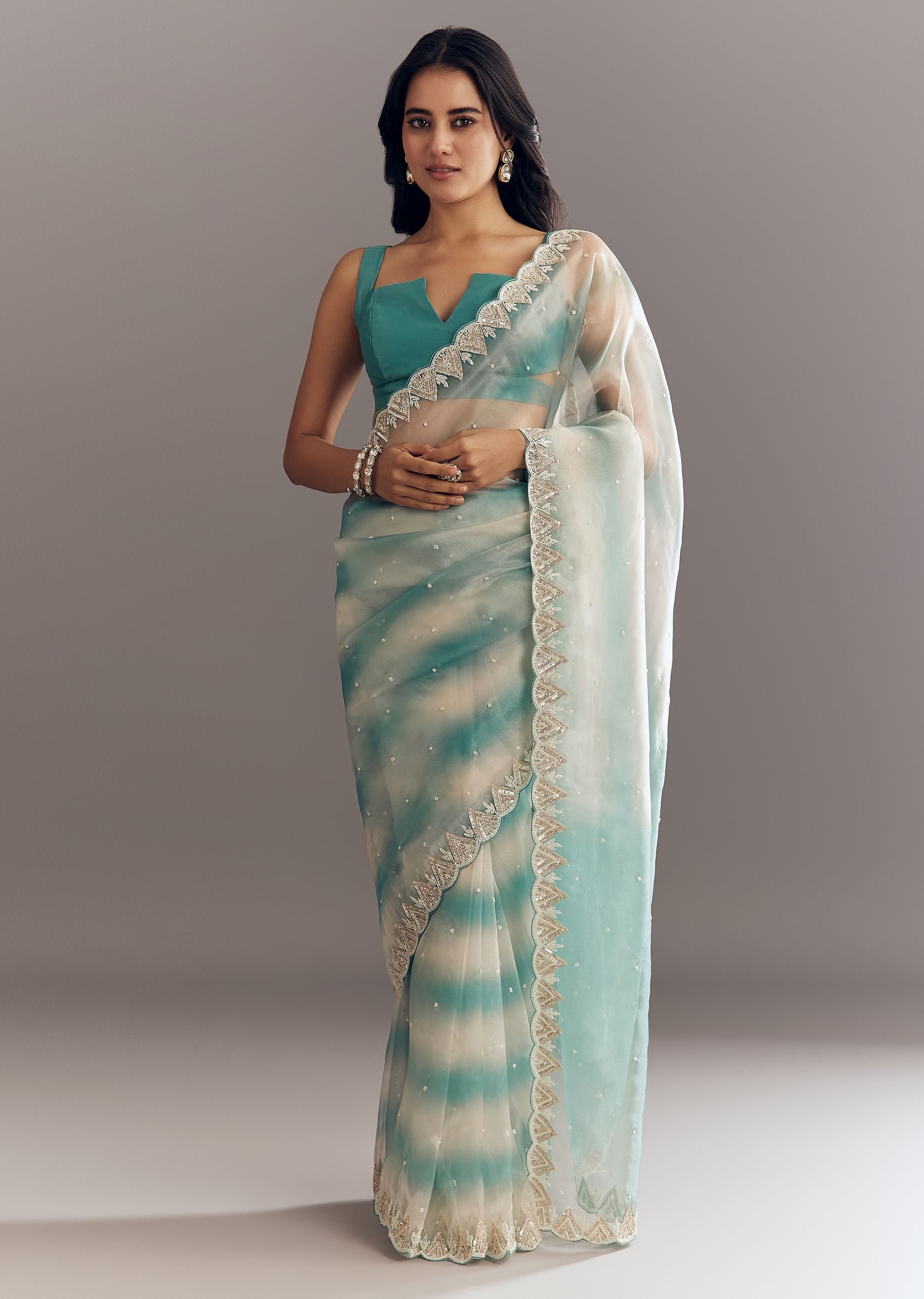 Teal Blue Shaded Organza Saree With Moti Stone Sequins Embroidery And Cutwork Scallop Border