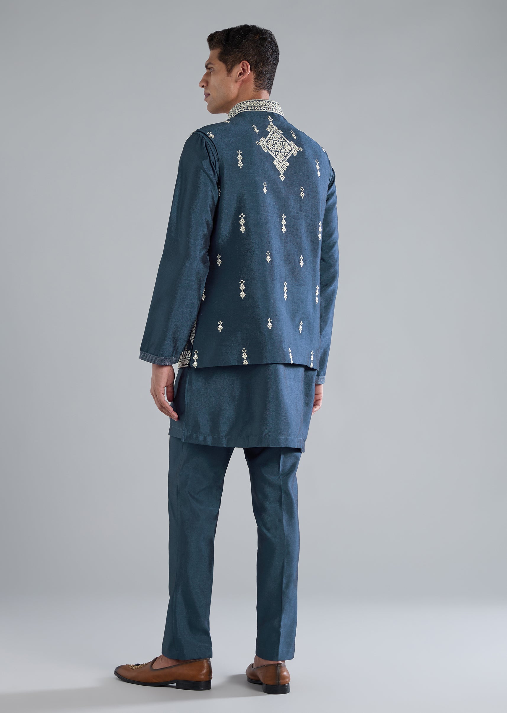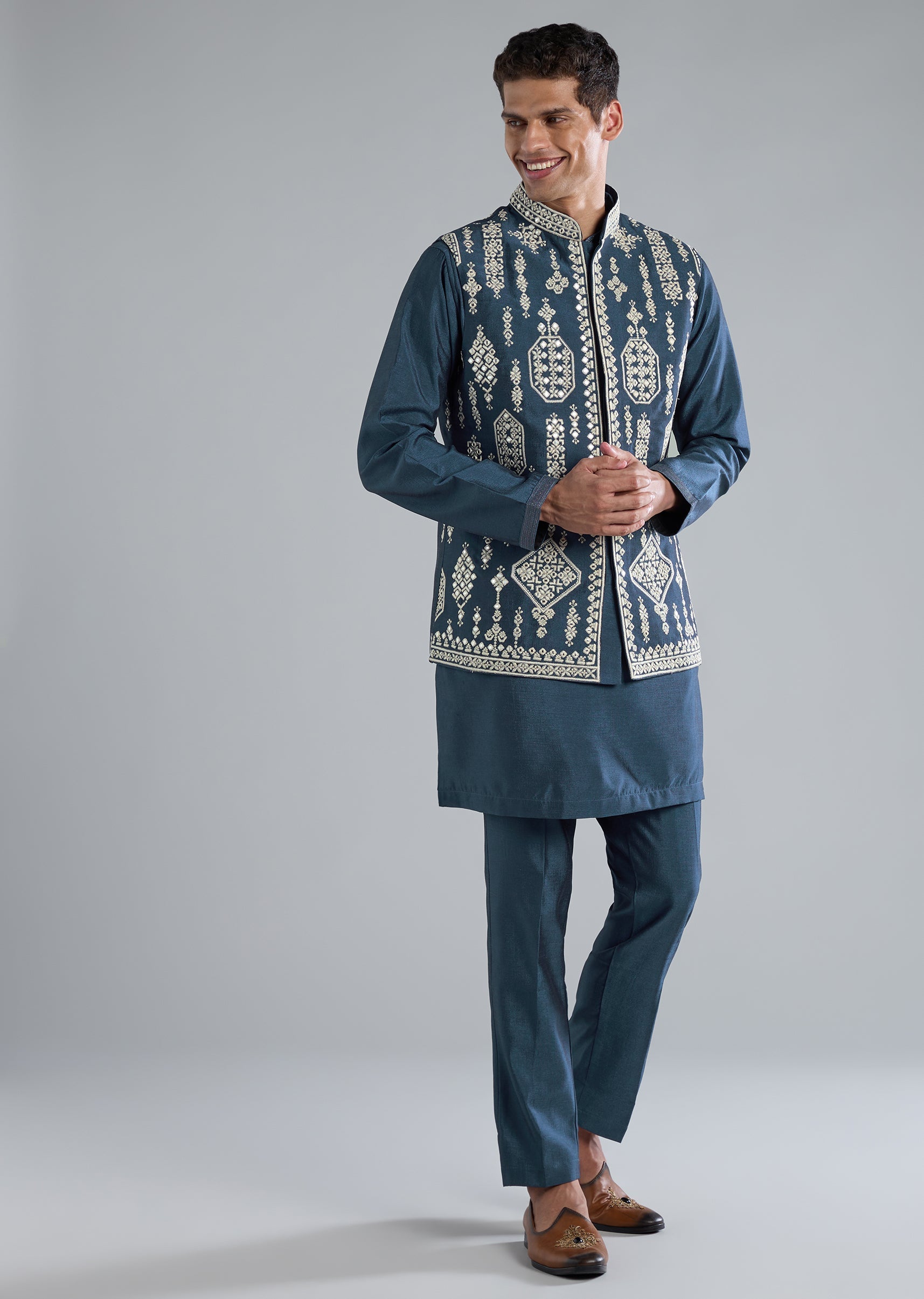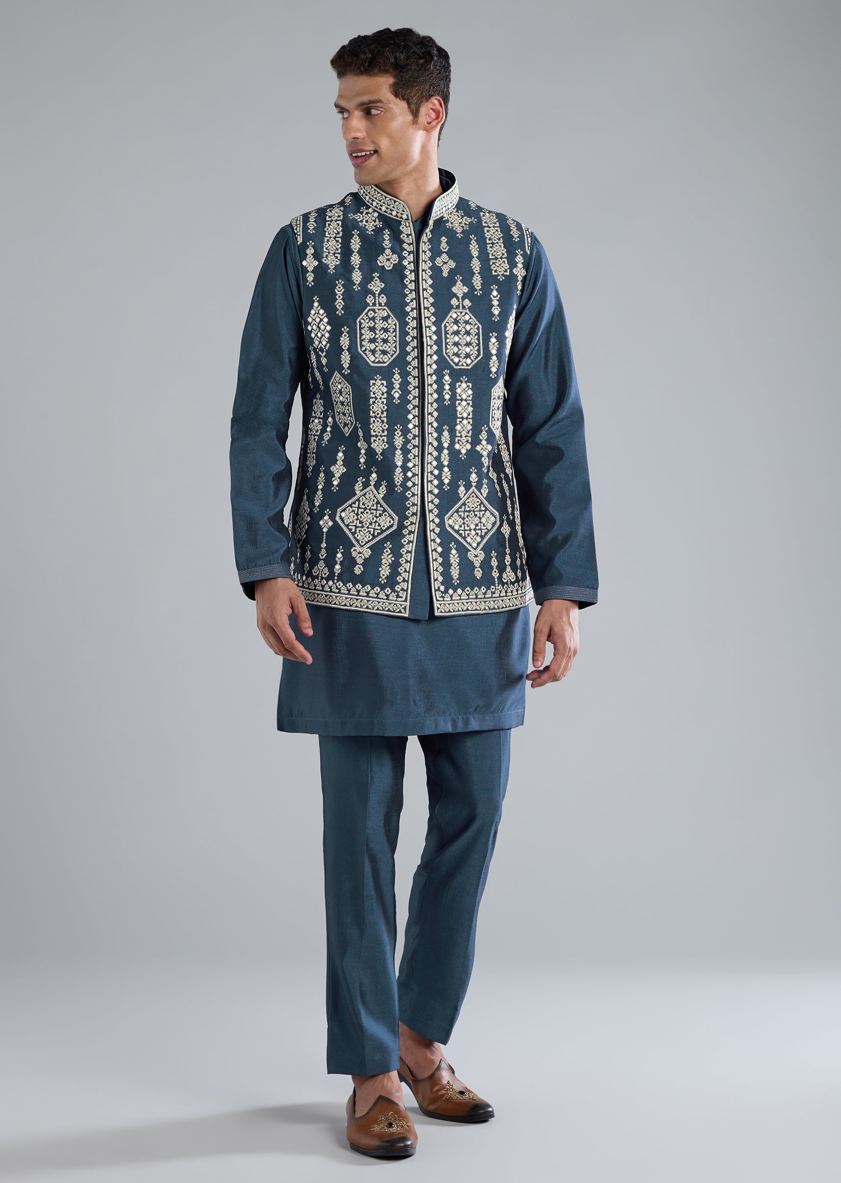 A refined blend of modern charm and traditional grandeur, this teal blue kurta jacket set is crafted in luxurious silk for a rich festive appeal. The ensemble features intricate thread... More Product Details