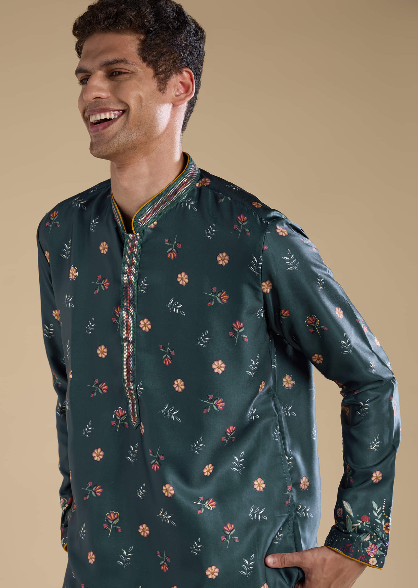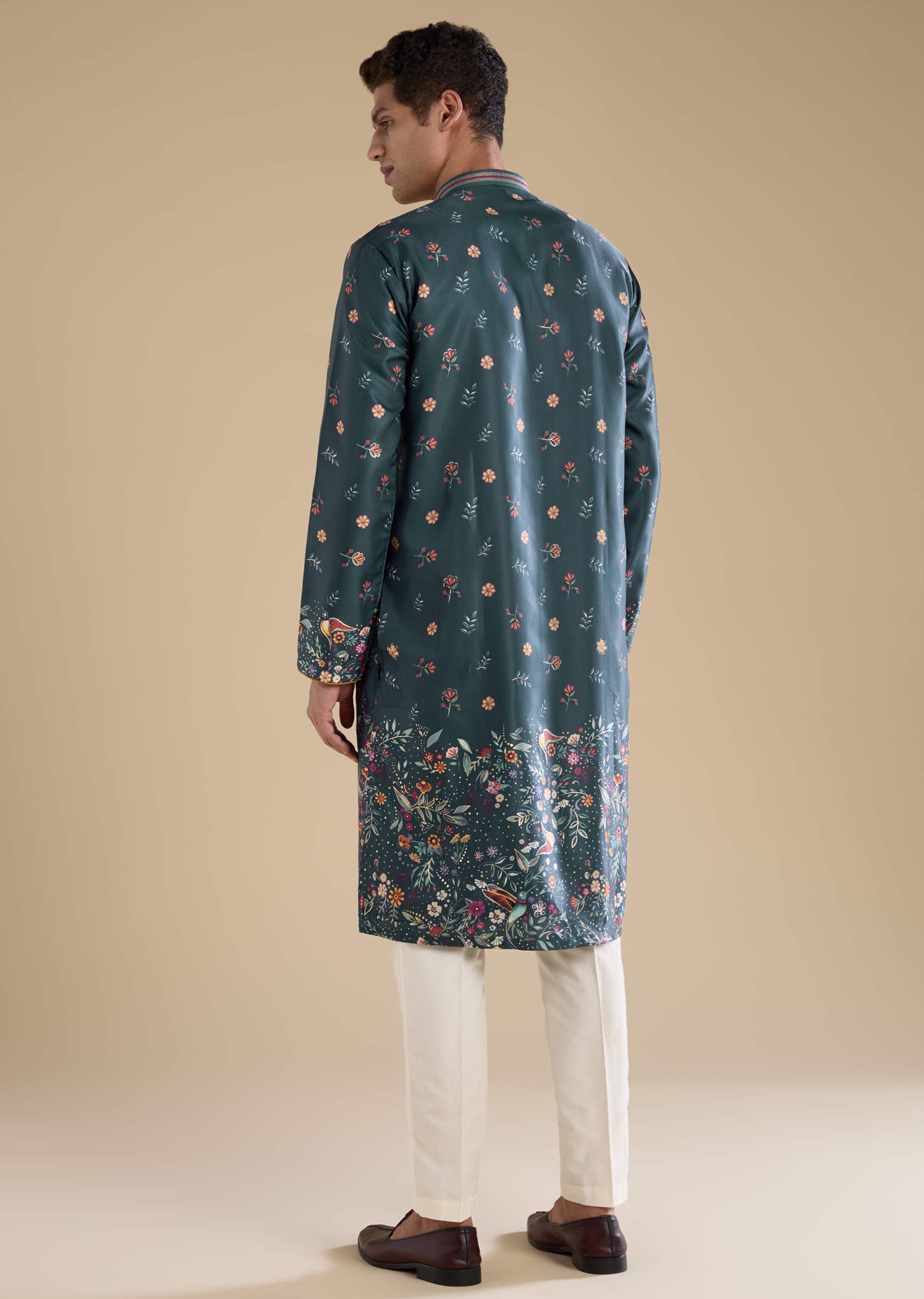 Teal Floral Embroidered Mens Kurta and Pant Set