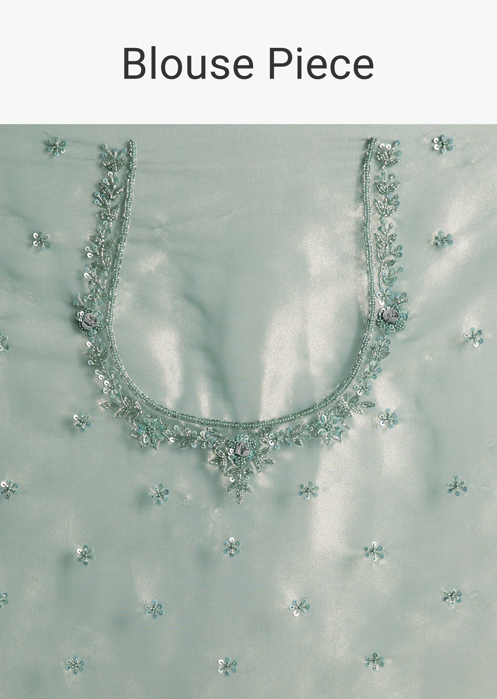 Rich shades always feel striking, and this teal green tissue embroidered saree offers a bold appeal. A detailed cutwork border pairs with floral buttis worked in sequins, beads and cutdana... More Product Details