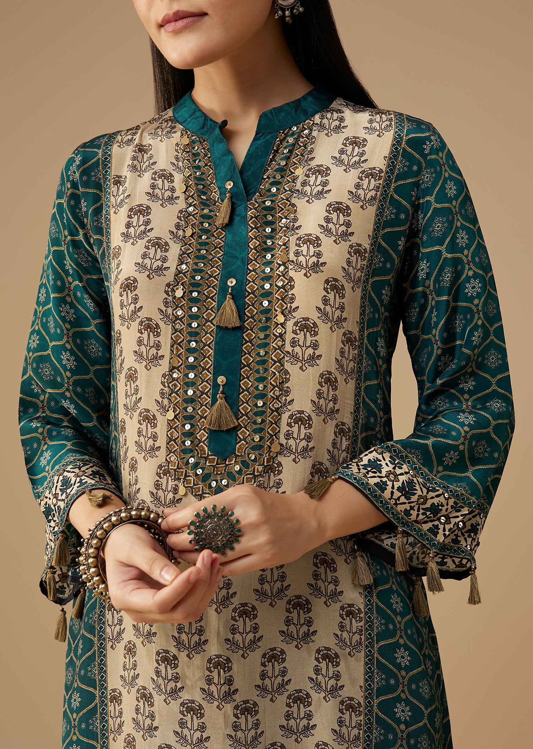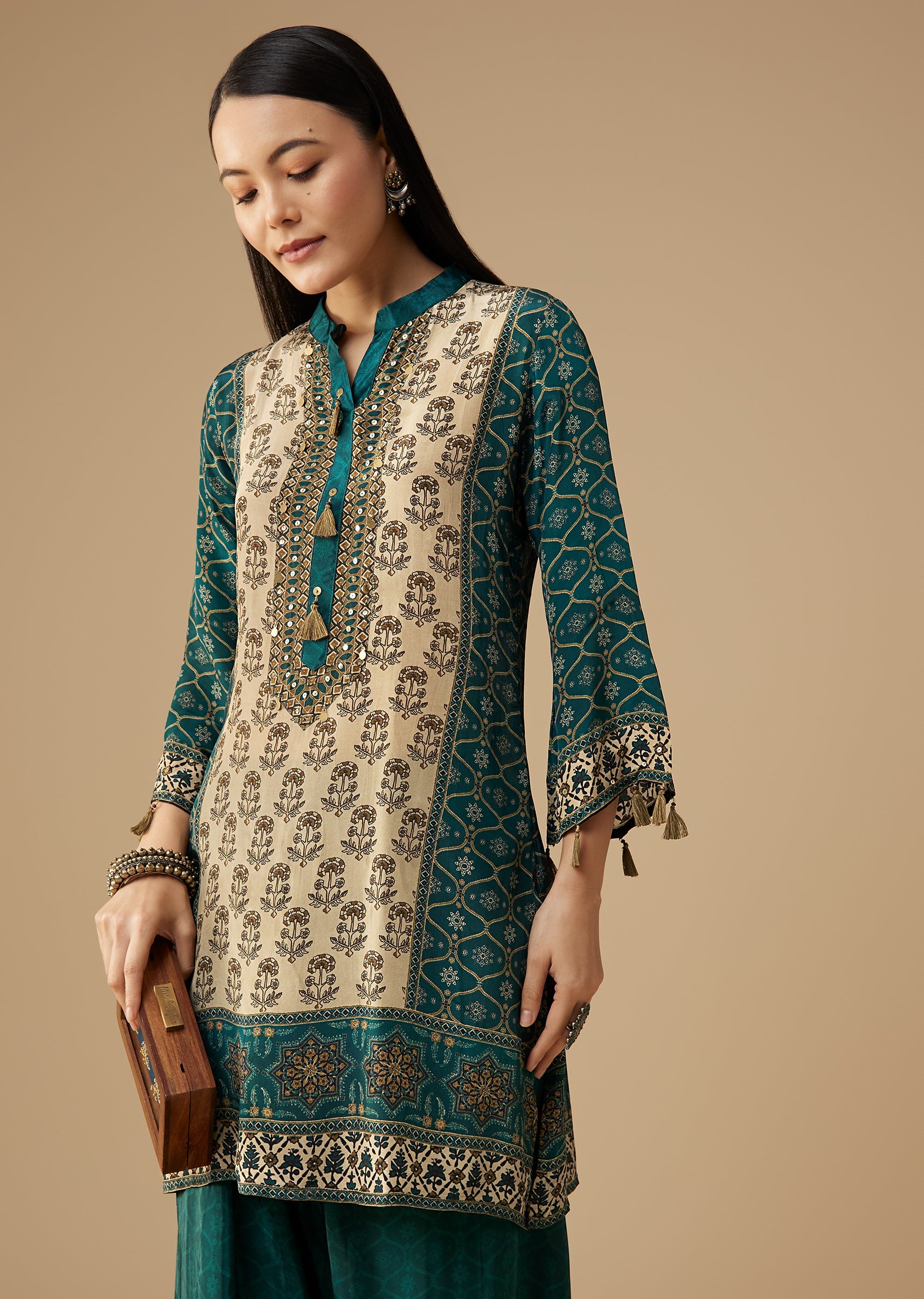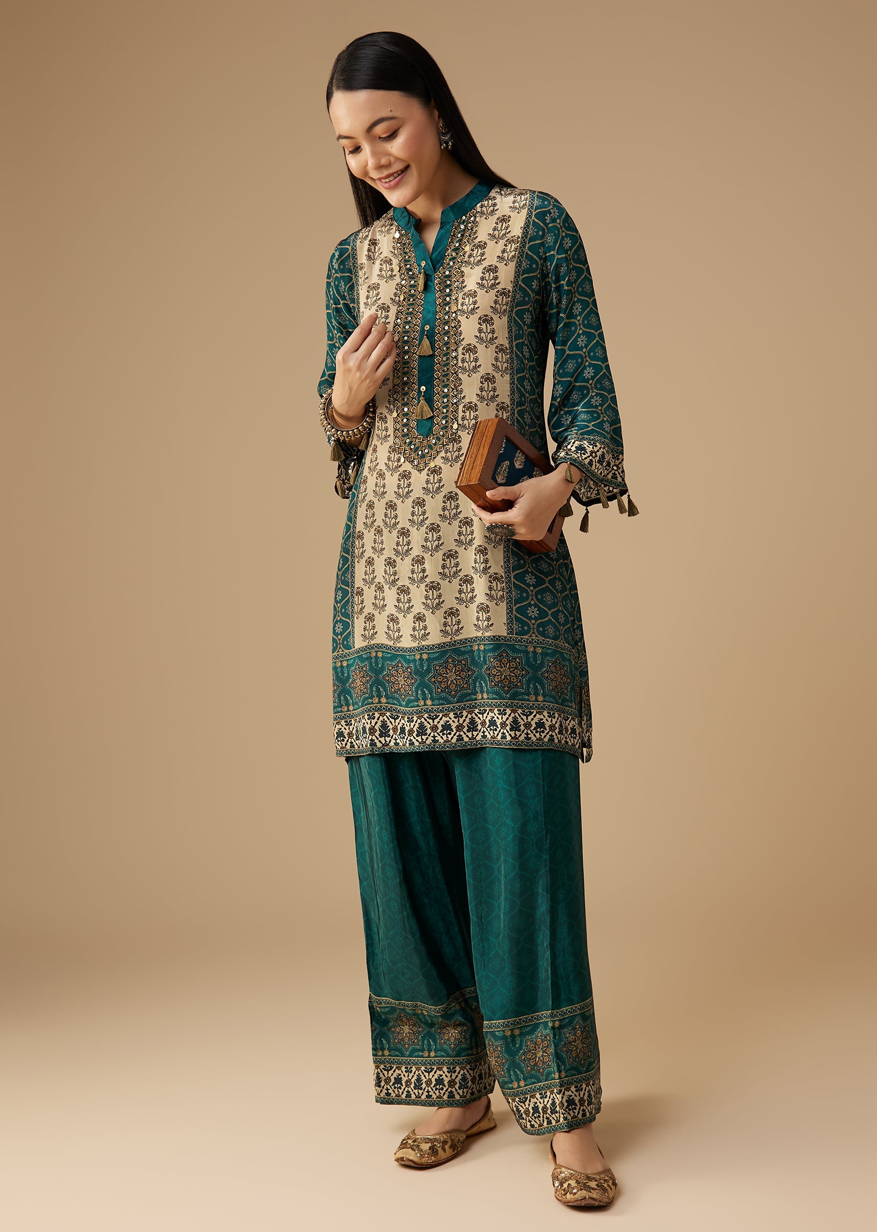 Add a contemporary ethnic touch to your wardrobe with this teal crepe kurta set, featuring indie inspired prints enhanced with delicate sequin accents for a soft festive shimmer. The lightweight... More Product Details