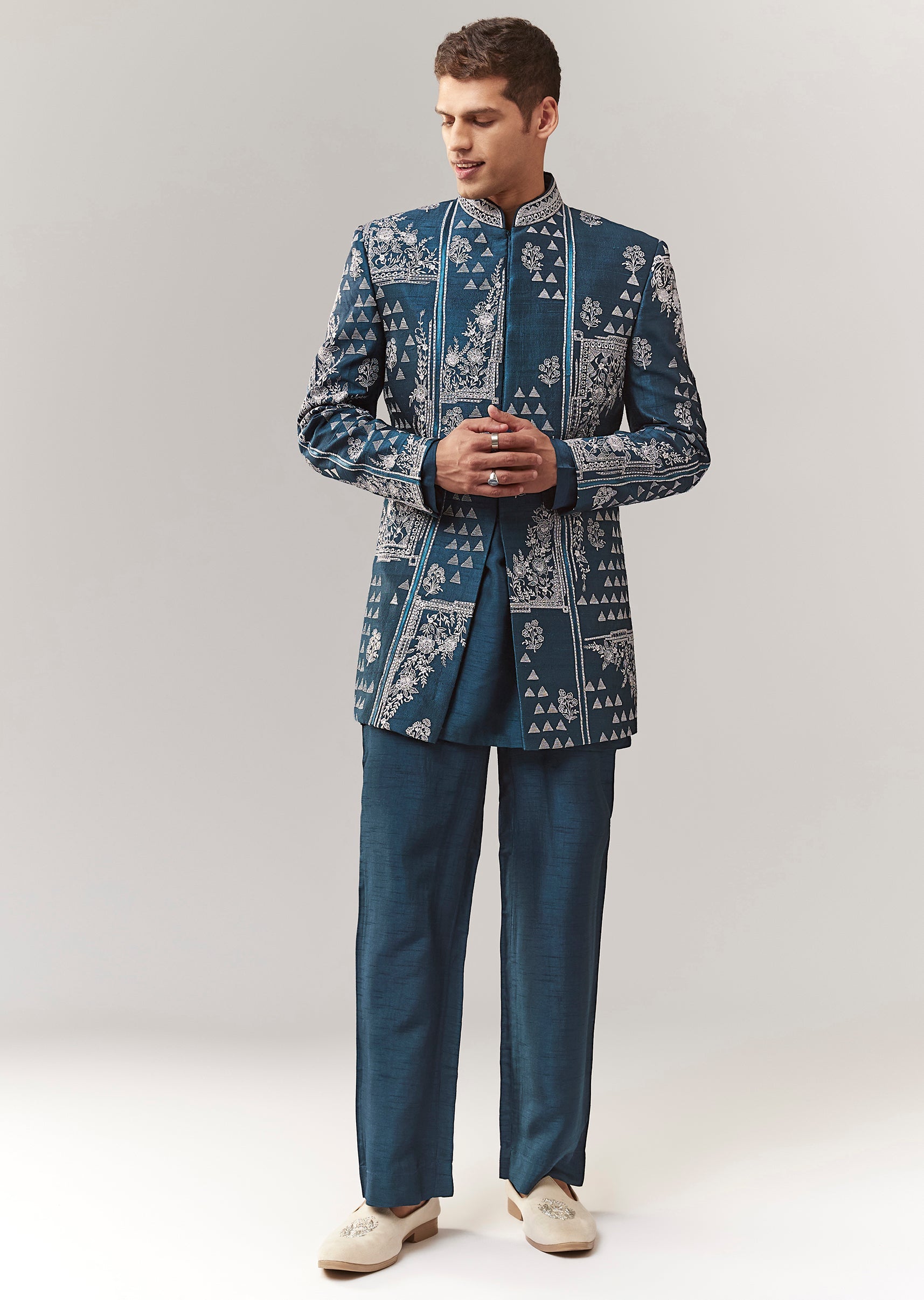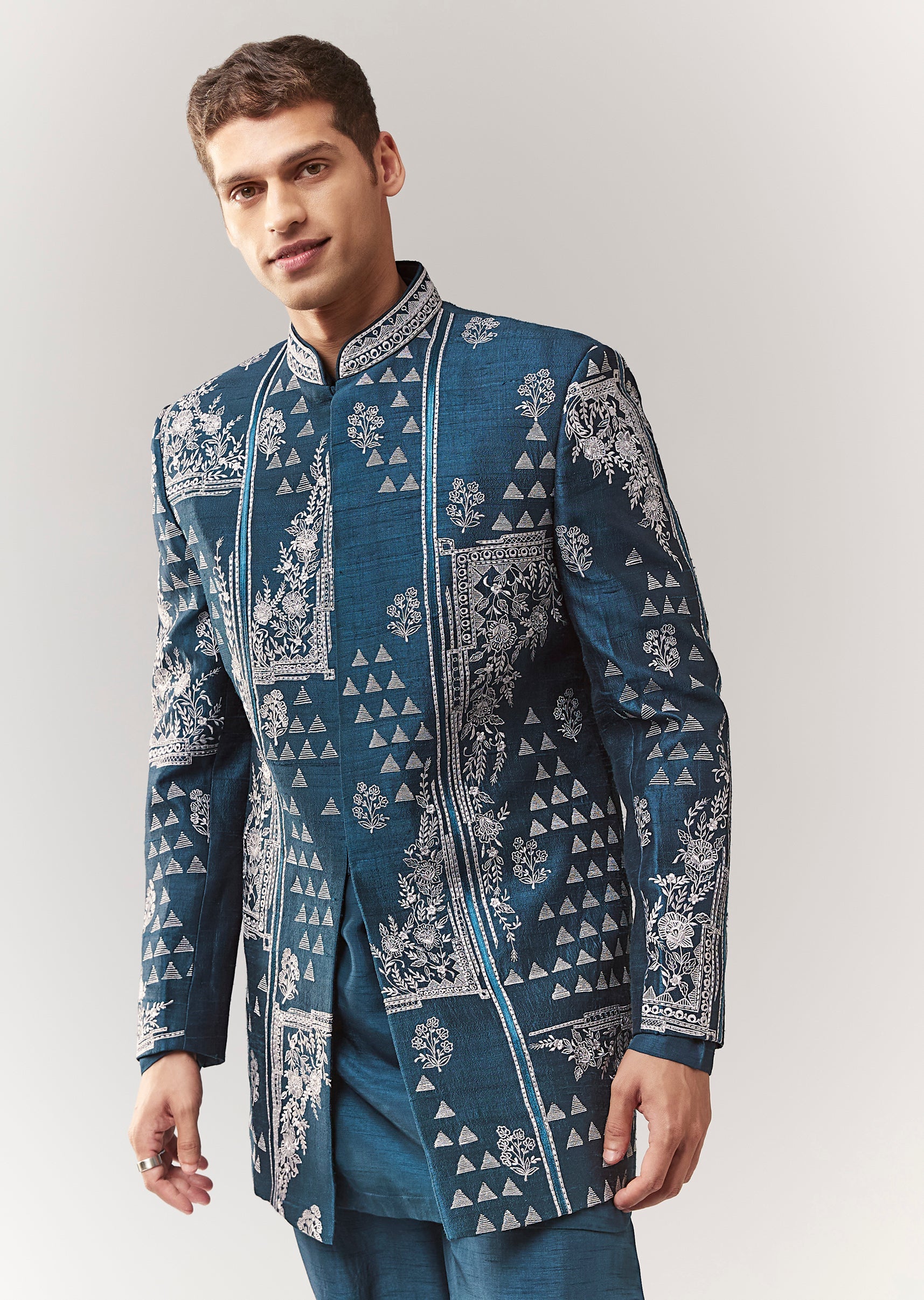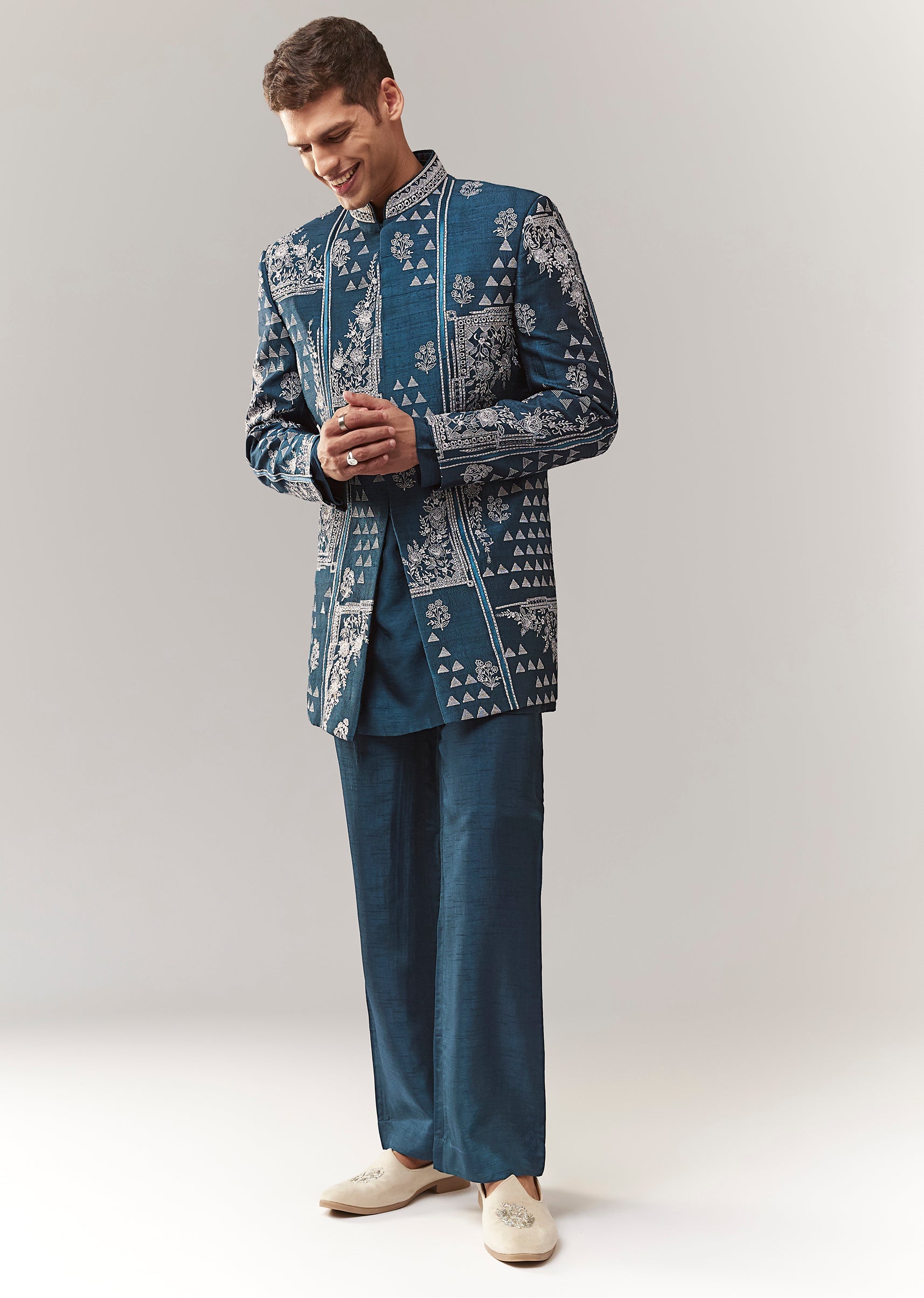 A contemporary silk (rawsilk) indo-western set in teal with thread/resham detailing. Mandarin collar, full sleeves, and front hook-eye closure. Includes kurta/jacket styling with straight pants (mid-waist). Great for mehendi, engagement,... More Product Details