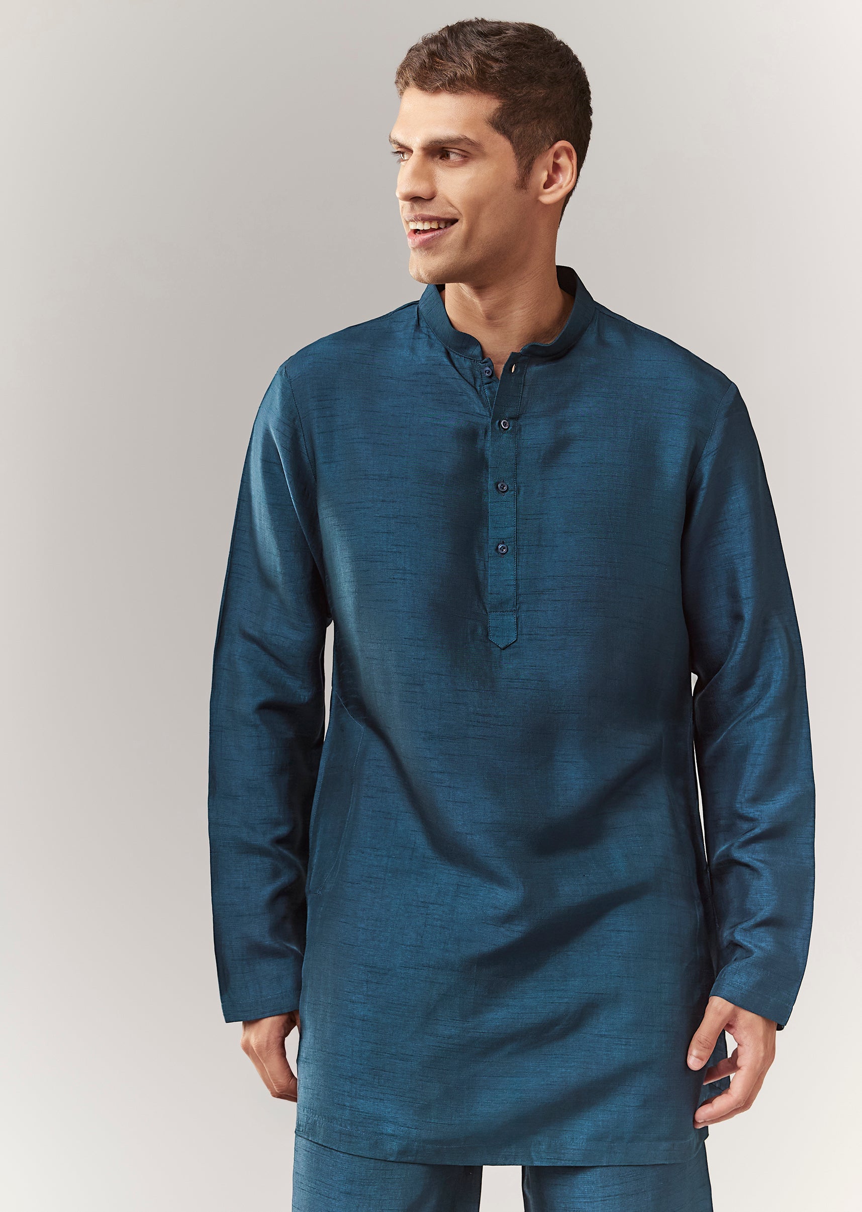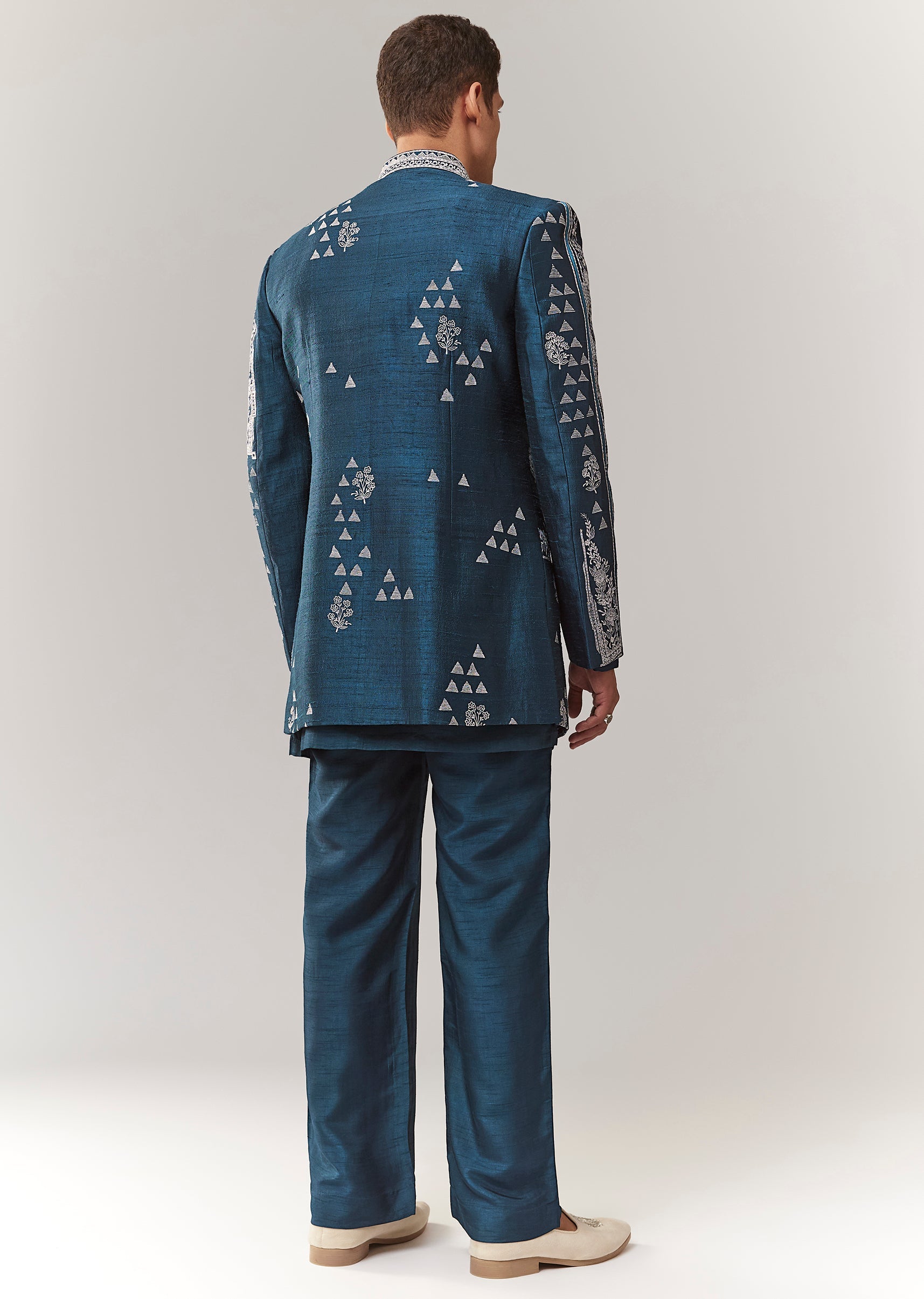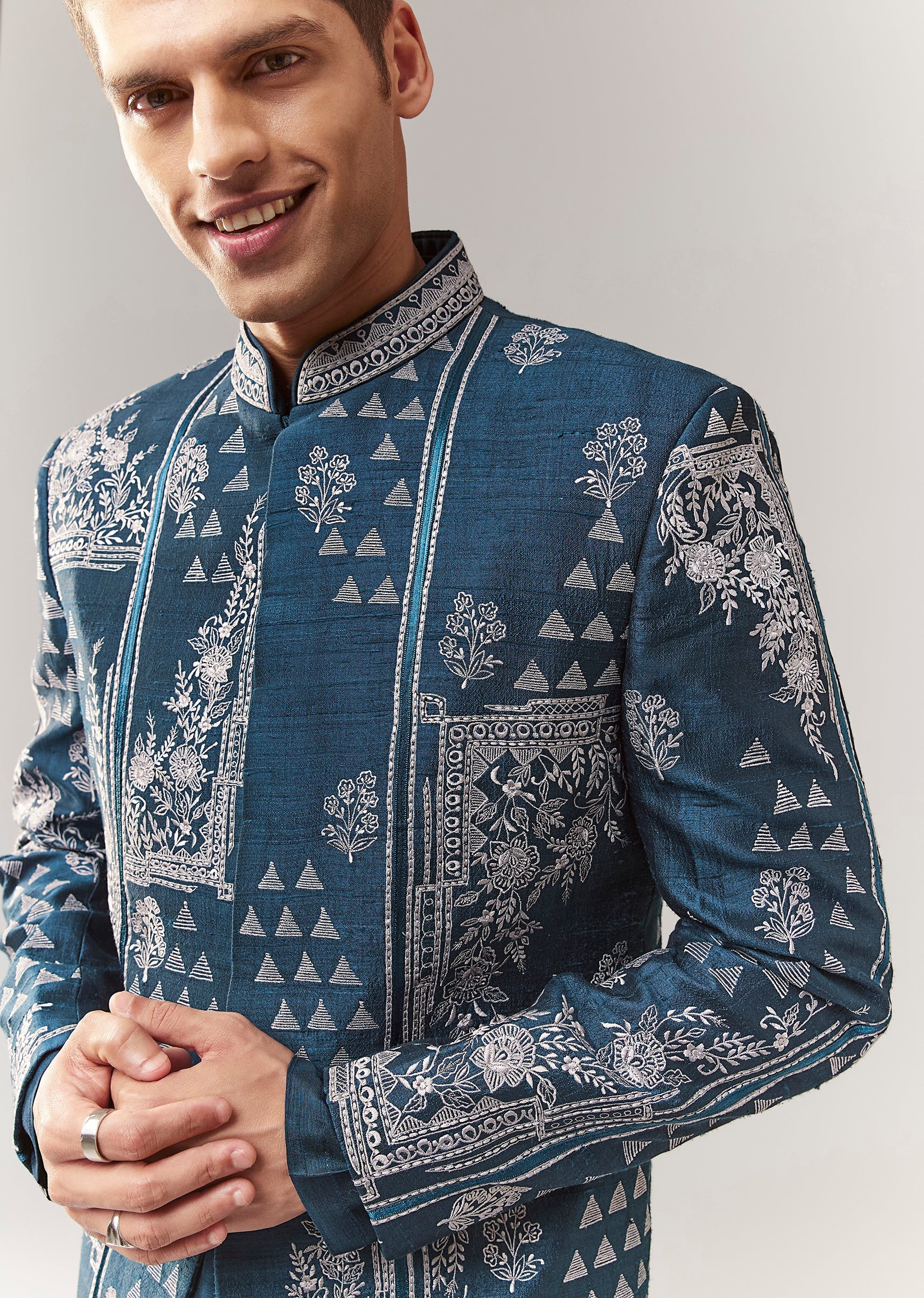 A contemporary silk (rawsilk) indo-western set in teal with thread/resham detailing. Mandarin collar, full sleeves, and front hook-eye closure. Includes kurta/jacket styling with straight pants (mid-waist). Great for mehendi, engagement,... More Product Details