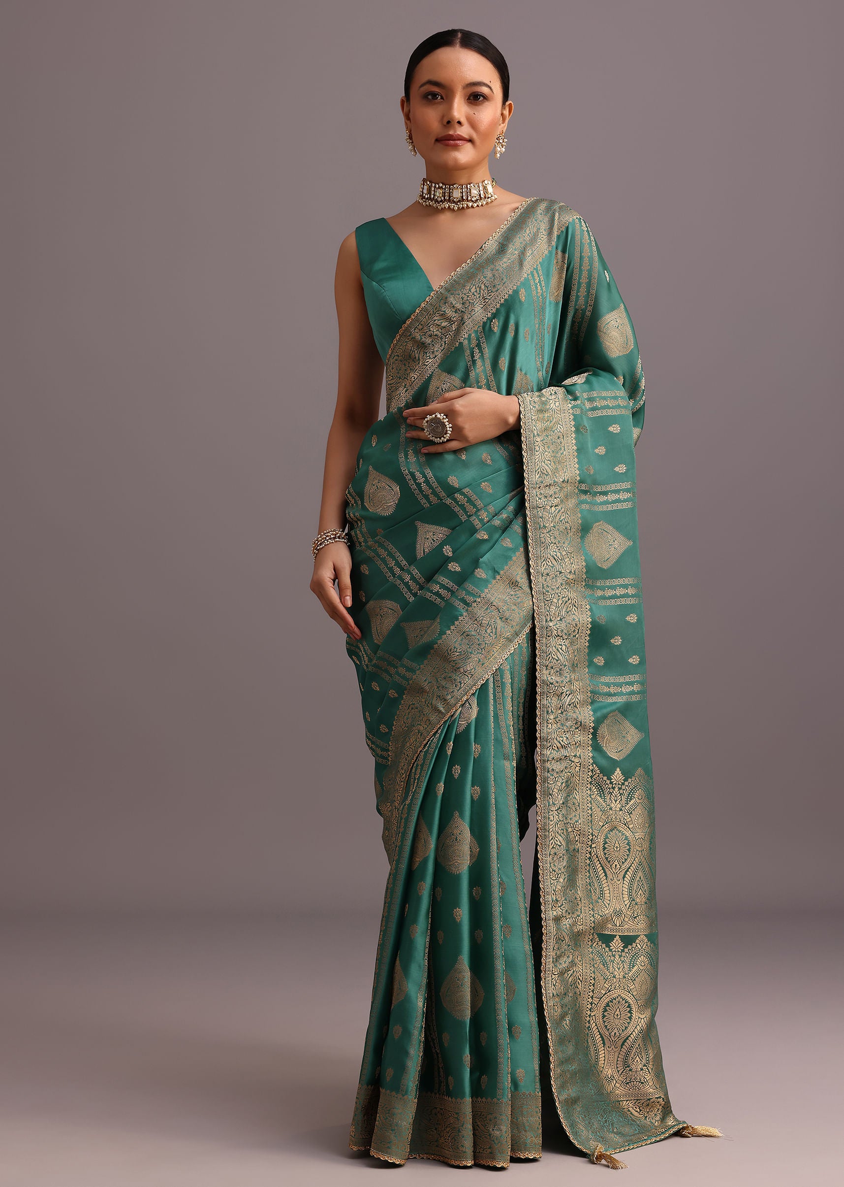Teal Zari Work Satin Silk Woven Saree And Brocade Border