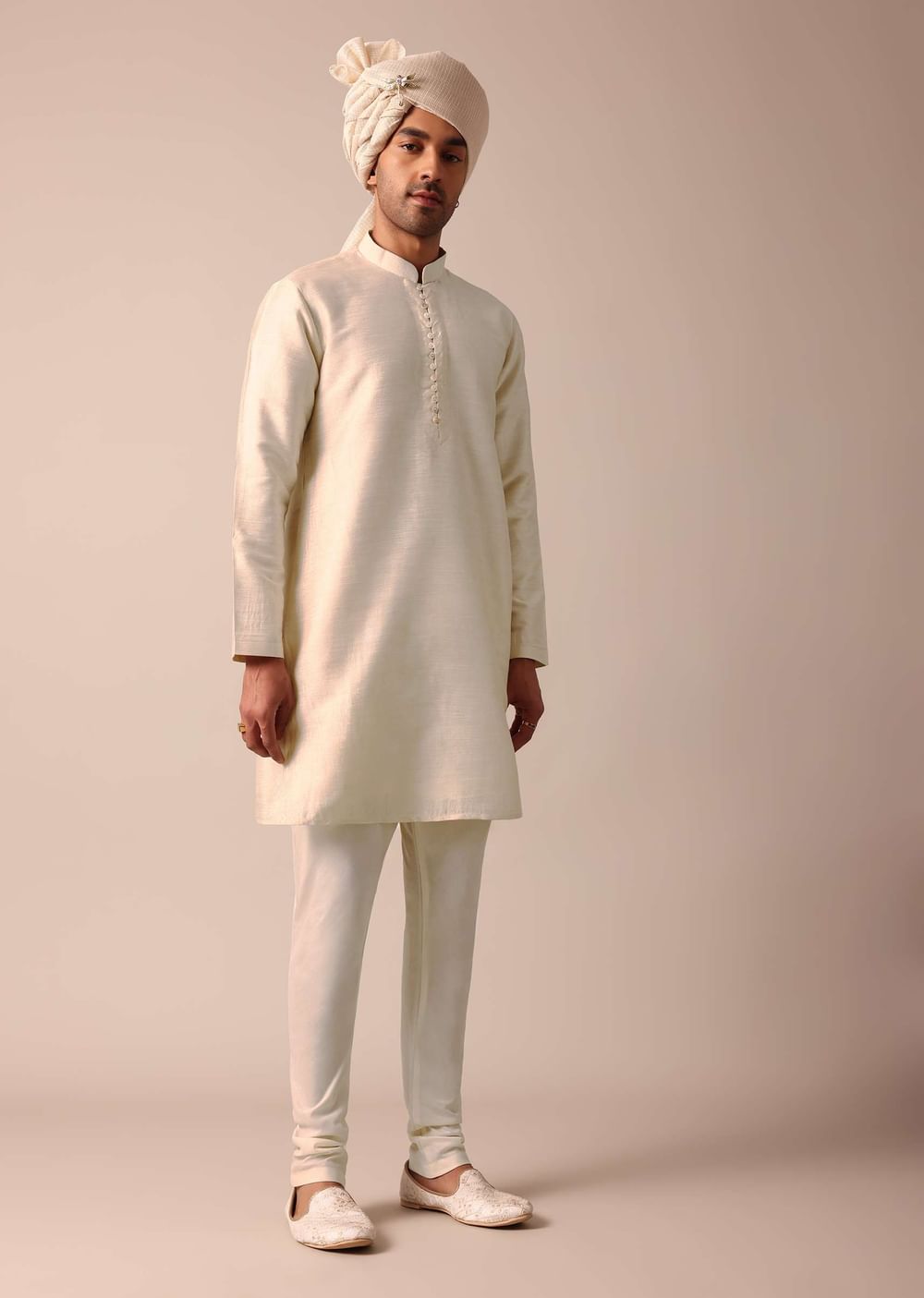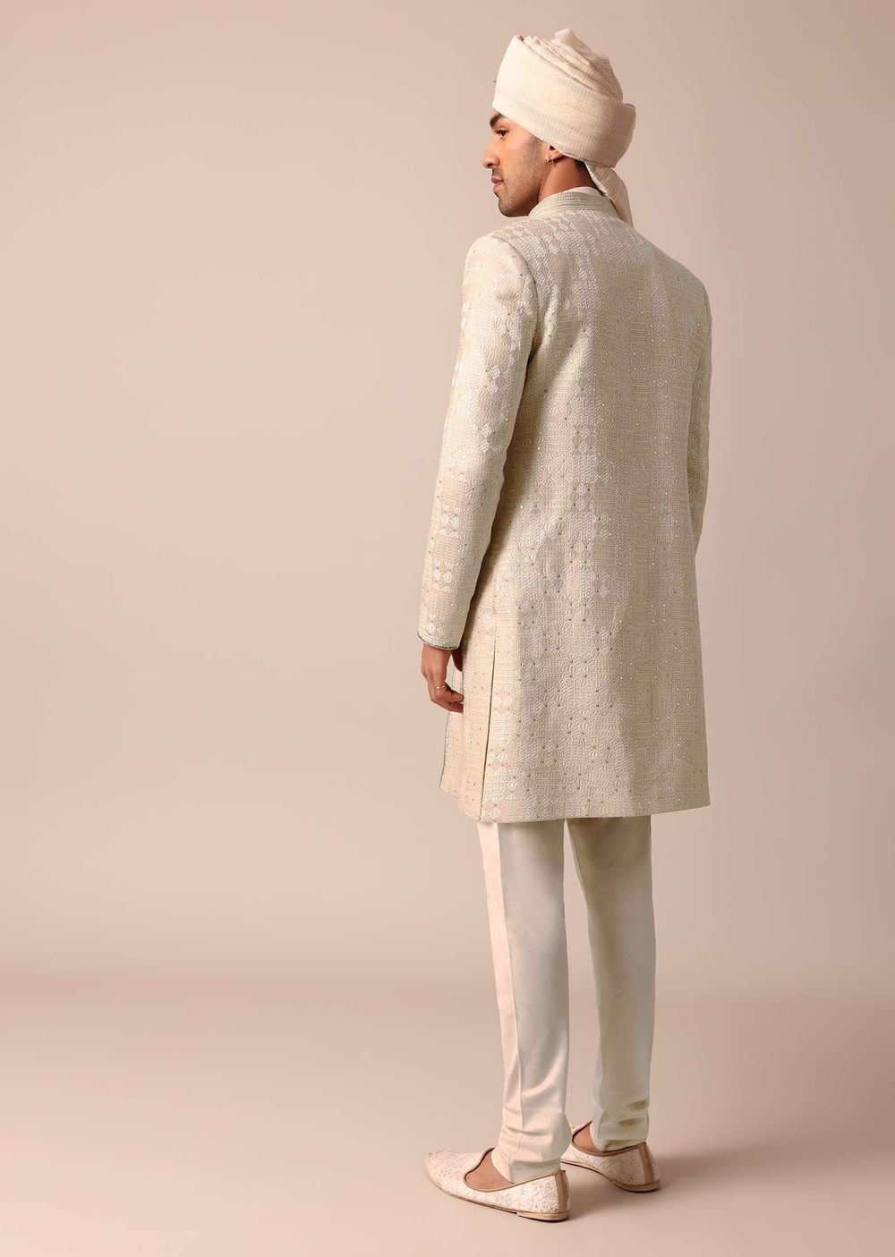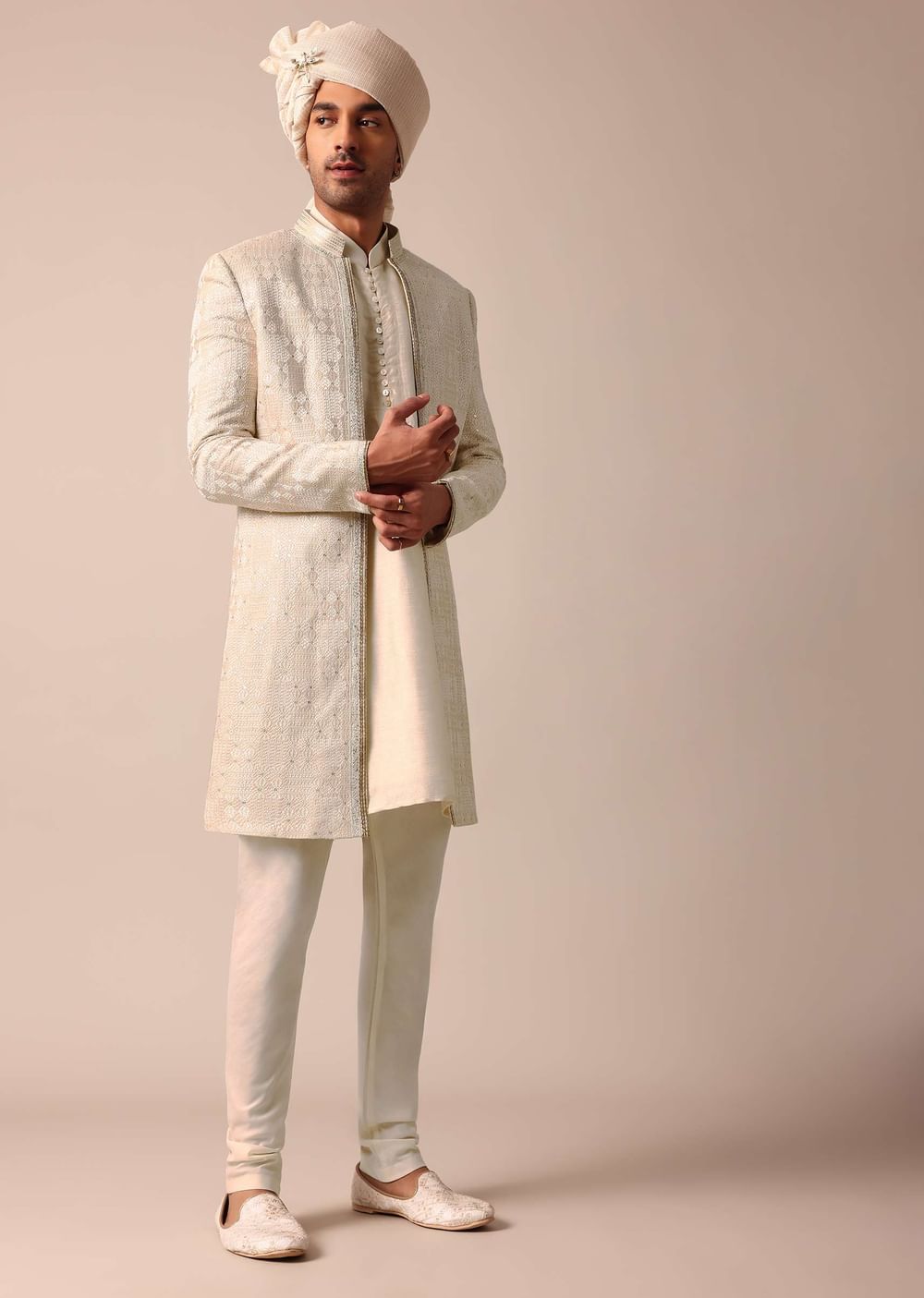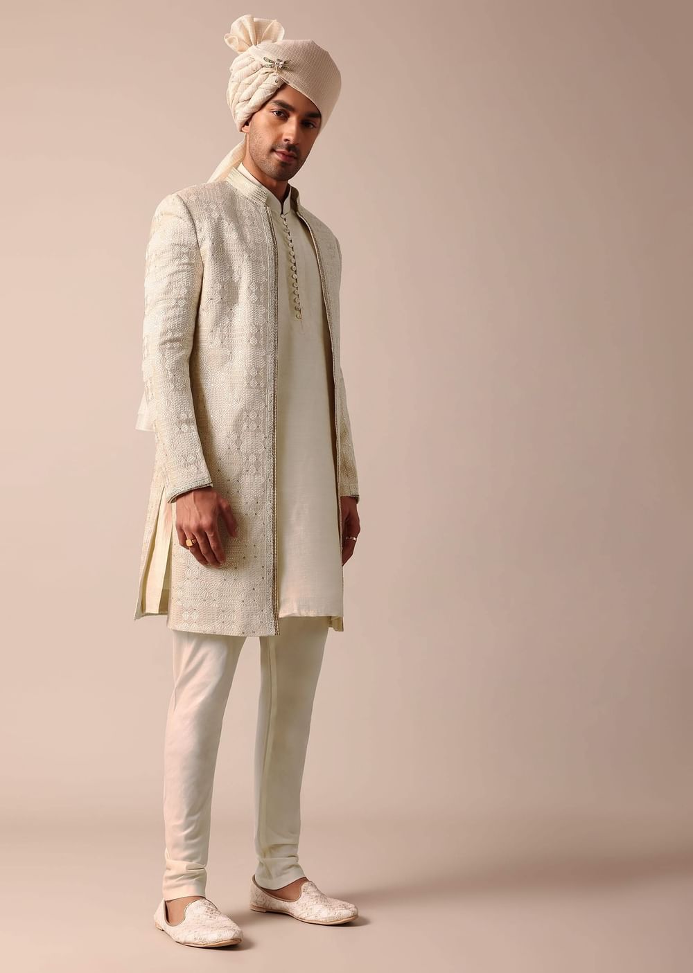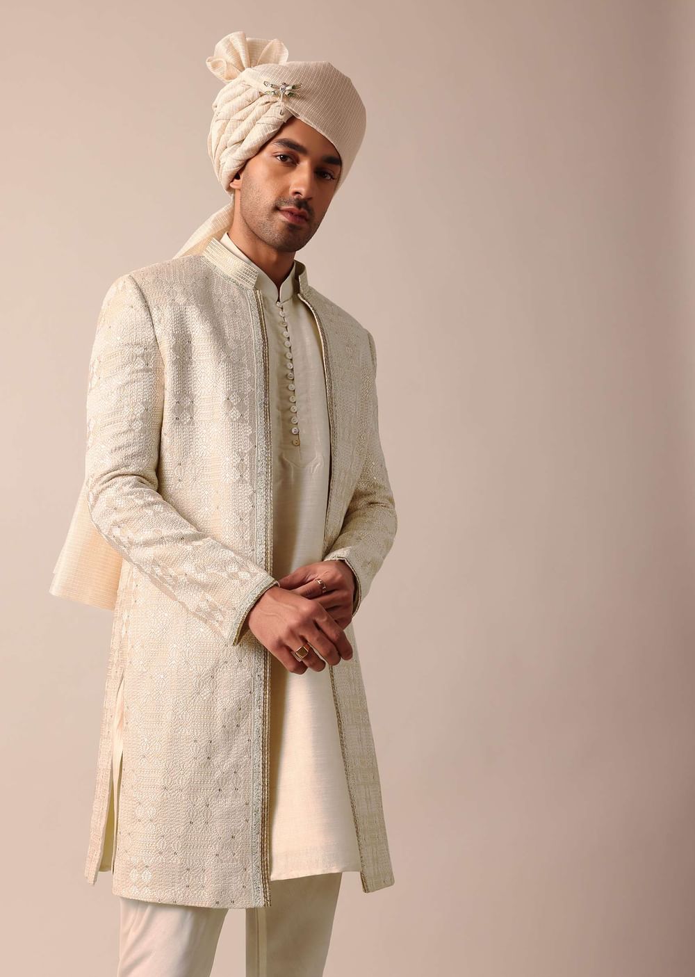 Embrace sophistication at Sangeets with our Timeless Beige Silk Sherwani Set. It features intricate embroidery that adds an elegant touch. This set includes a Sherwani Kurta and Bottom. The outfit is all tailored from luxurious silk in a calming beige and fawn colour palette. Awarded As The Most Trusted Brand We'Re Delivering Styles You Love Just As Promised.