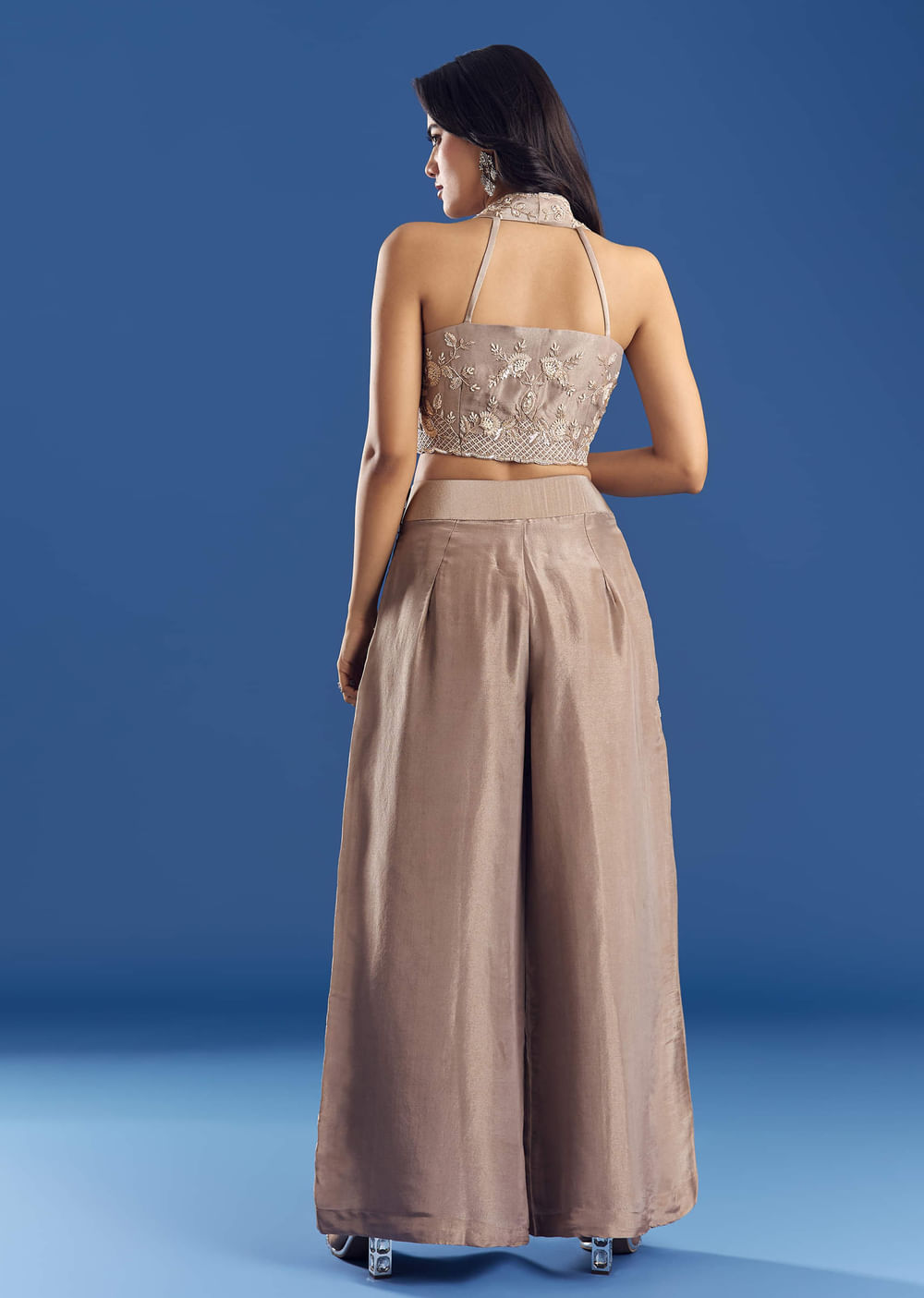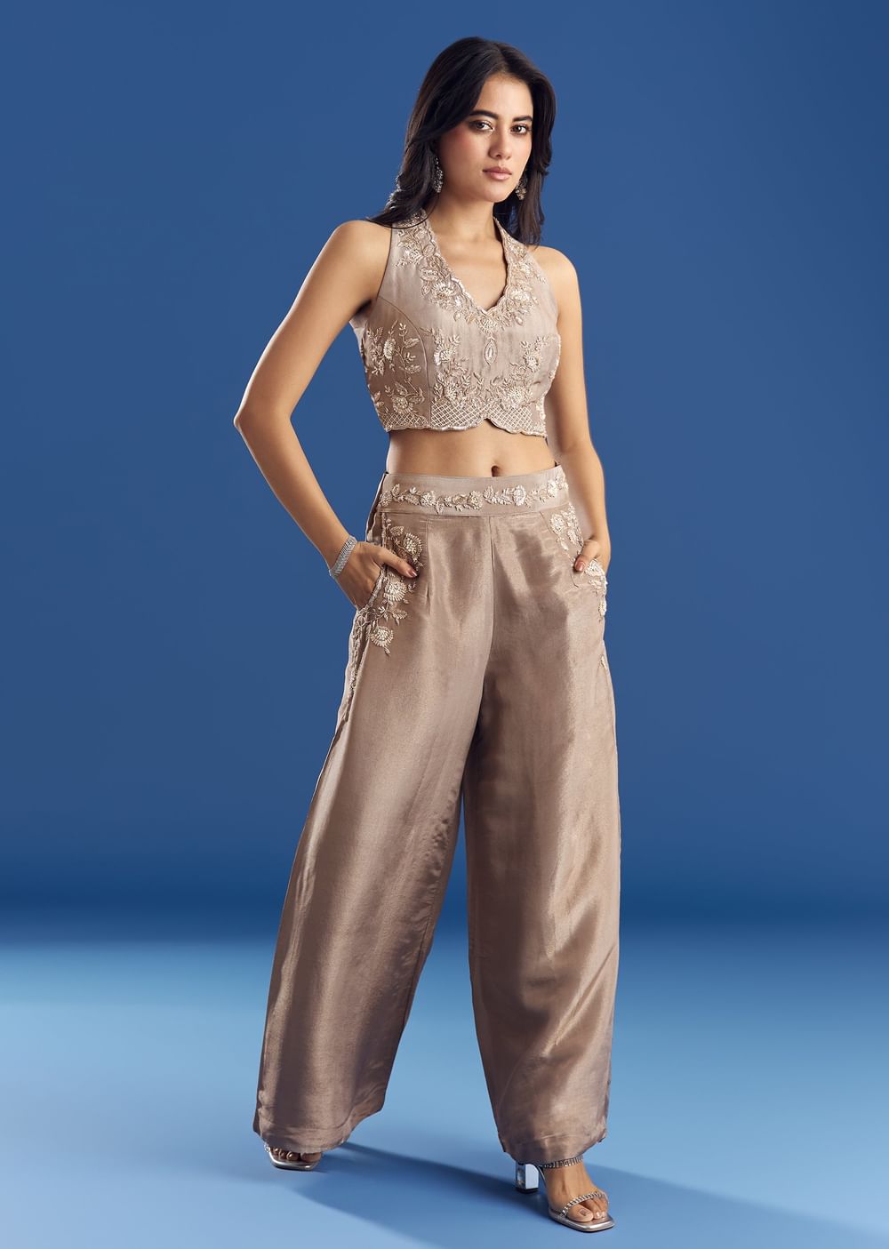 Tissue Croptop And Palazzo Suit With Cutdana Moti Embroidery