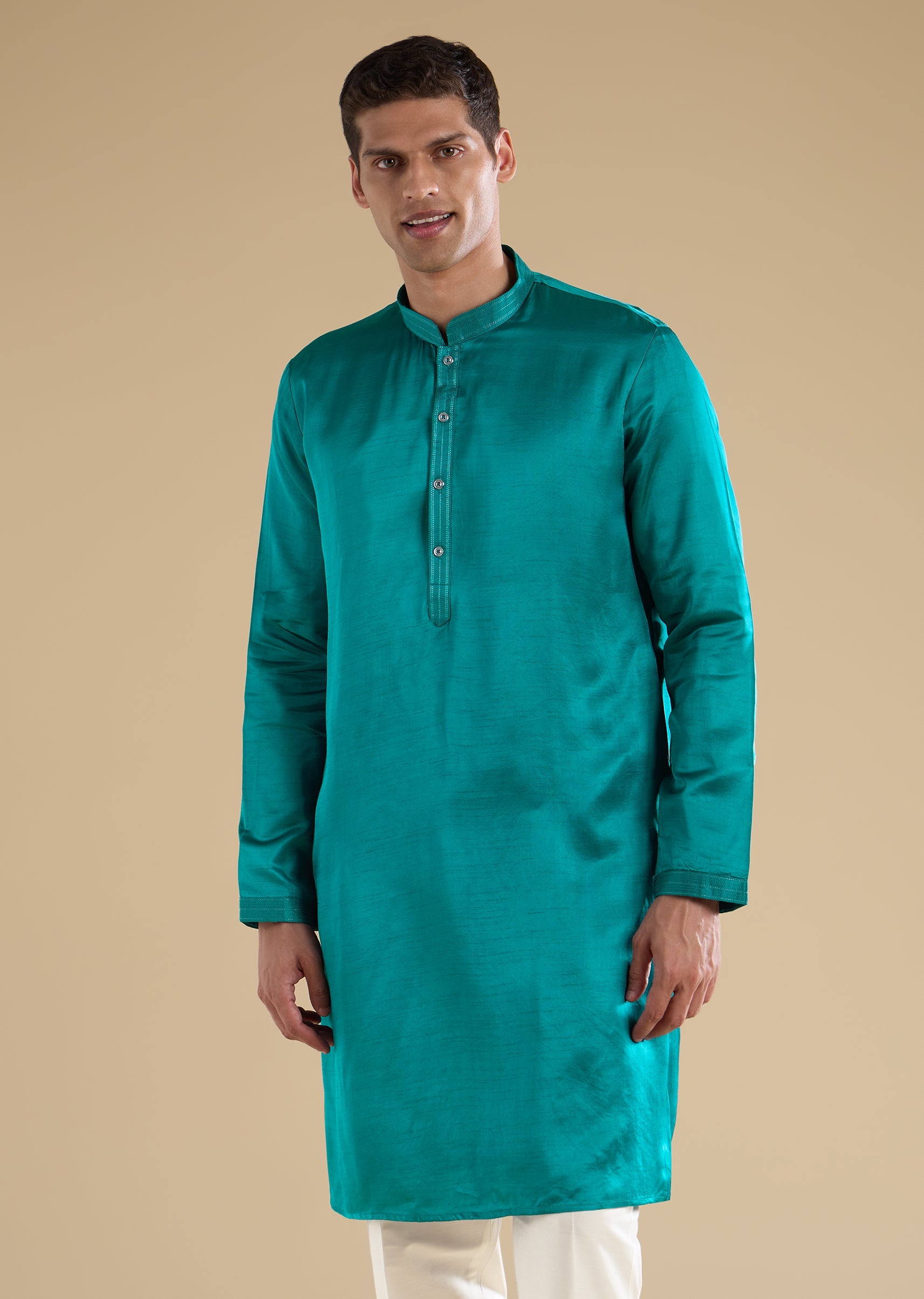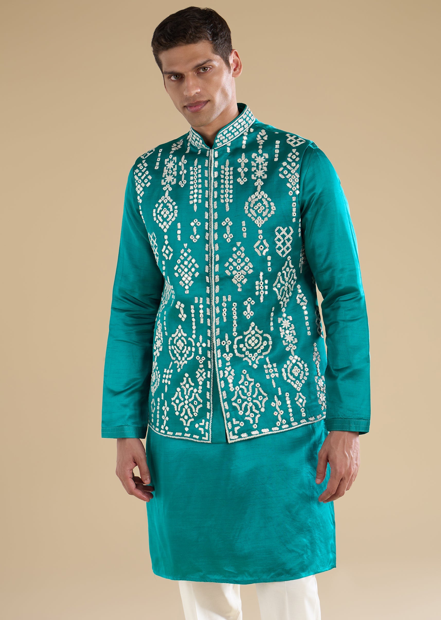 Fresh and elegant with refined detailing, this turquoise blue kurta jacket set is crafted in smooth art silk for a polished wedding look. The kurta features a mandarin collar and full sleeves, paired with an embroidered jacket accented with resham thread and mirror work for a luminous finish. Ideal for groom-family celebrations and wedding functions. Awarded as the Most Trusted Brand, we're delivering styles you love, just as promised.