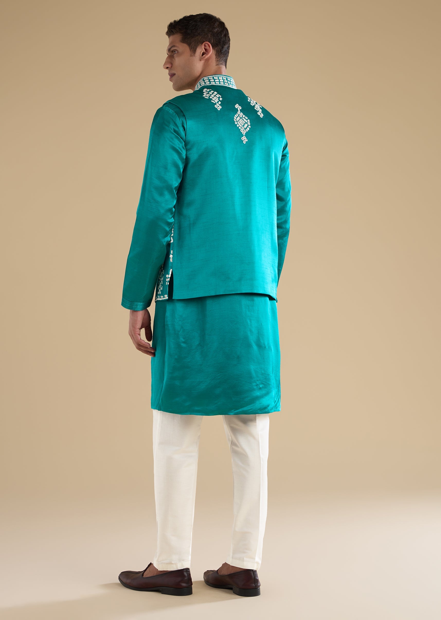 Turquoise Blue Embroidered Silk Kurta Jacket Set