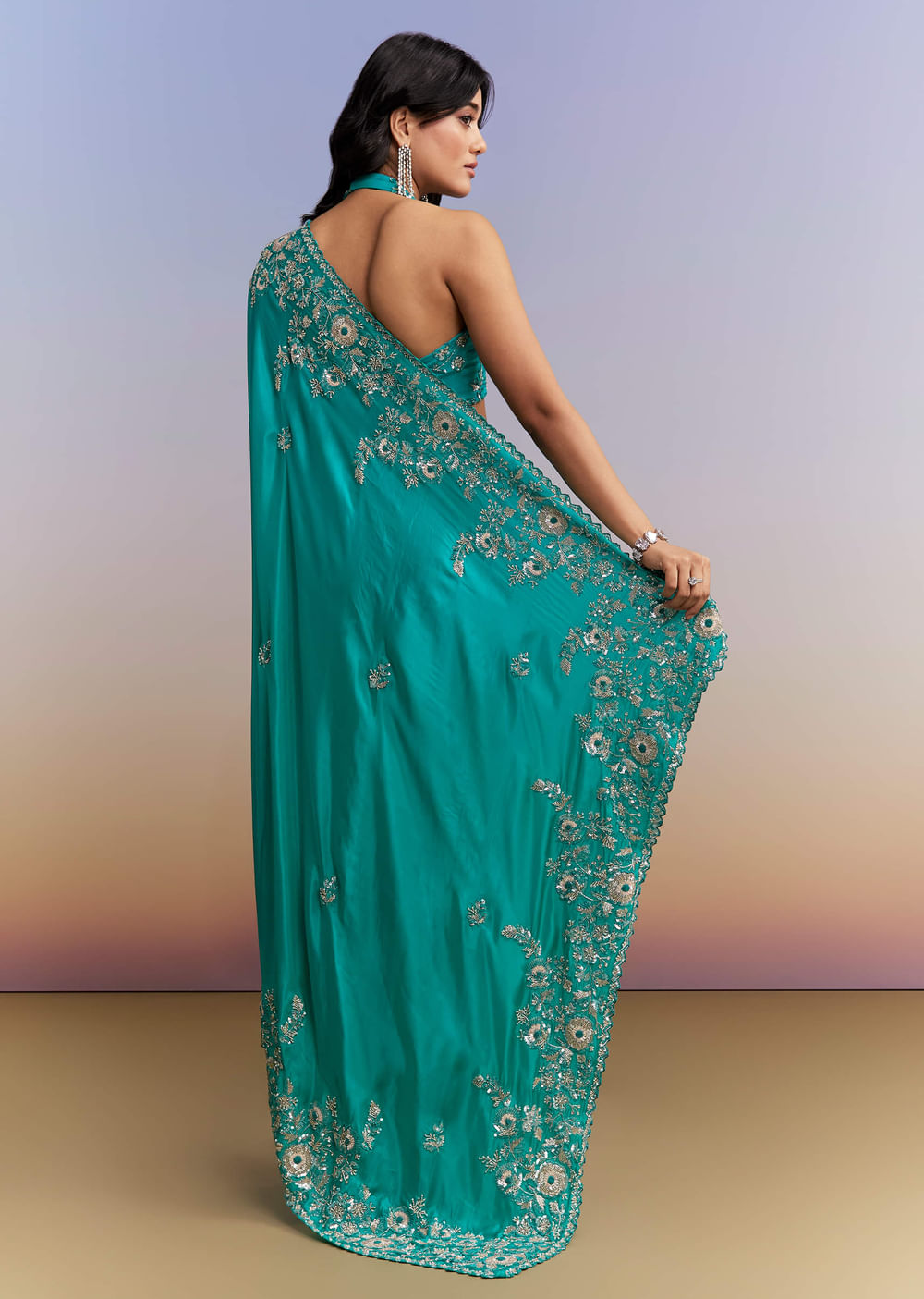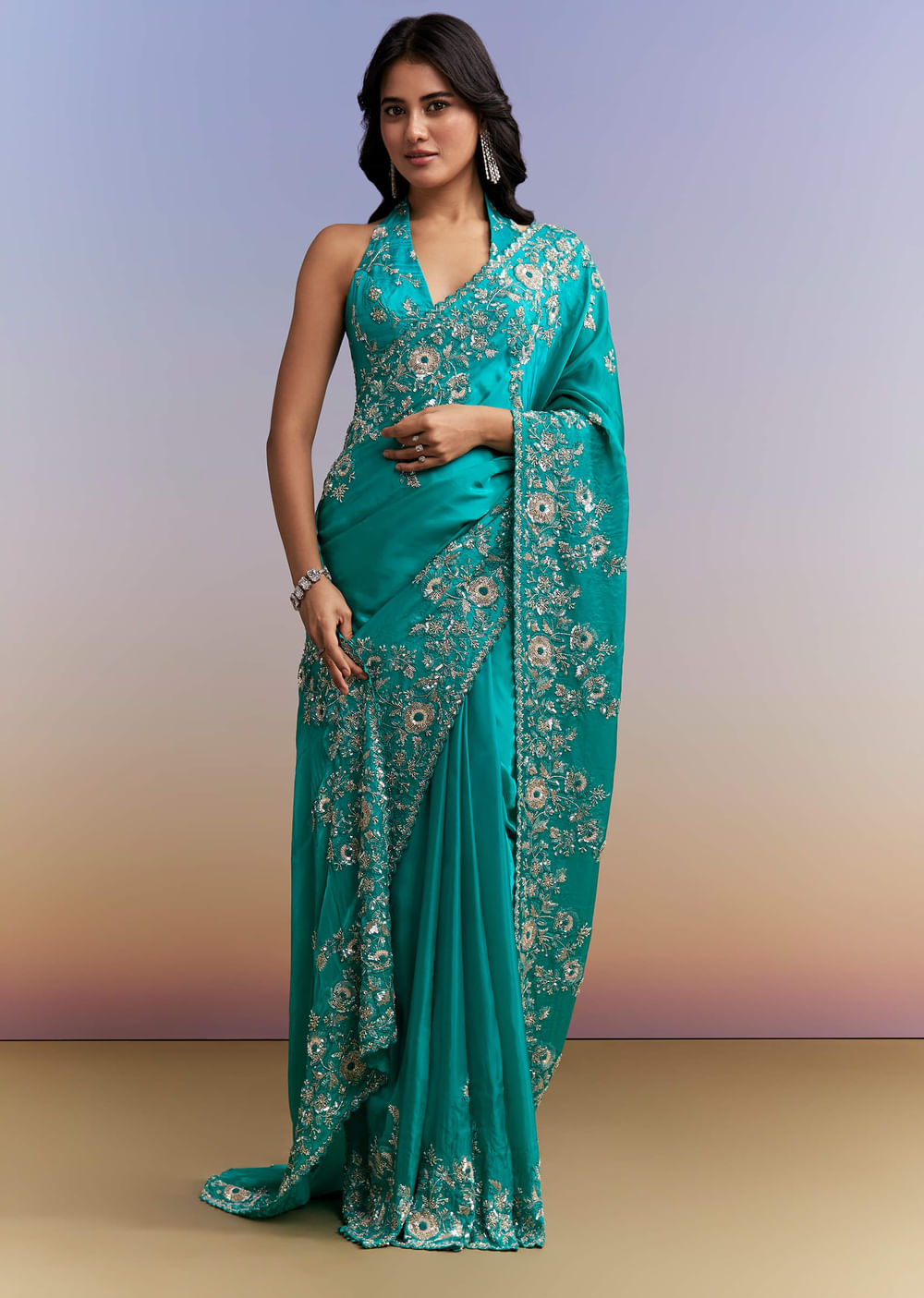 Turquoise Blue Satin Saree With Heavy Embroidered Details