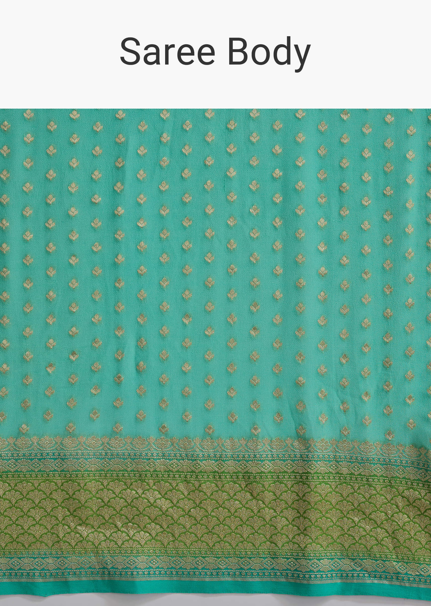Turquoise Georgette Woven Saree With Parrot Green Contrast Work