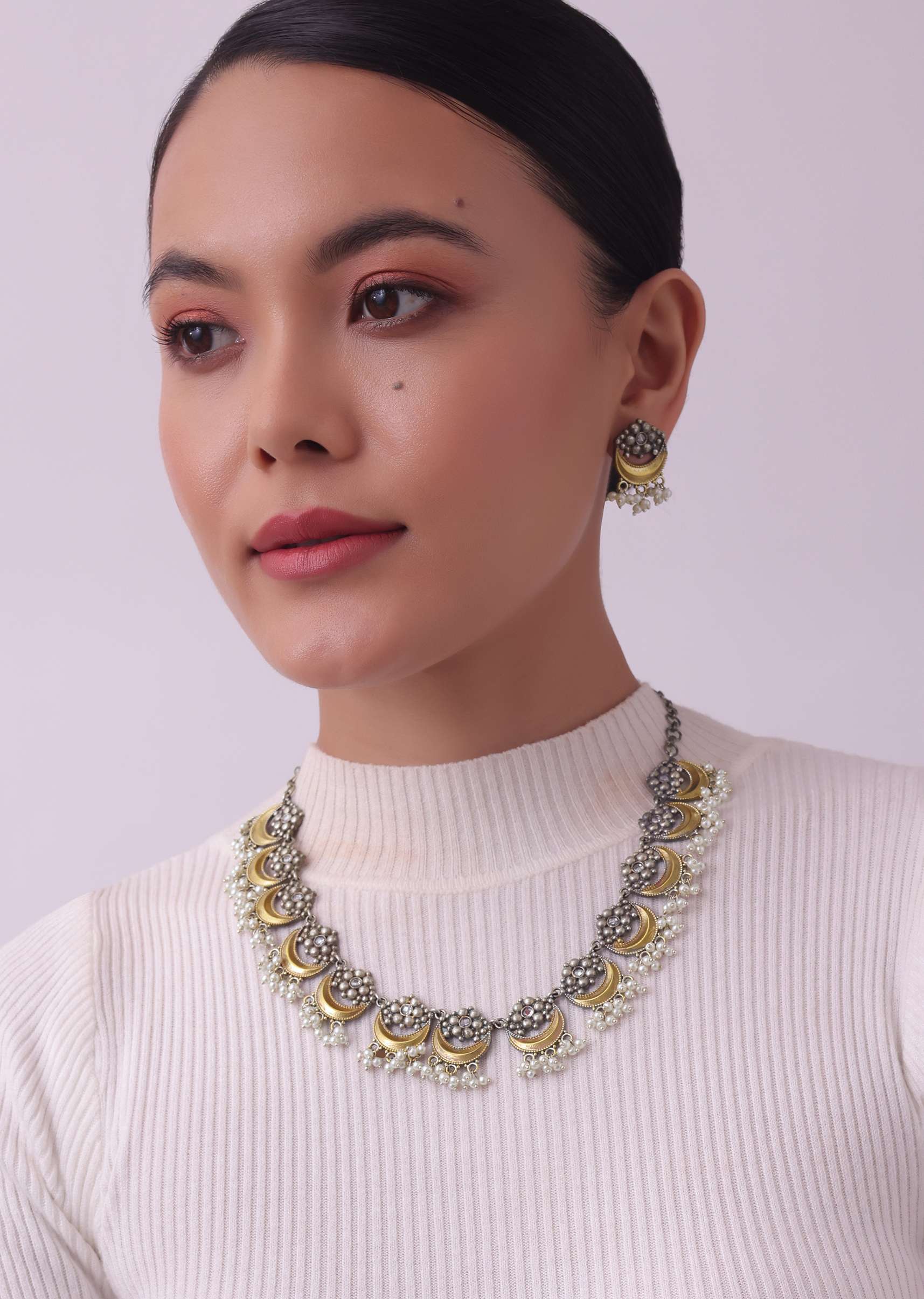 Two Tone Finish Oxidised Short Necklace And Earring Set