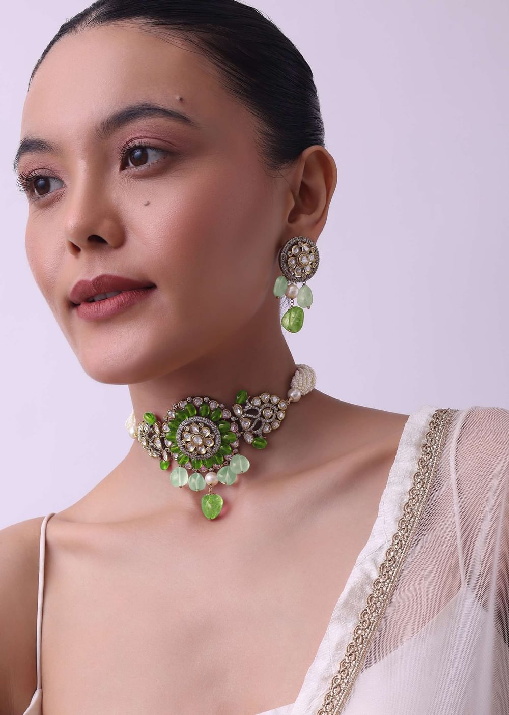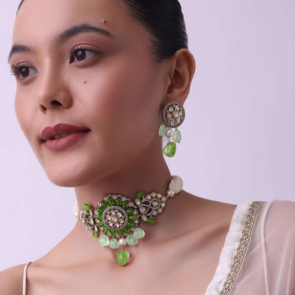 Create a fusion look by pairing this two-tone kundan choker set with modern outfits.
