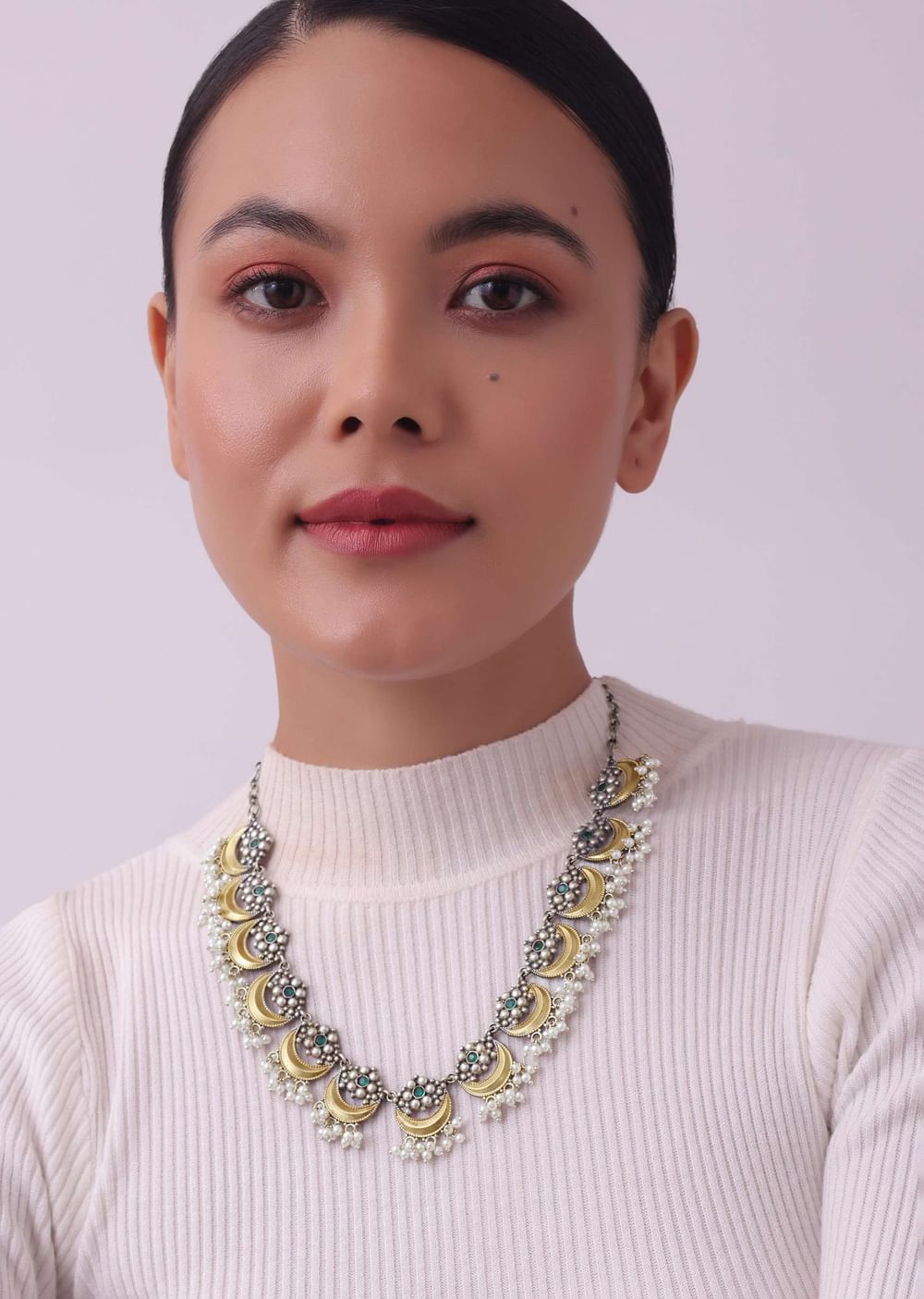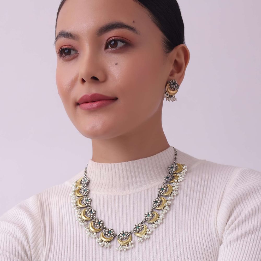 Indulge in the captivating allure of our oxidised short necklace and earring set. The two-tone finish adorned with lustrous pearls adds a touch of elegance and sophistication. EVENT - Whether you're attending a special occasion or looking to elevate your everyday style this necklace and earring set is a perfect choice for those seeking a luxurious accessory.Store in a dust bag. Keep away from moisture perfume alcohol and harsh chemicals. Spot clean only. Keep away from sharp objects. Actual color may slightly vary due to photographic lighting sources and device screen settings. Awarded as the Most Trusted Brand, we're delivering styles you love, just as promised.