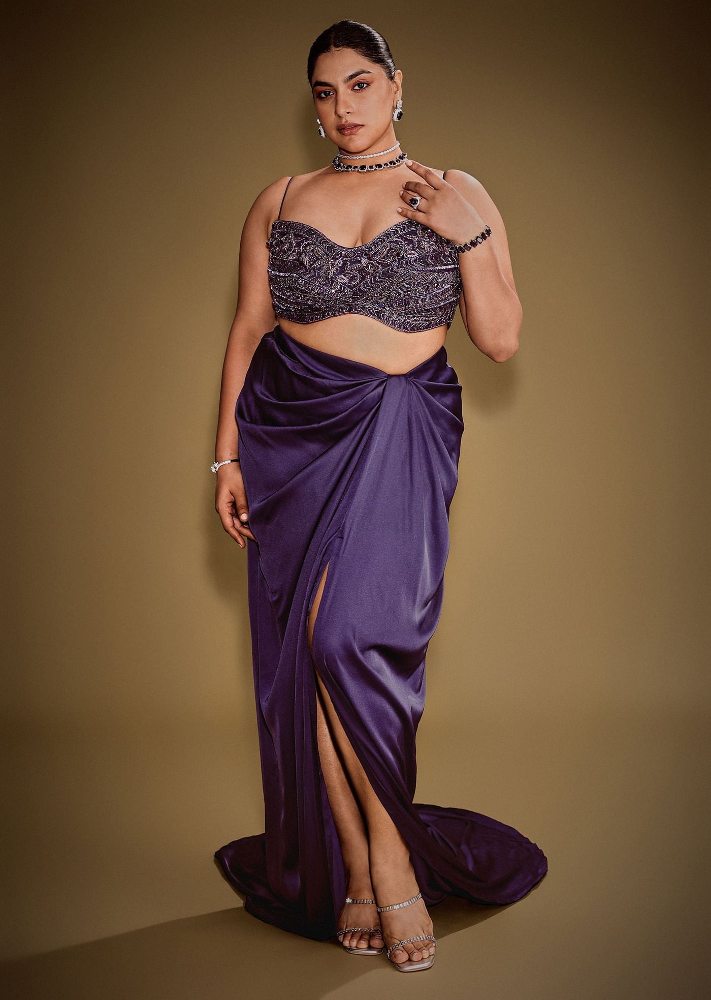 Make a statement at cocktail nights or sangeet ceremonies in this violet Indo-western ensemble. The satin drape skirt is paired with a hand-embroidered sleeveless blouse featuring a sweetheart neckline. A... More Product Details