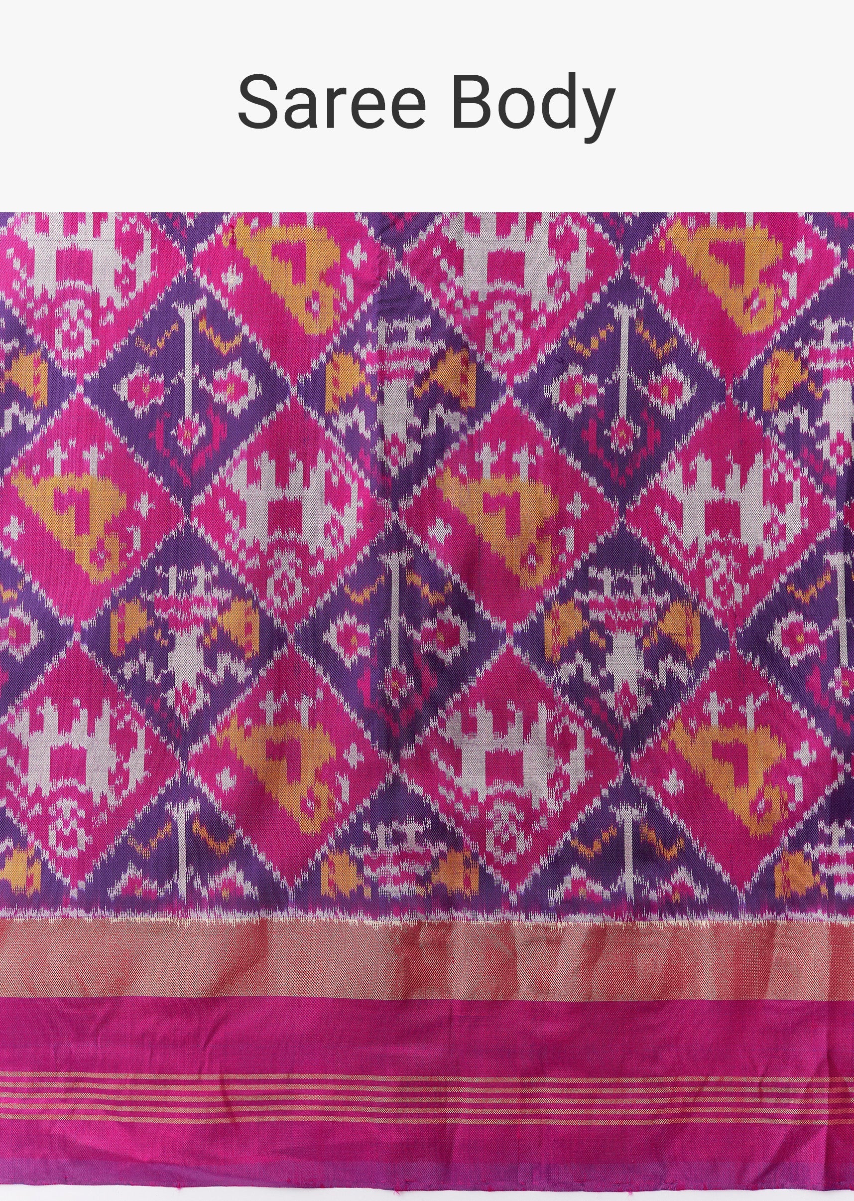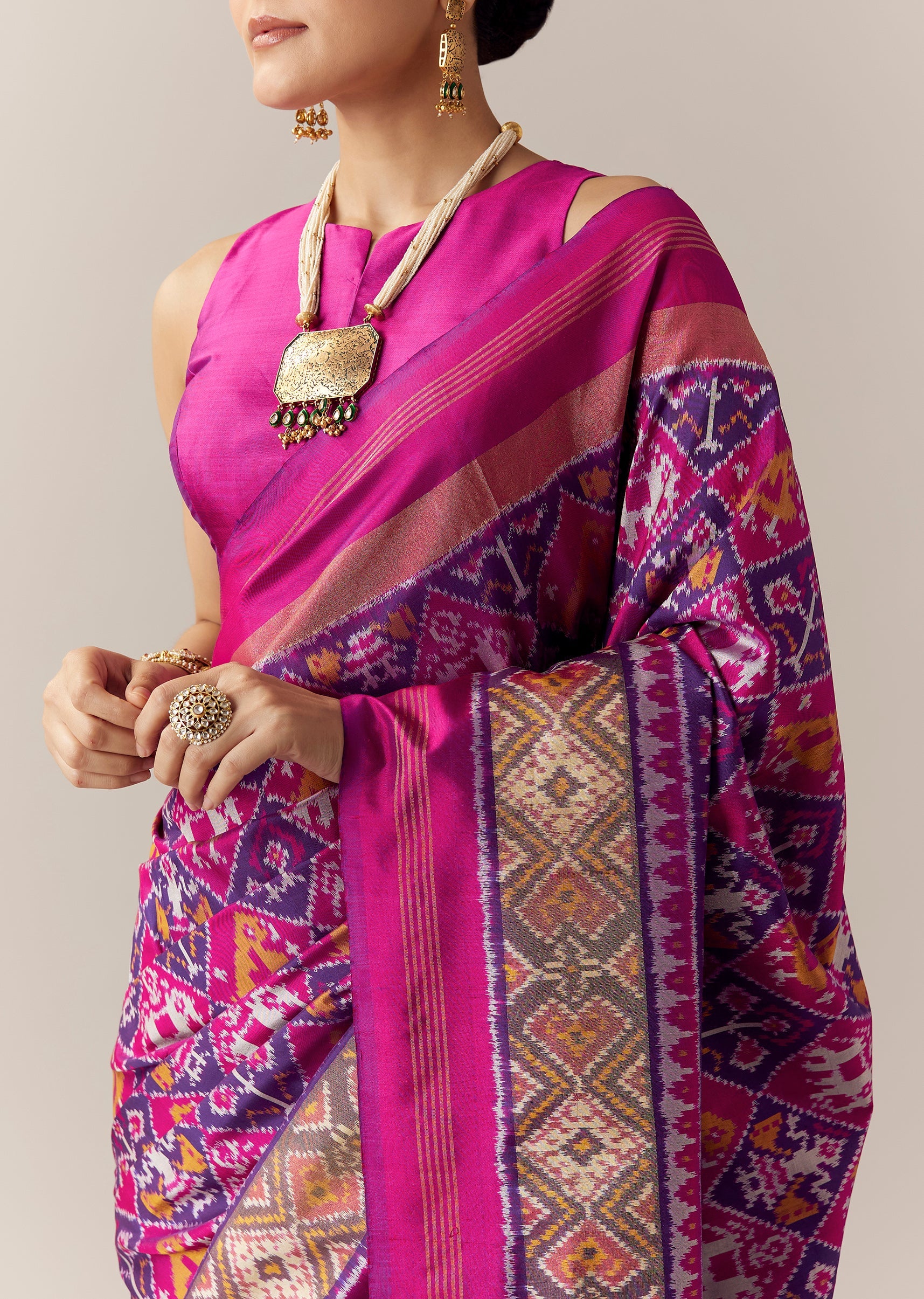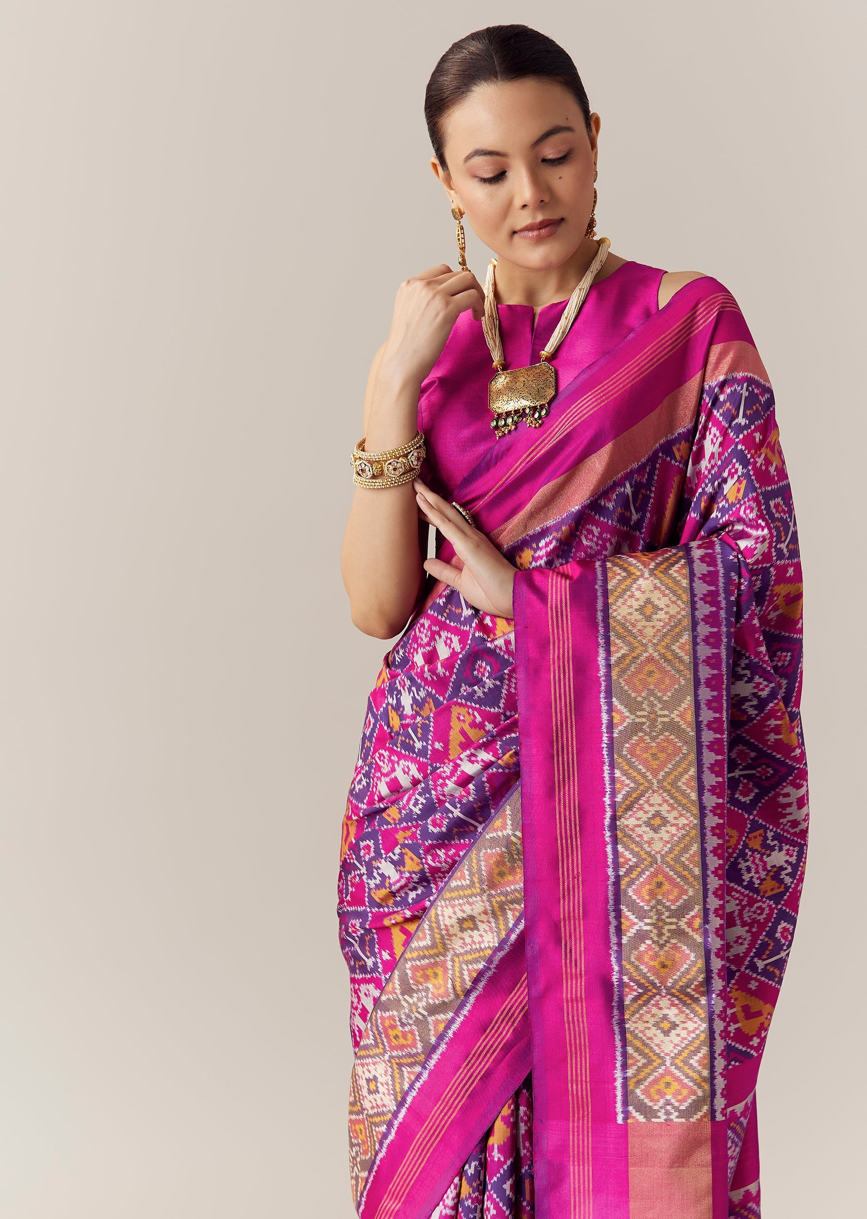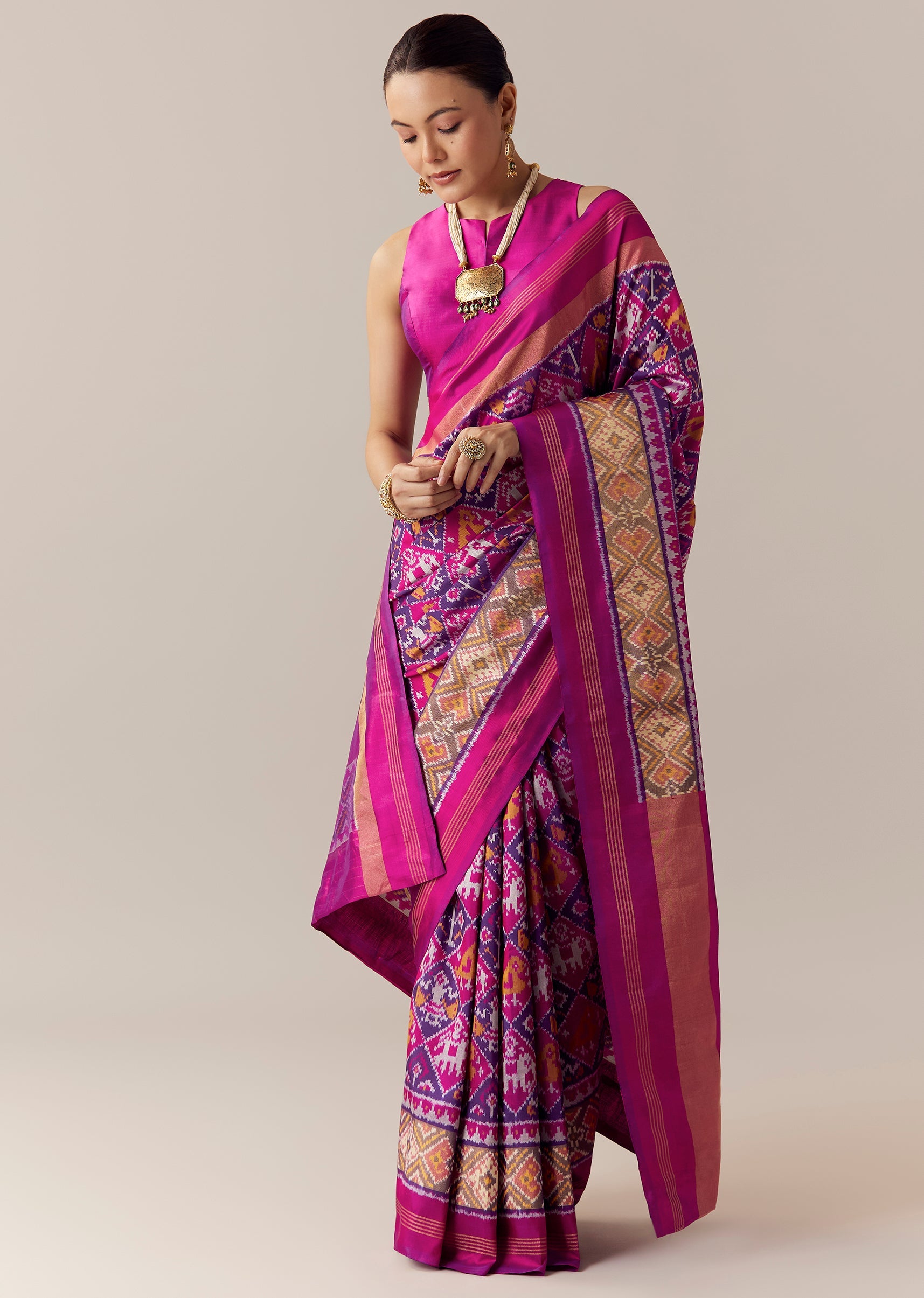 Rich cultural artistry comes alive in this violet Patola silk saree featuring authentic single ikat weaving with geometric, natural, and traditional motifs intricately woven across the drape. The vivid color enhances the depth of the craftsmanship, making it a standout piece for weddings, festive events, and cultural celebrations. Crafted in premium silk, the set includes one saree and one unstitched blouse fabric for tailored styling. Awarded as the Most Trusted Brand, we're delivering styles you love, just as promised.