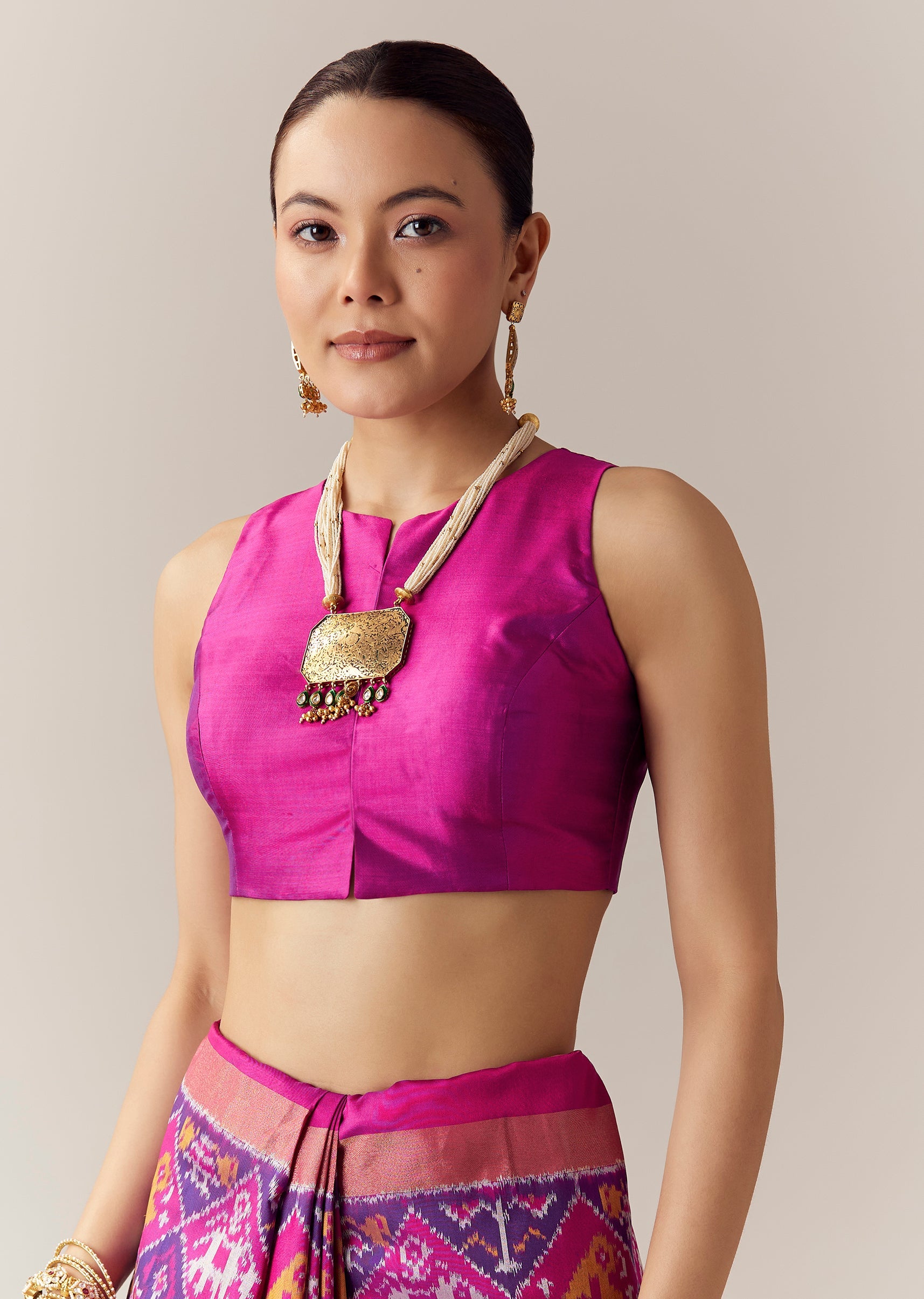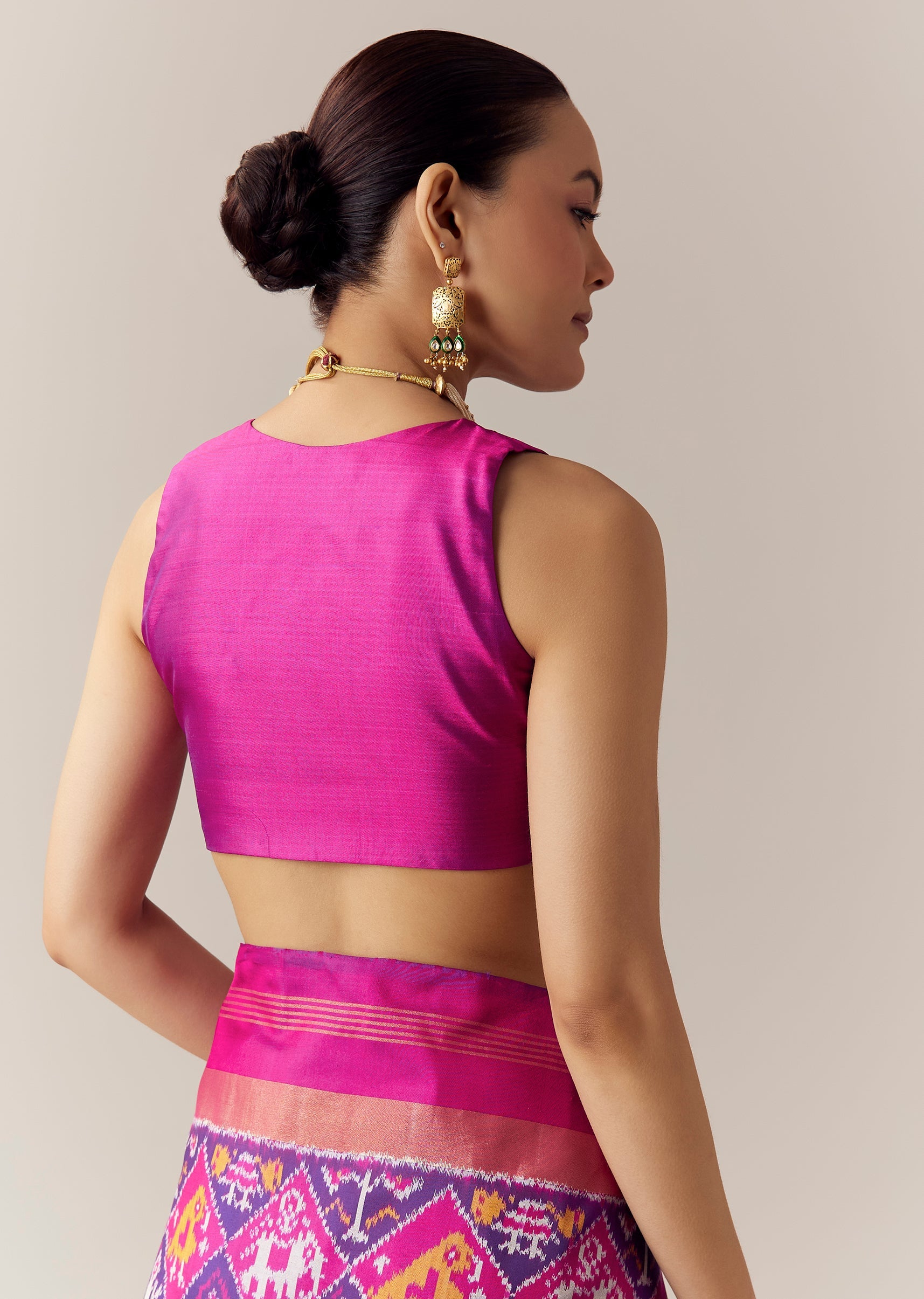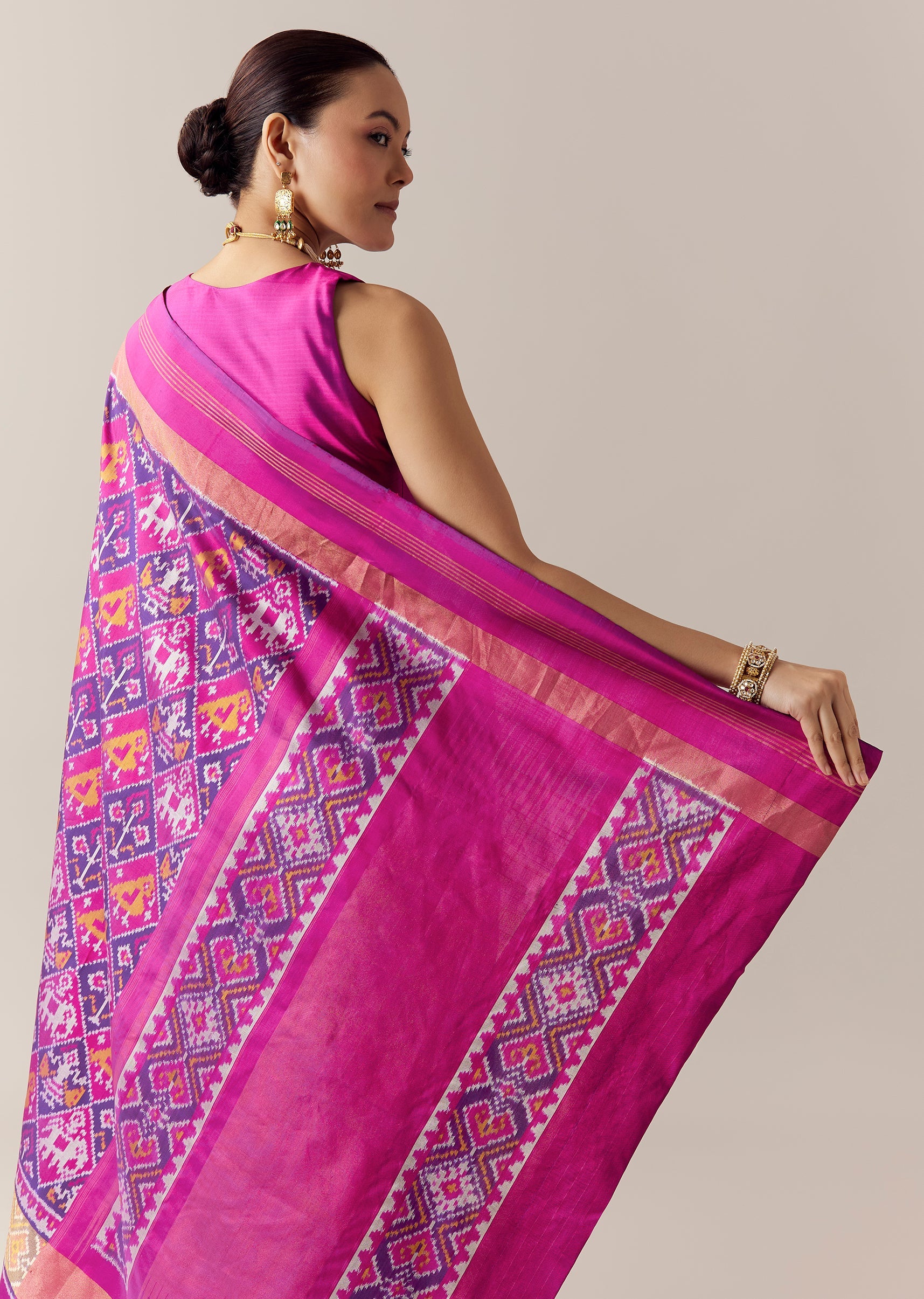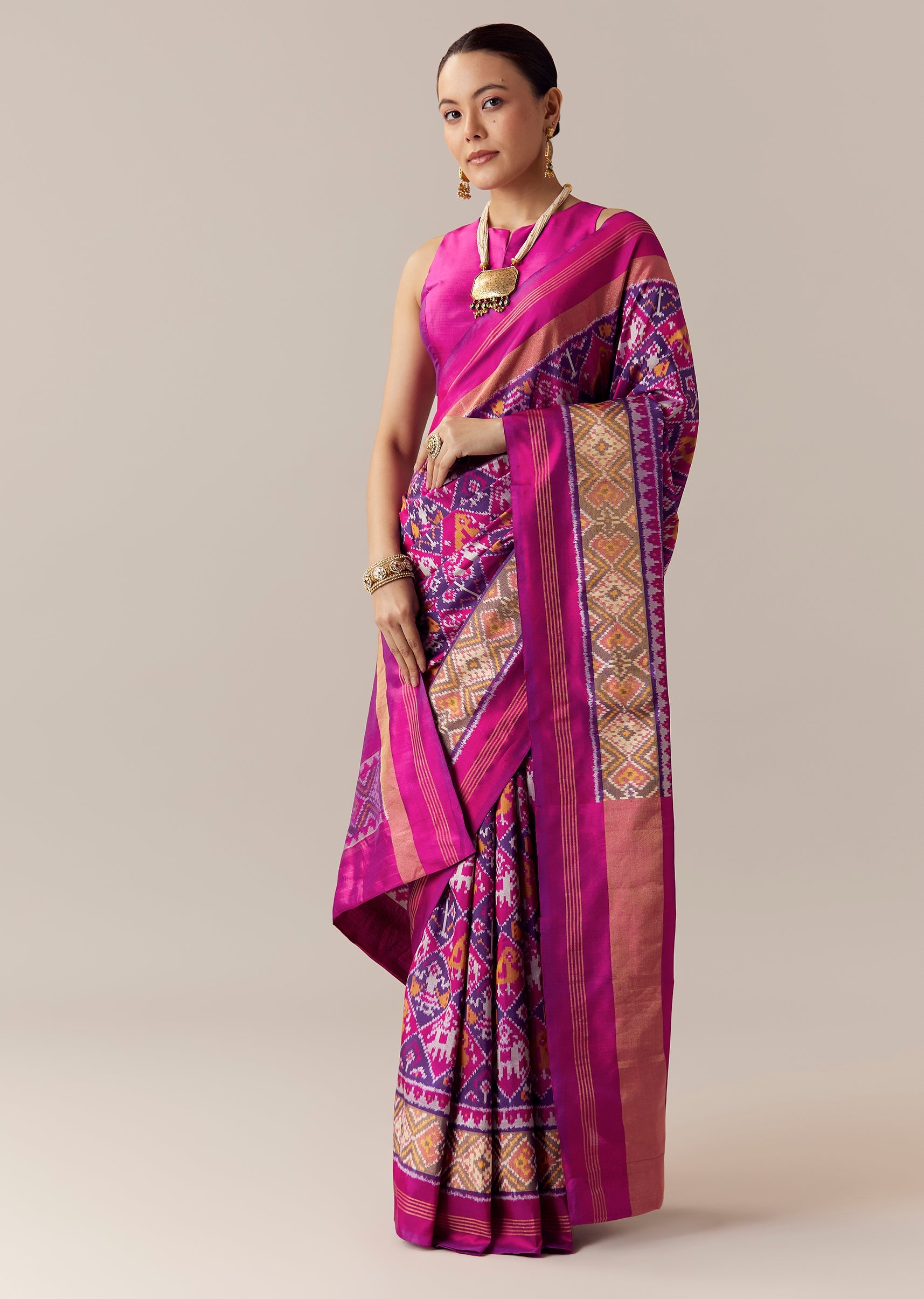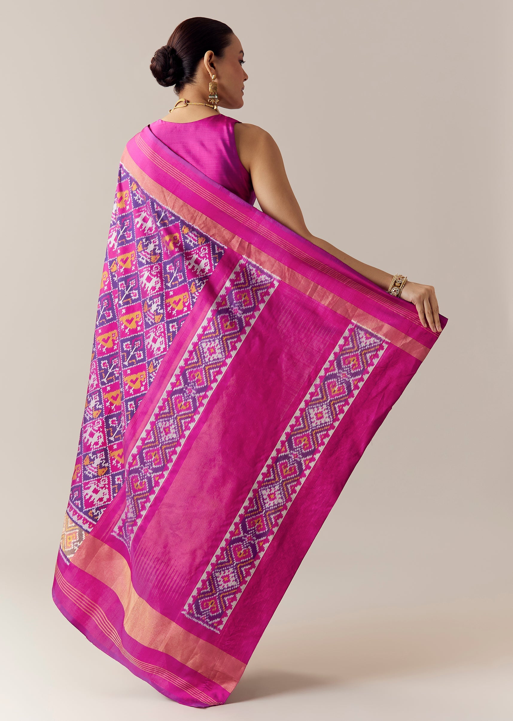 Rich cultural artistry comes alive in this violet Patola silk saree featuring authentic single ikat weaving with geometric, natural, and traditional motifs intricately woven across the drape. The vivid color enhances the depth of the craftsmanship, making it a standout piece for weddings, festive events, and cultural celebrations. Crafted in premium silk, the set includes one saree and one unstitched blouse fabric for tailored styling. Awarded as the Most Trusted Brand, we're delivering styles you love, just as promised.