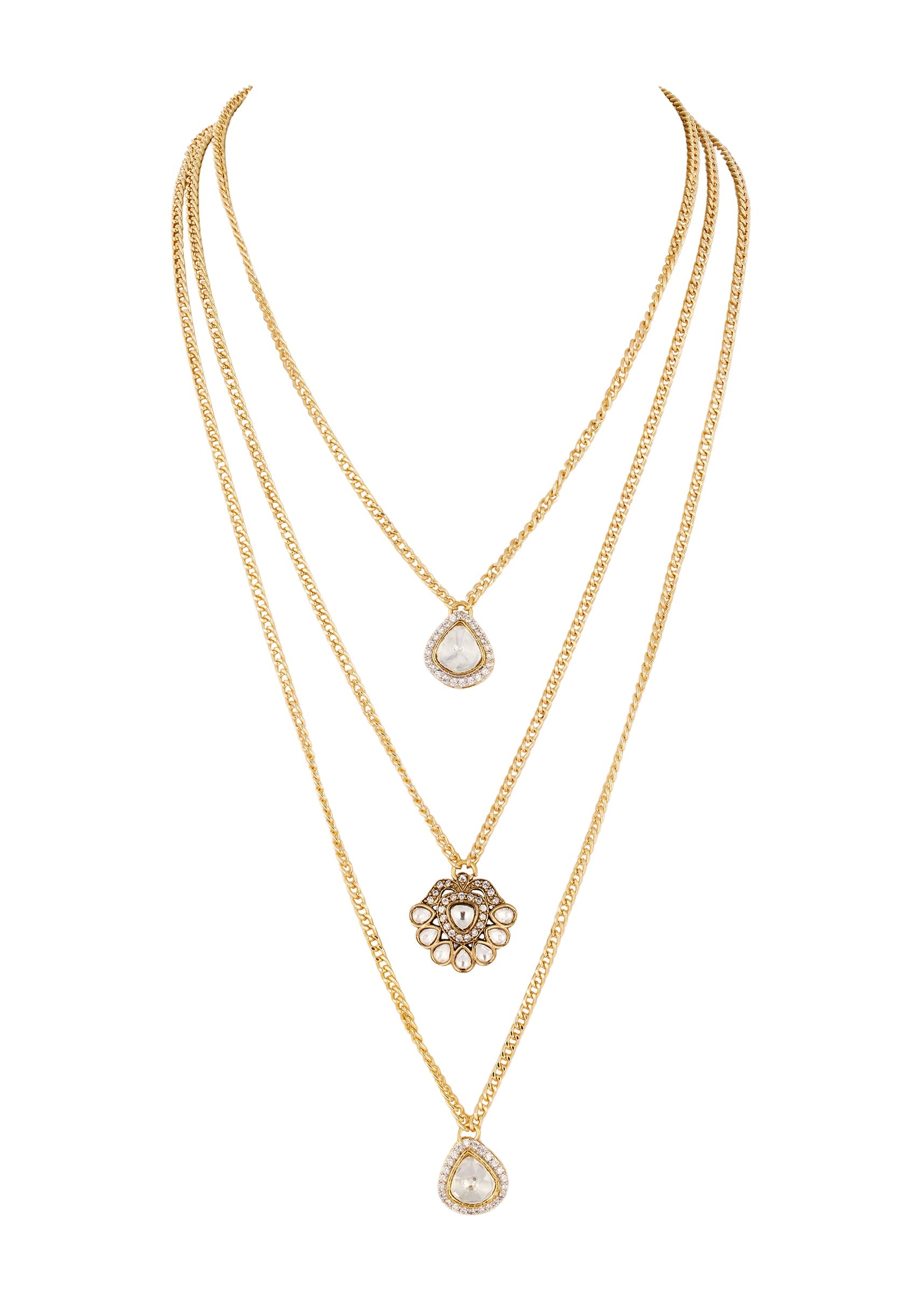 White and Gold Traditional Kundan Polki Layered Necklace with Coloured Stones