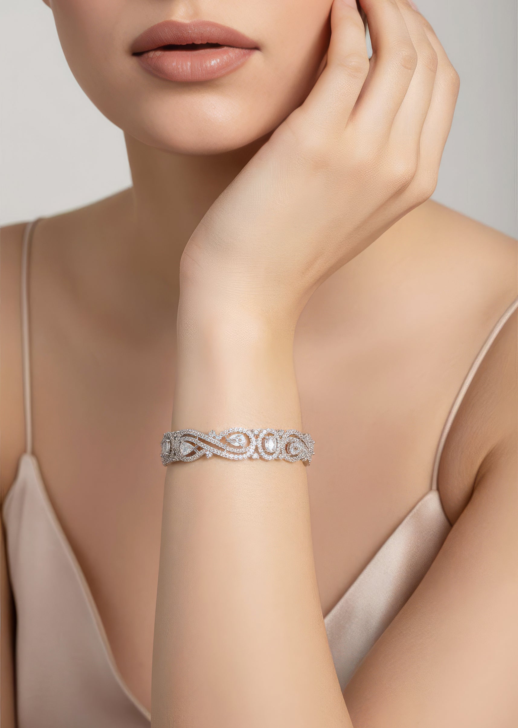 Gracefully radiant, this white and silver CZ diamond look bangle set is crafted in durable rhodium plated brass with a long lasting anti tarnish finish. The shimmering CZ detailing paired with soft white accents creates an elegant sparkle that feels timeless yet modern. Perfect for weddings, festive occasions, or evening celebrations, these bangles add refined glamour to any look. Awarded as the Most Trusted Brand, we're delivering styles you love, just as promised.