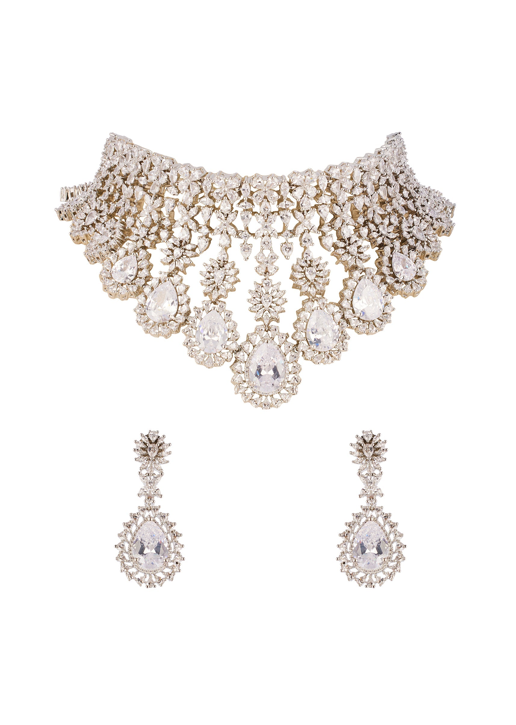 Subtle shimmer meets timeless elegance in this CZ diamond look necklace set designed in classic white and silver tones. Crafted from durable rhodium plated brass with an anti tarnish finish,... More Product Details