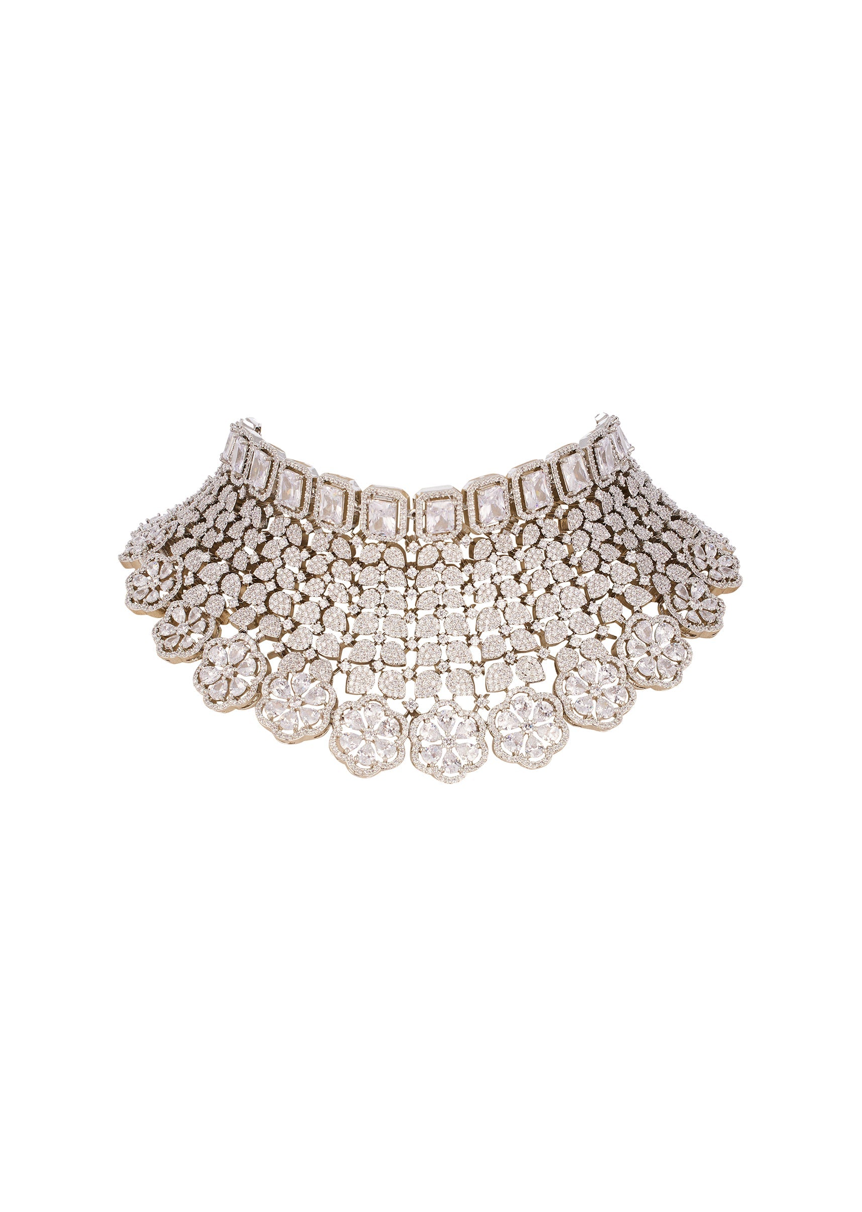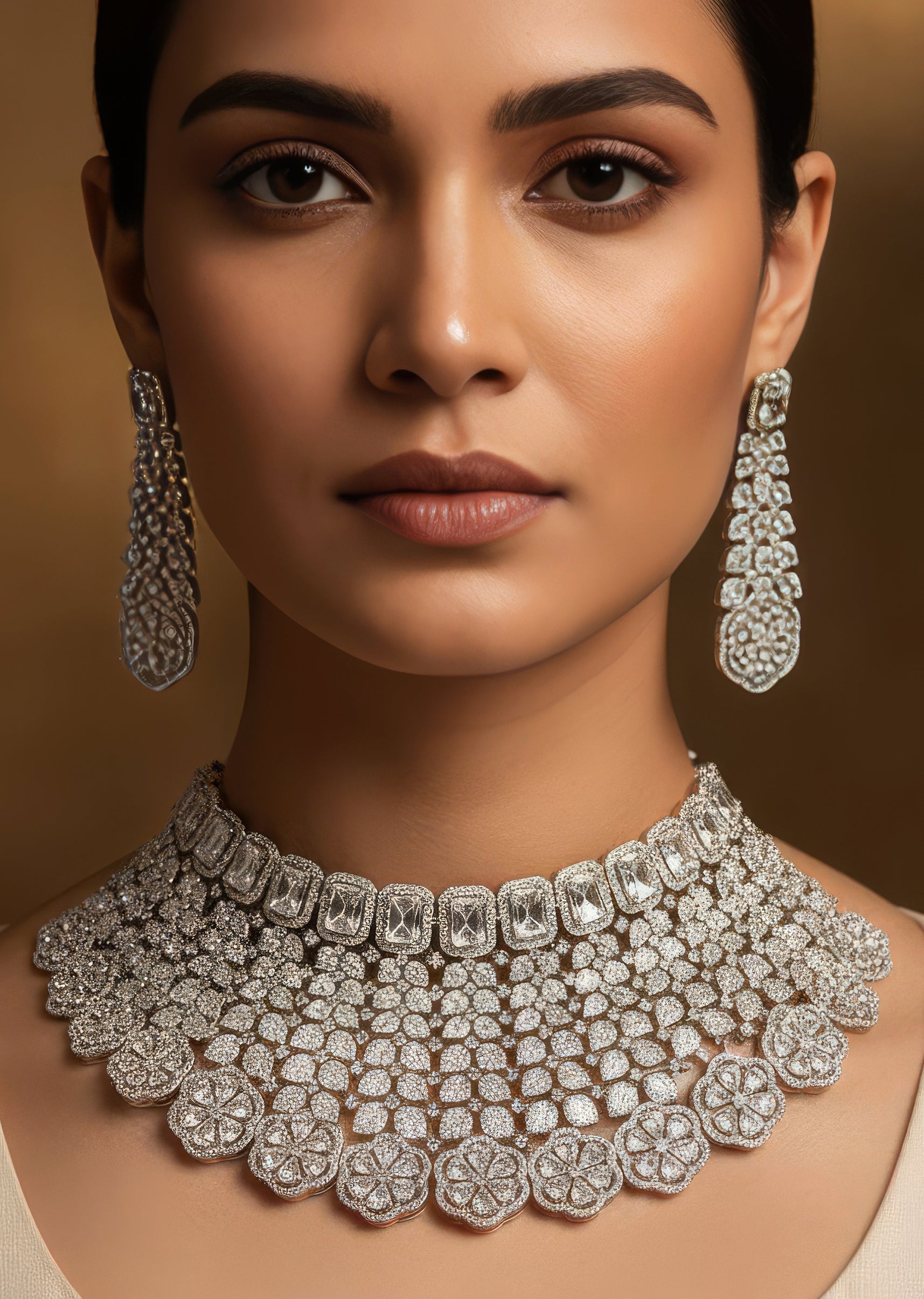 A refined sparkle meets everyday elegance in this CZ diamond look necklace set, crafted in durable rhodium plated brass with a long lasting anti tarnish finish. The design is enhanced with shimmering diamond toned semi precious stones that add a clean, radiant glow. Finished with matching earrings, this set is perfect for weddings, festive occasions, and elegant evenings. Awarded as the Most Trusted Brand, we're delivering styles you love, just as promised.