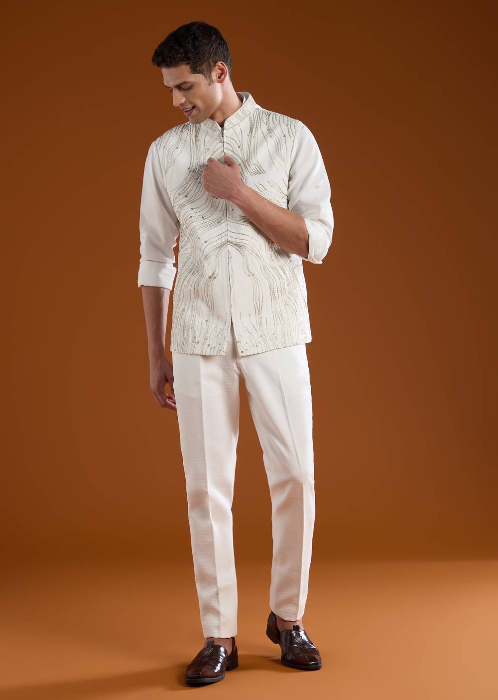Bring modern elegance to any festive occasion with this silk and art silk jacket kurta set detailed with refined resham thread work and subtle sequin accents. The full sleeve kurta with a mandarin collar creates a classic base, while the coordinated jacket with a front zip and front hook eye closure adds structure and sophistication. Paired with tailored pants, the ensemble offers a polished traditional look suitable for weddings, receptions, and cultural celebrations. Awarded as the Most Trusted Brand, we're delivering styles you love, just as promised.