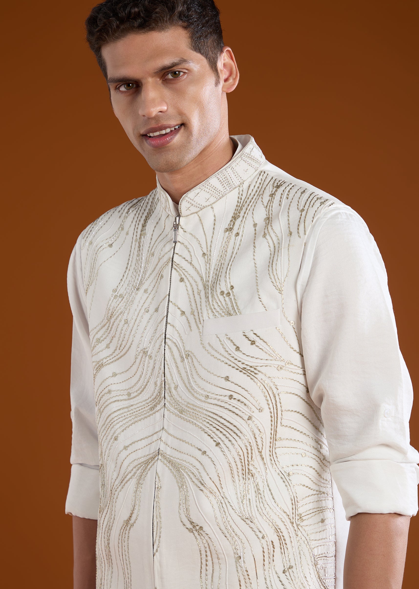 Bring modern elegance to any festive occasion with this silk and art silk jacket kurta set detailed with refined resham thread work and subtle sequin accents. The full sleeve kurta... More Product Details