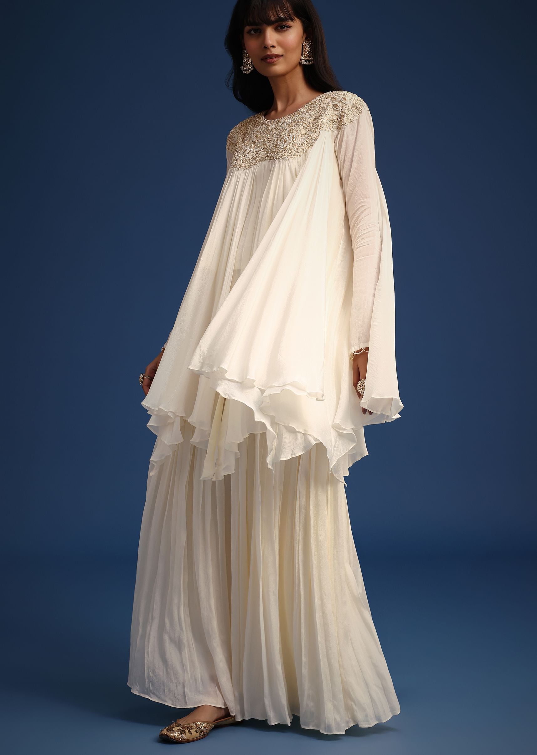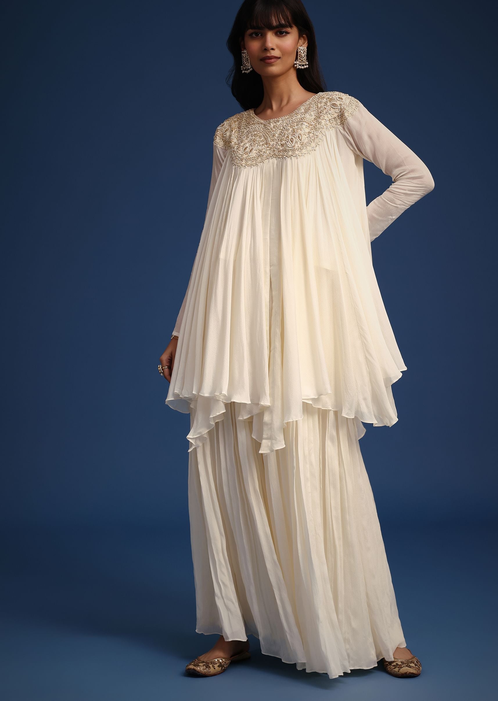 White Chiffon Kurta And Palazzo Set With Cutdana And Sequin Work