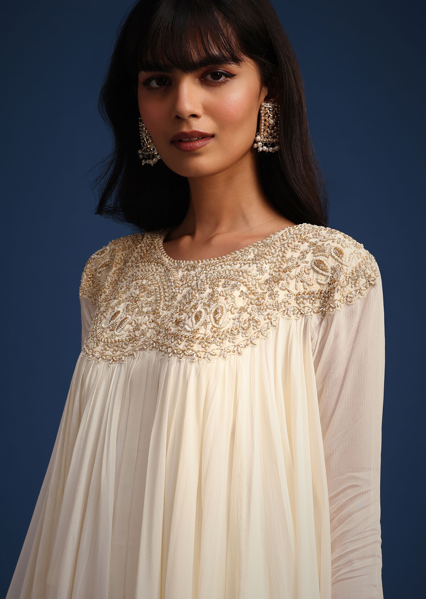 A captivating silhouette of dreamy white flared kurta, complemented with an inner and palazzo pants. Decked with moti, zardosi, sequins, and cut dana work on kurta yoke, the round neckline... More Product Details