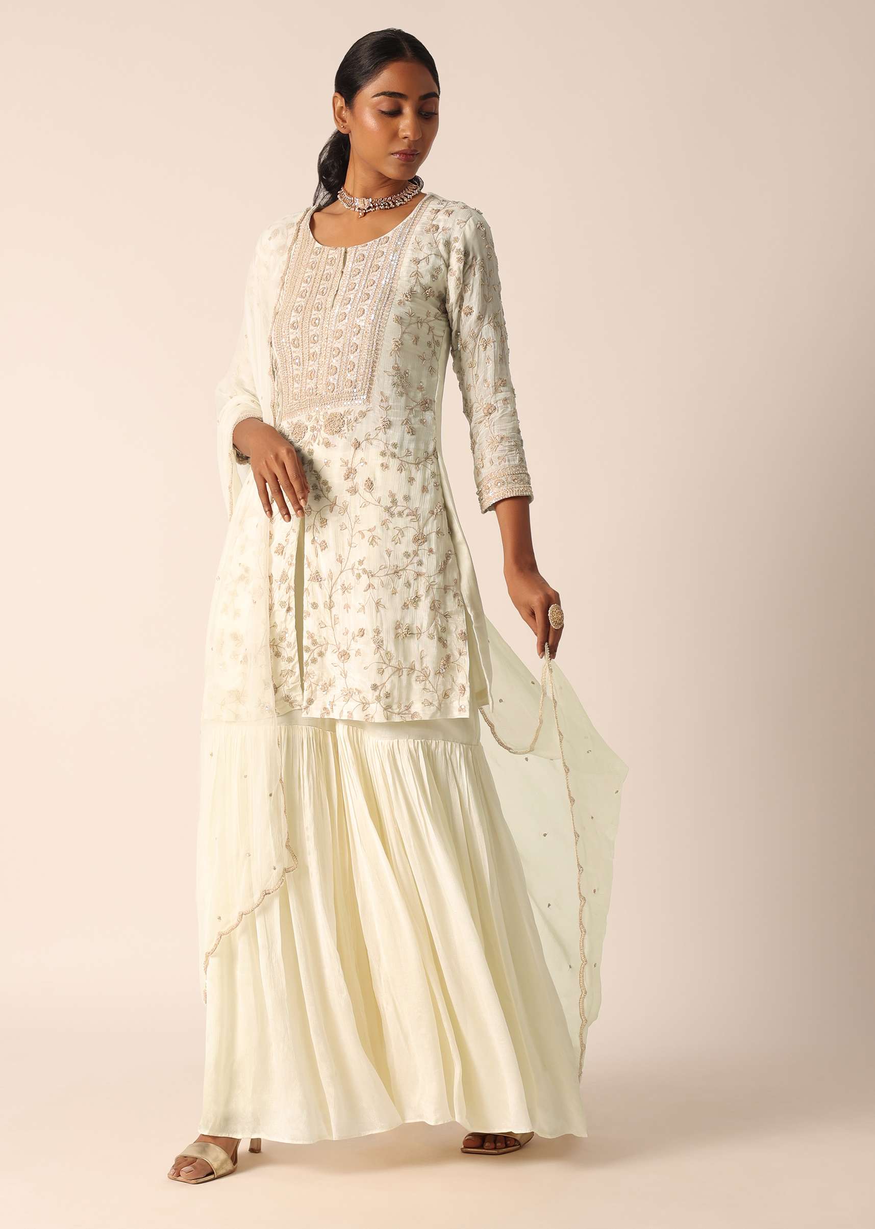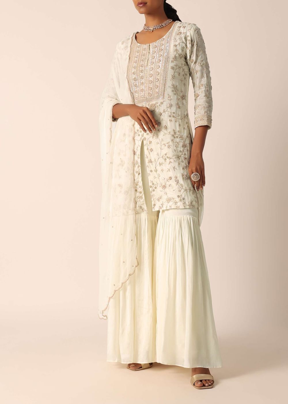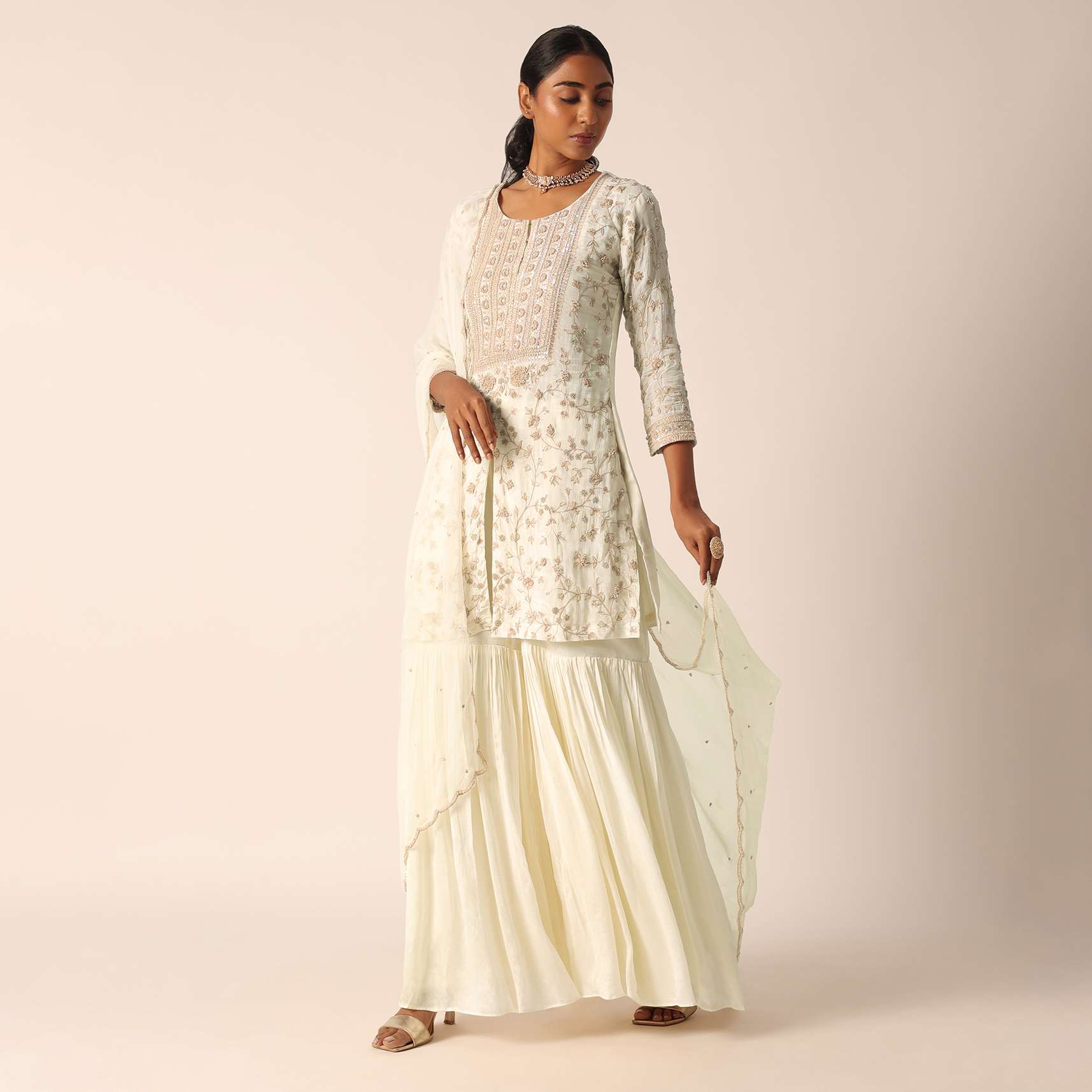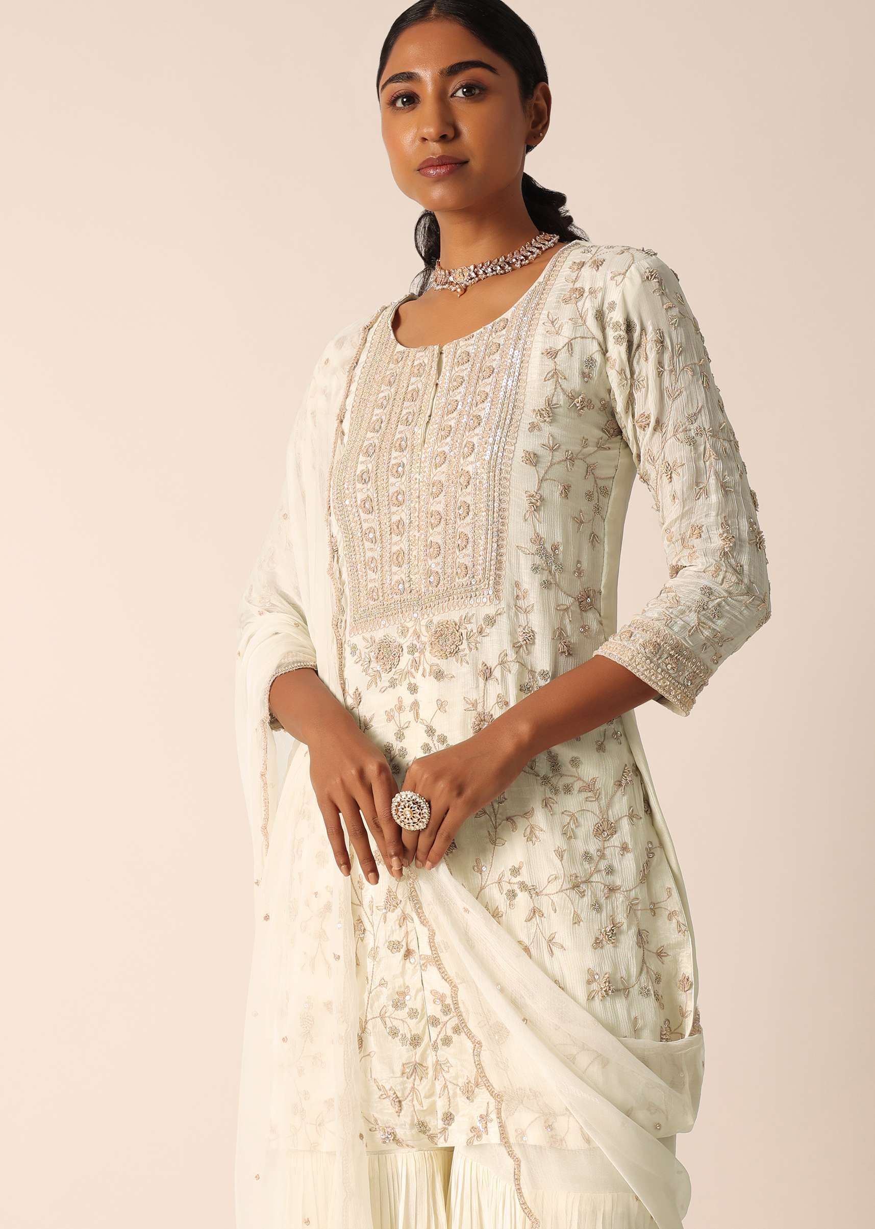 Adding grace and charm to any festive occasion is this beautiful kurta sharara set. Set on a serene white base, it is fabricated from flowy chiffon fabric. Adorned with all-over... More Product Details
